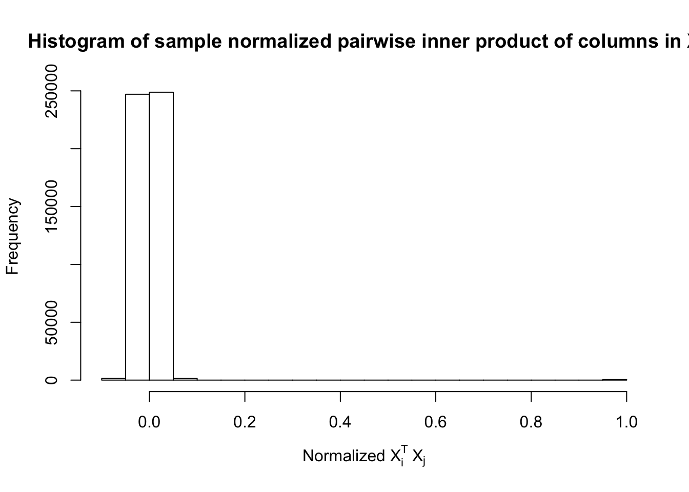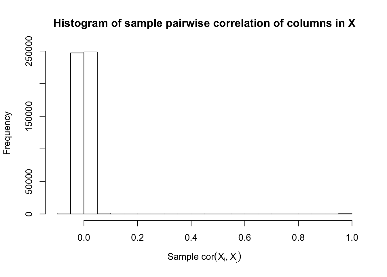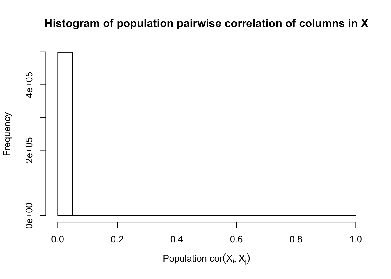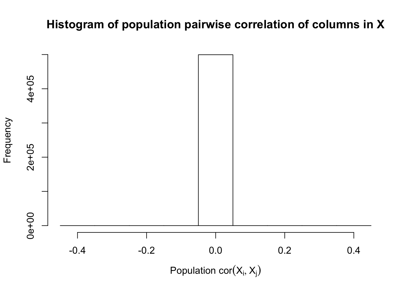 \[ \begin{array}{c} X_{ij} \sim N\left(0, \left(\frac{1}{\sqrt n}\right)^2\right) \\ cor(X_{i1}, X_{i2}) = cor(X_{i3}, X_{i4}) = \cdots = cor(X_{i(p-1)}, X_{ip}) = \rho = 0.99 \end{array} \]