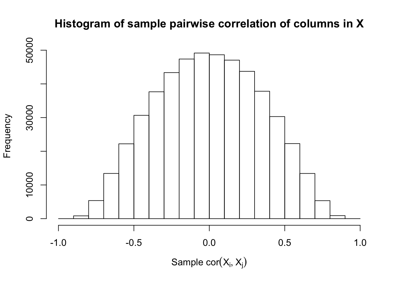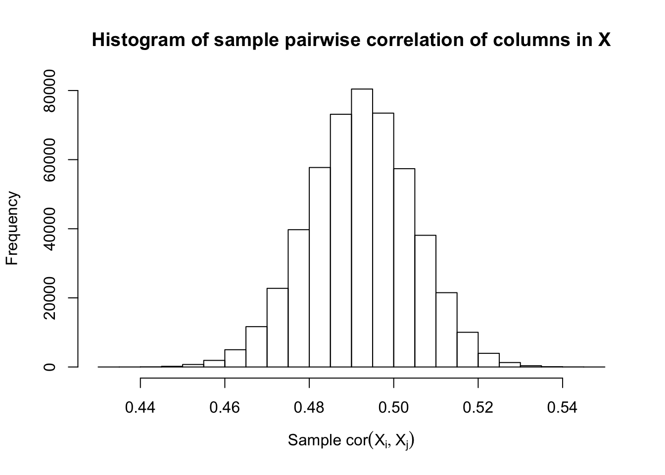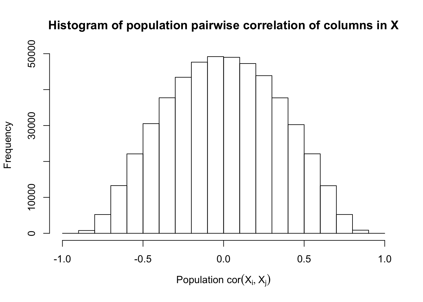 \[ \begin{array}{c} \text{each row }X_{i}^T \sim N\left(0, \frac{1}n\Sigma_{p}\right) \\ \Sigma_p = \texttt{cov2cor}(B_{p \times d}B_{d\times p}^T + I)\\ B_{ij} \overset{iid}{\sim} N(0, 1) \end{array} \]