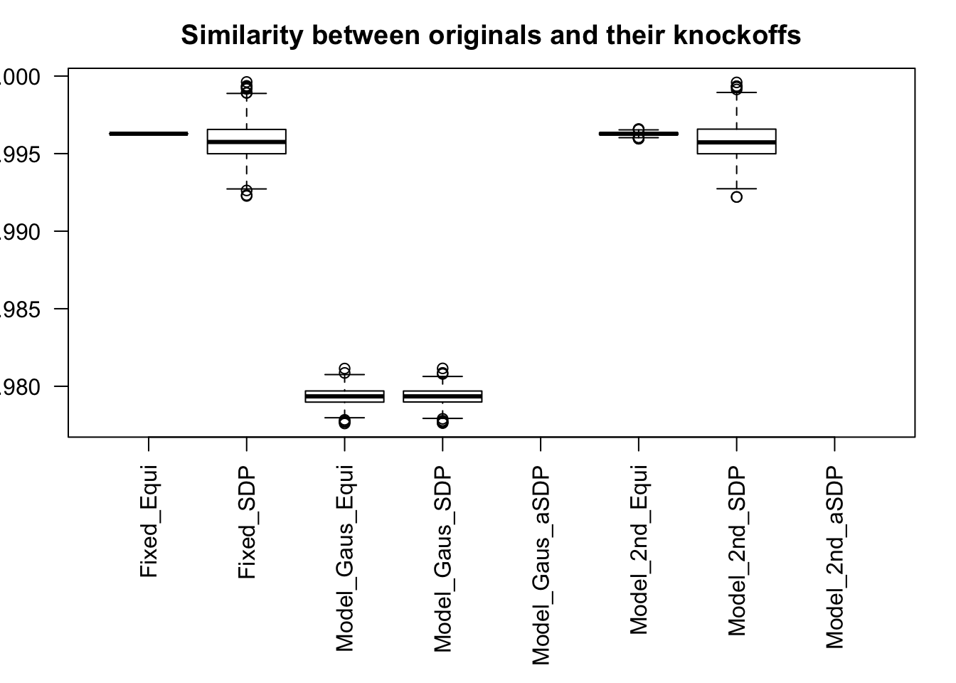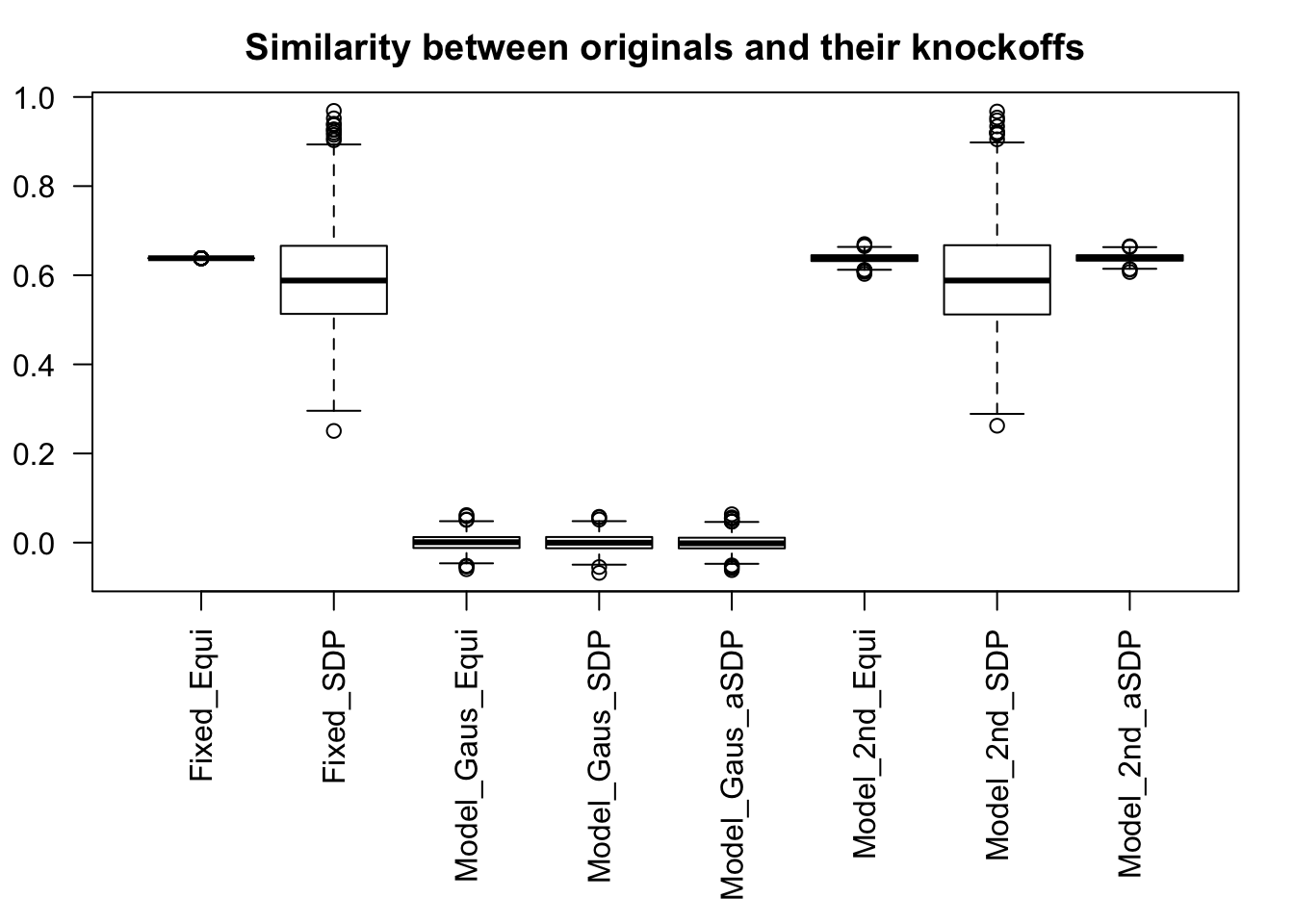 The idea in Knockoff is to generate knockoff variables \(\tilde X\) which 1) keep the relationship of original variables \(X\) 2) are unlike the original variables 3) are null.