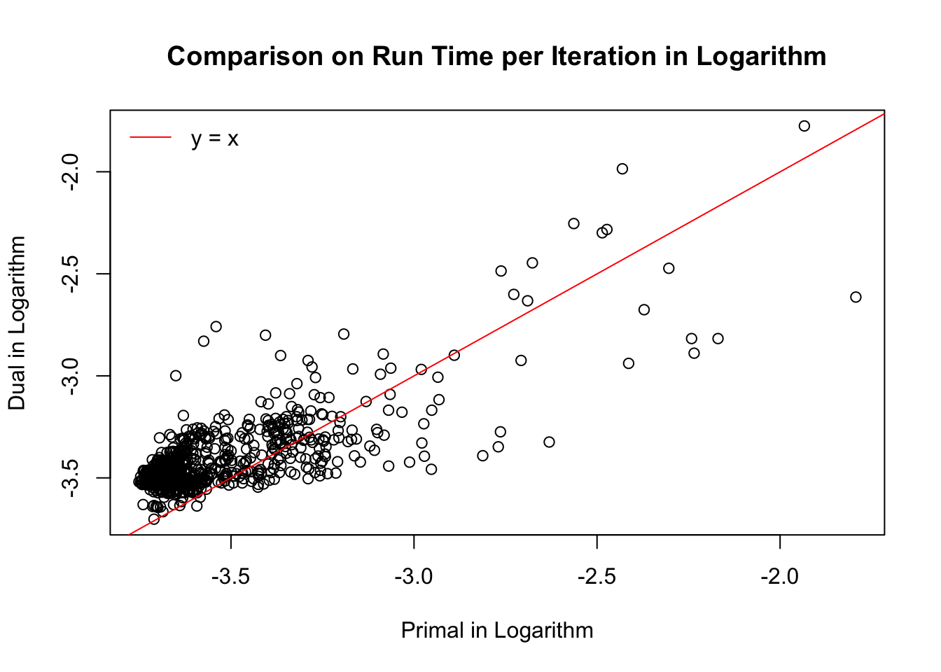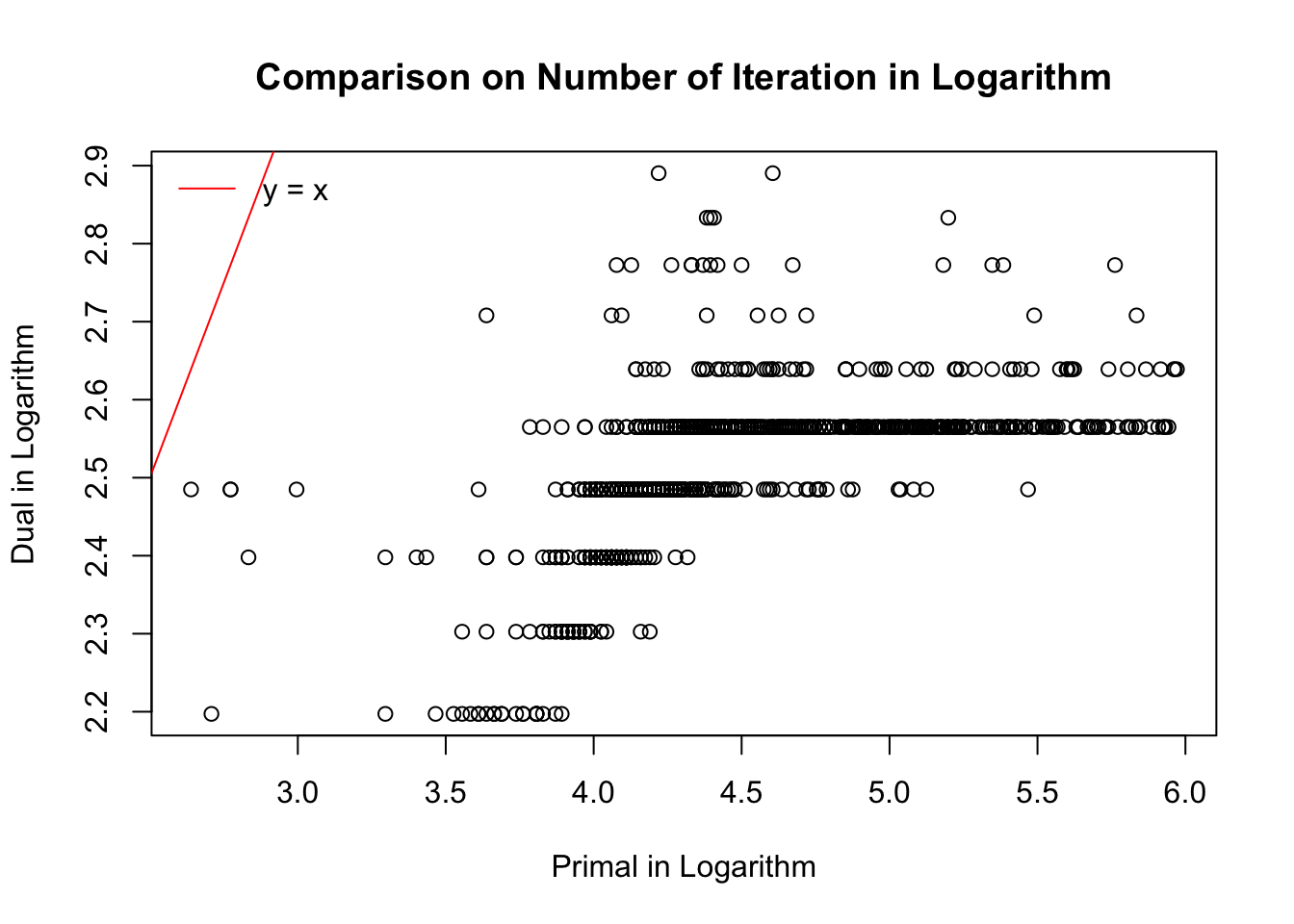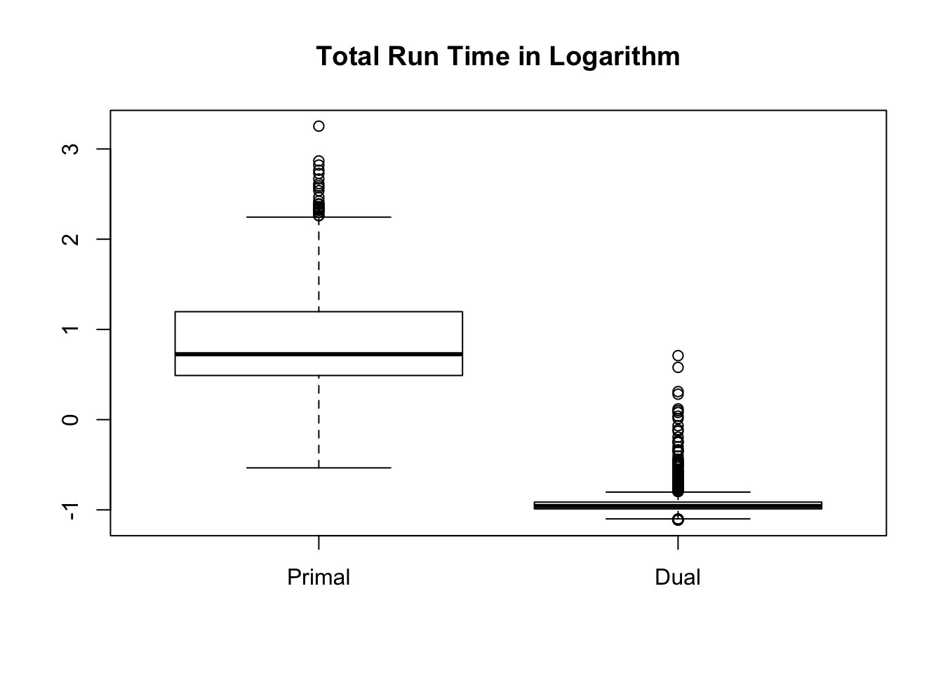 In the following comparisons, we only compare the results when both primal and dual reach the optimal. Worthnoting is that out of \(1000\) runs, the dual reaches optimal in all of them, whereas the primal doesn’t in 61 of them, or \(6.1\%\).