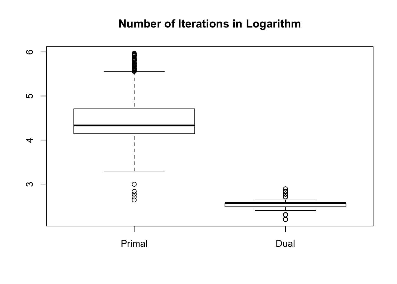 Let \(n = 10^4\), \(m = 10\), so that indeed \(n \gg m\). We run \(1000\) simulation trials. In each trial we feed the primal and the dual with the same \(A\) and \(a\). \(A\) and \(a\) are generated so that both the primal and dual problems are feasible at least in theory. Now we are comparing accuracy, time cost, and numbers of iterations of the two forms.