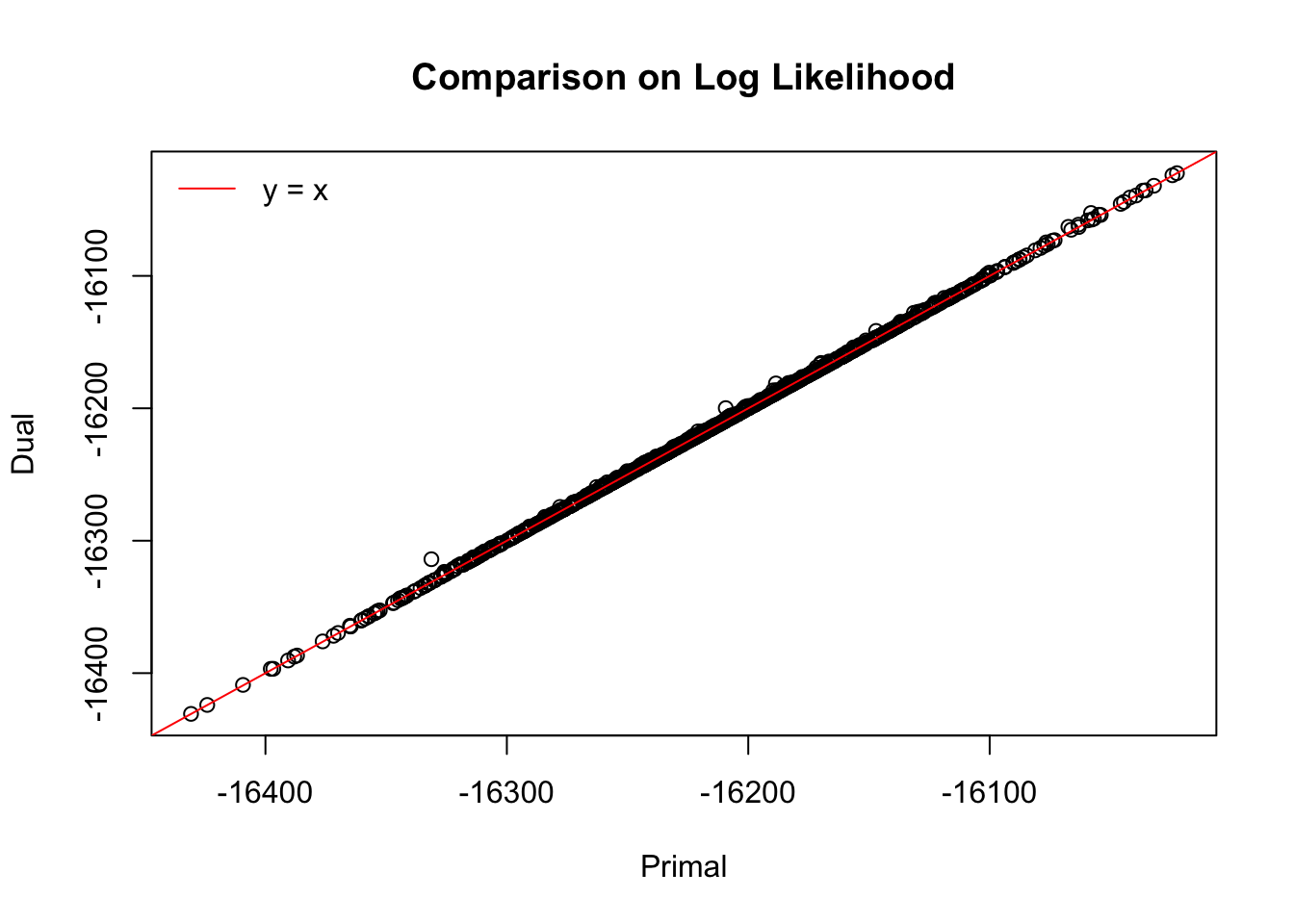 It appears the dual form also gives better results in the sense that the log-likelihood given by dual is larger than the log-likelihood given by primal, when both reach the optimal. For both forms, the log-likelihood is given by \(\sum\log\left(Af + a\right) = \sum\log\left(g\right)\).