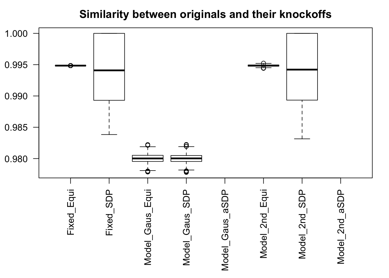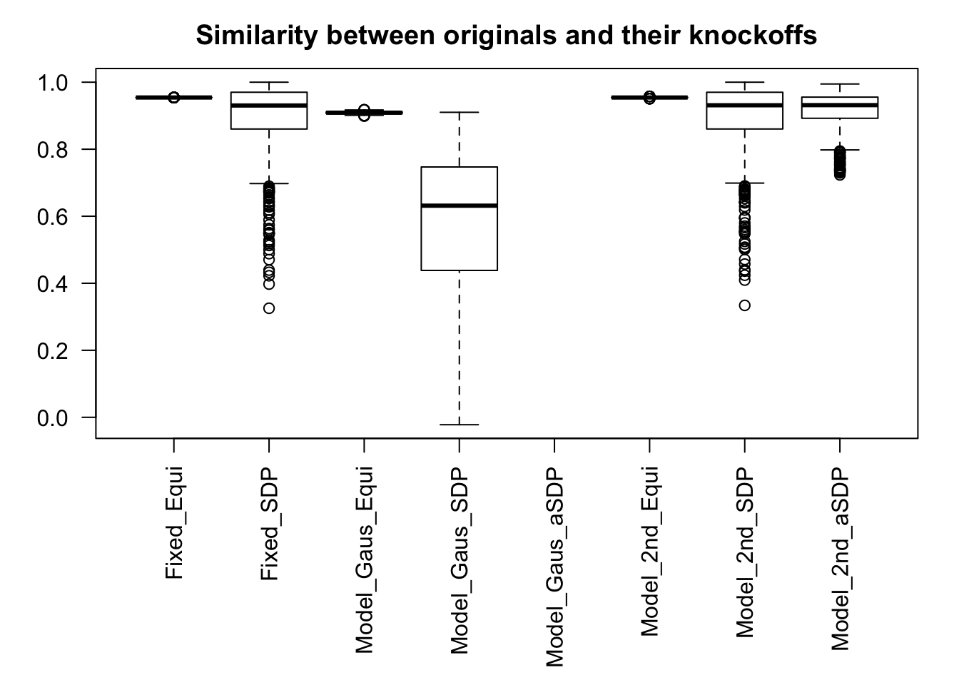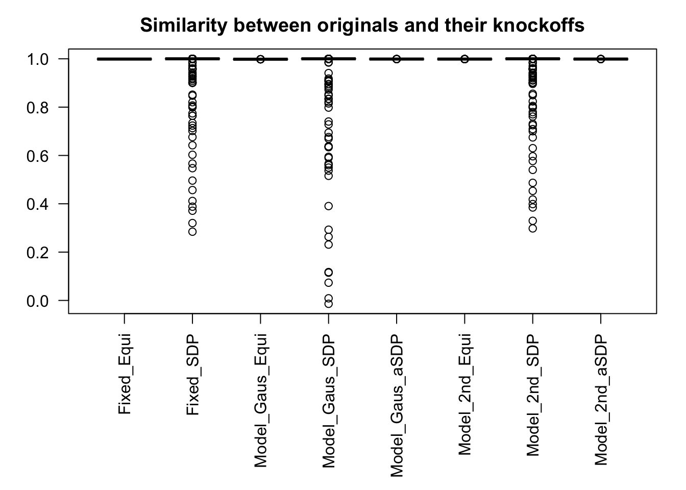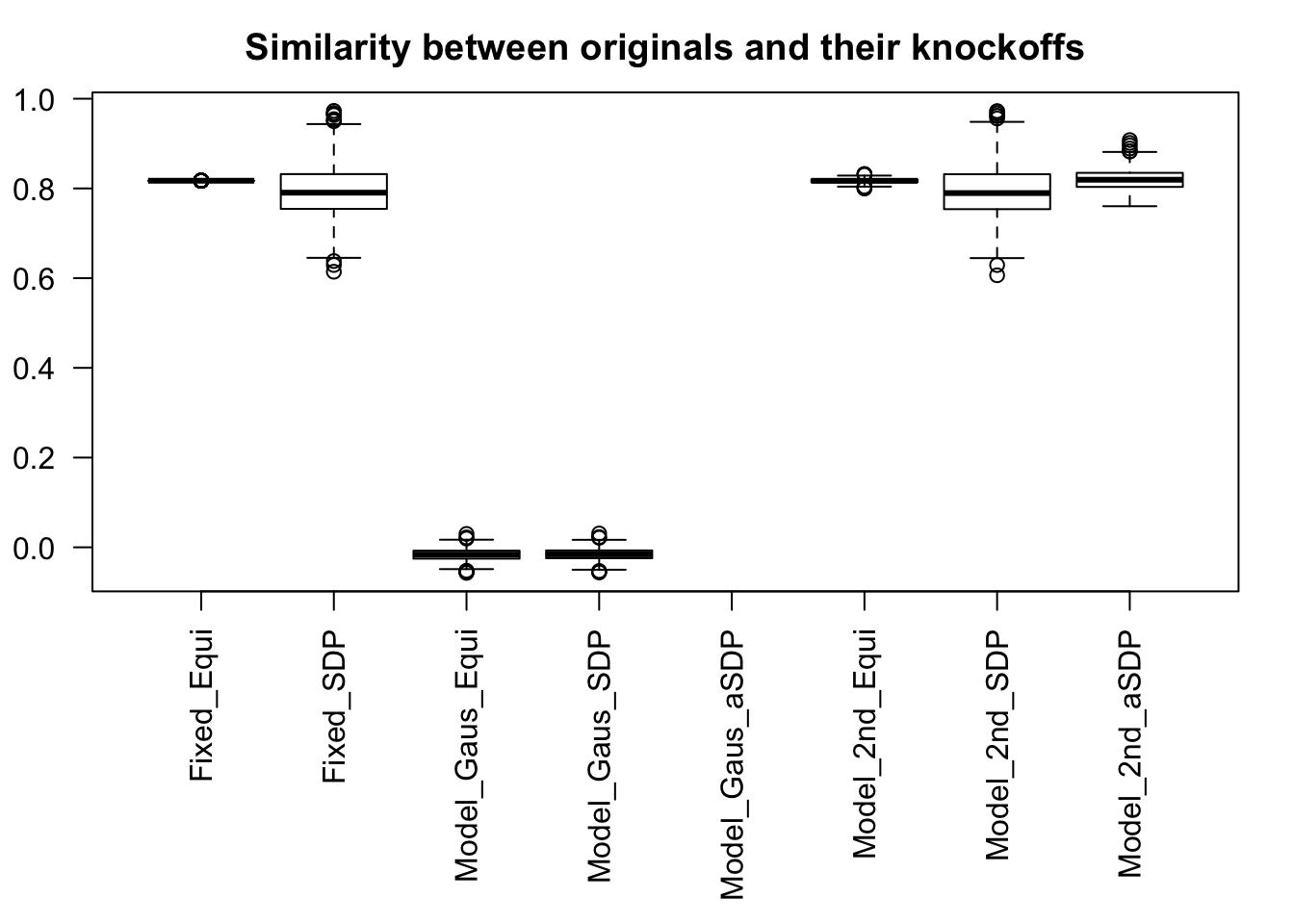 The idea in Knockoff is to generate knockoff variables \(\tilde X\) which 1) keep the relationship of original variables \(X\) 2) are unlike the original variables 3) are null.