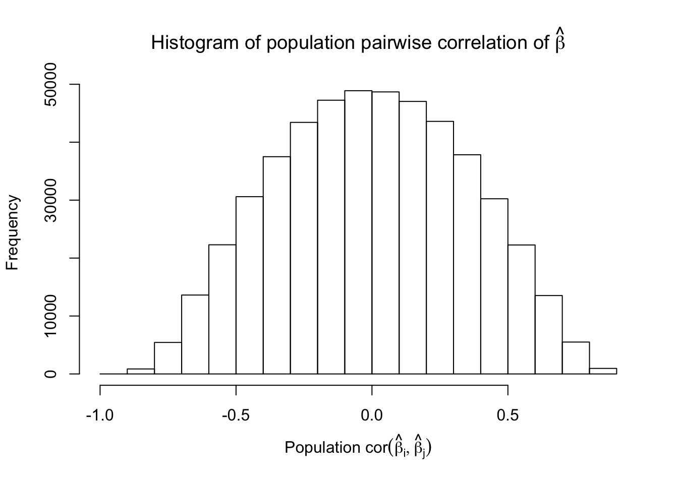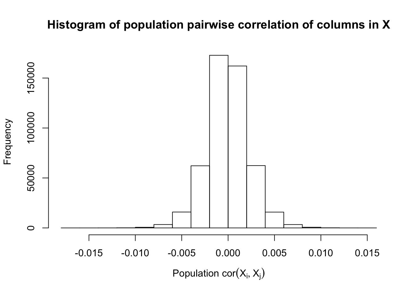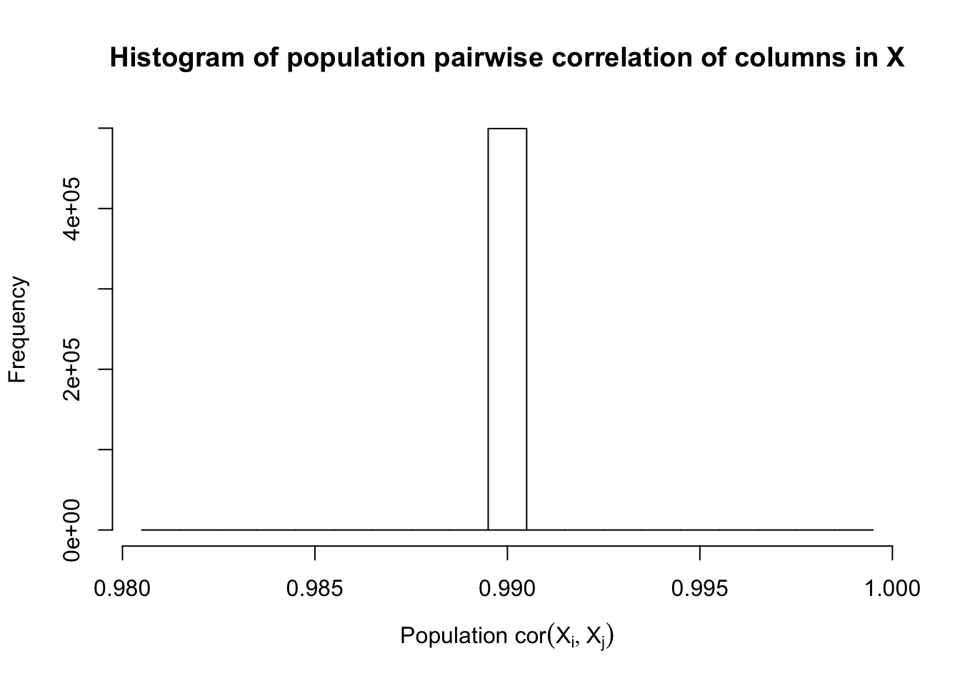\[ \begin{array}{c} X_{ij} \sim N\left(0, \left(\frac{1}{\sqrt n}\right)^2\right) \\ cor(X_{i1}, X_{i2}) = cor(X_{i3}, X_{i4}) = \cdots = cor(X_{i(p-1)}, X_{ip}) = \rho = 0.99 \end{array} \]