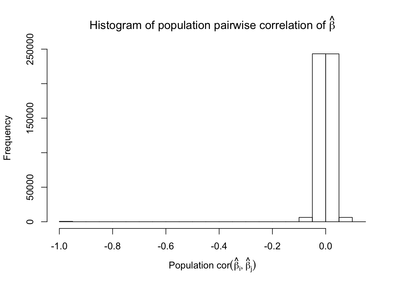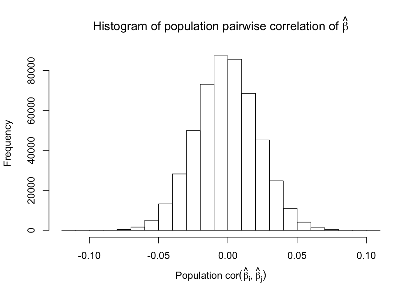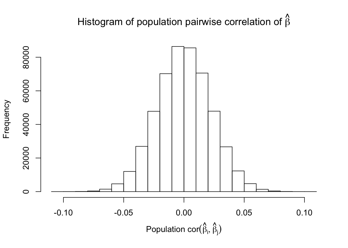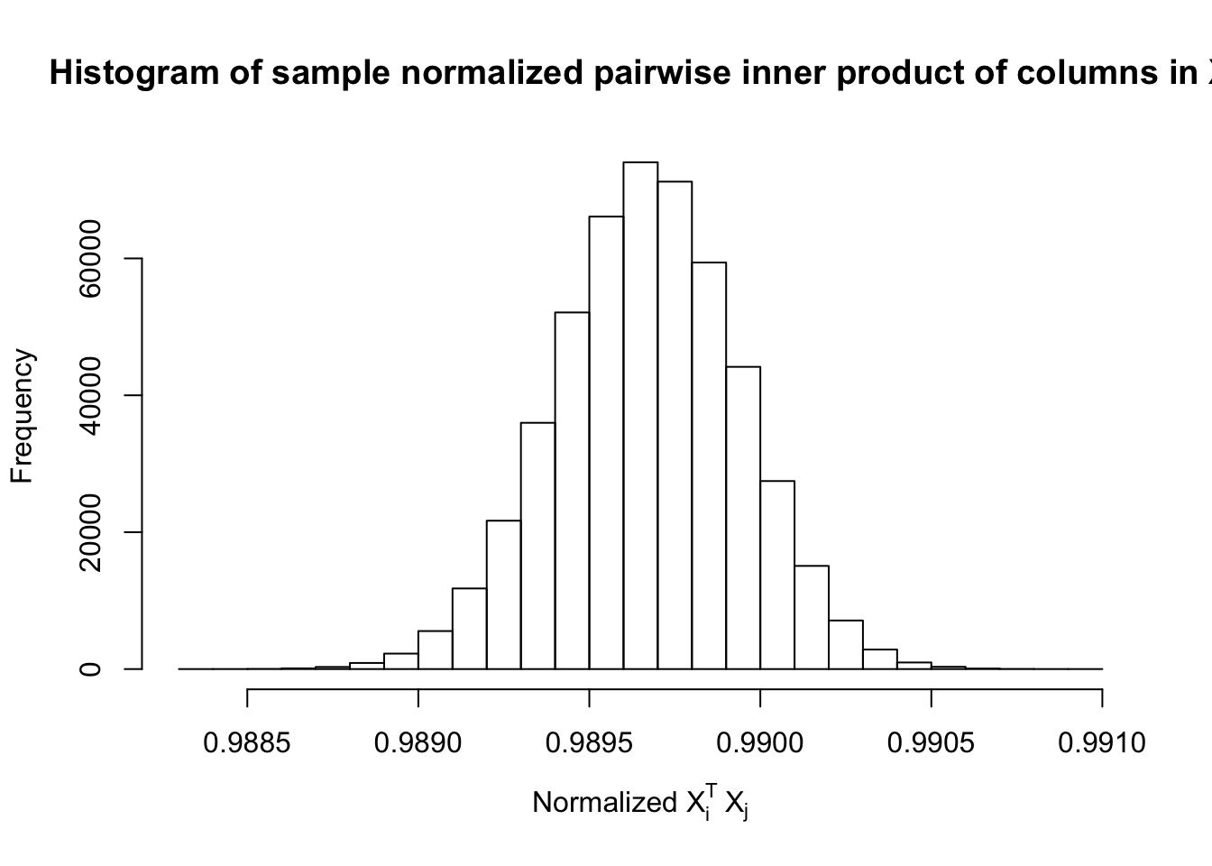 \[ \begin{array}{c} X_{ij} \sim N\left(0, \left(\frac{1}{\sqrt n}\right)^2\right) \\ cor(X_{i1}, X_{i2}) = cor(X_{i3}, X_{i4}) = \cdots = cor(X_{i(p-1)}, X_{ip}) = \rho = 0.99 \end{array} \]