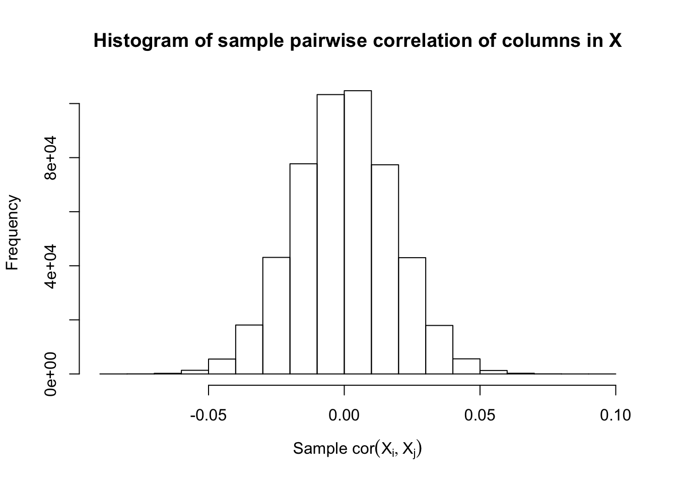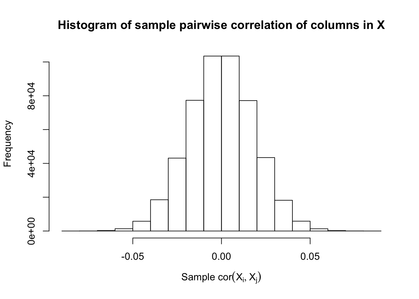 \[ \begin{array}{c} \text{each row }X_{i}^T \sim N\left(0, \frac{1}n\Sigma_{p}\right) \\ \Sigma_p = \texttt{cov2cor}(B_{p \times d}B_{d\times p}^T + I)\\ B_{ij} \overset{iid}{\sim} N(0, 1) \end{array} \]