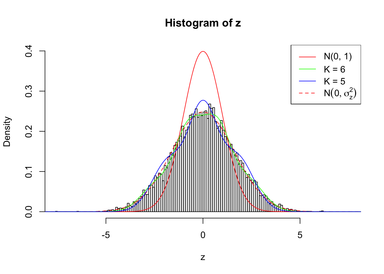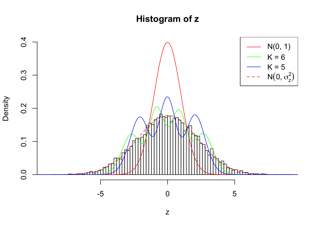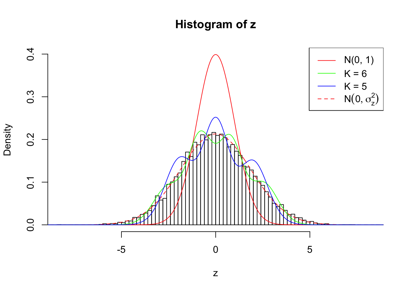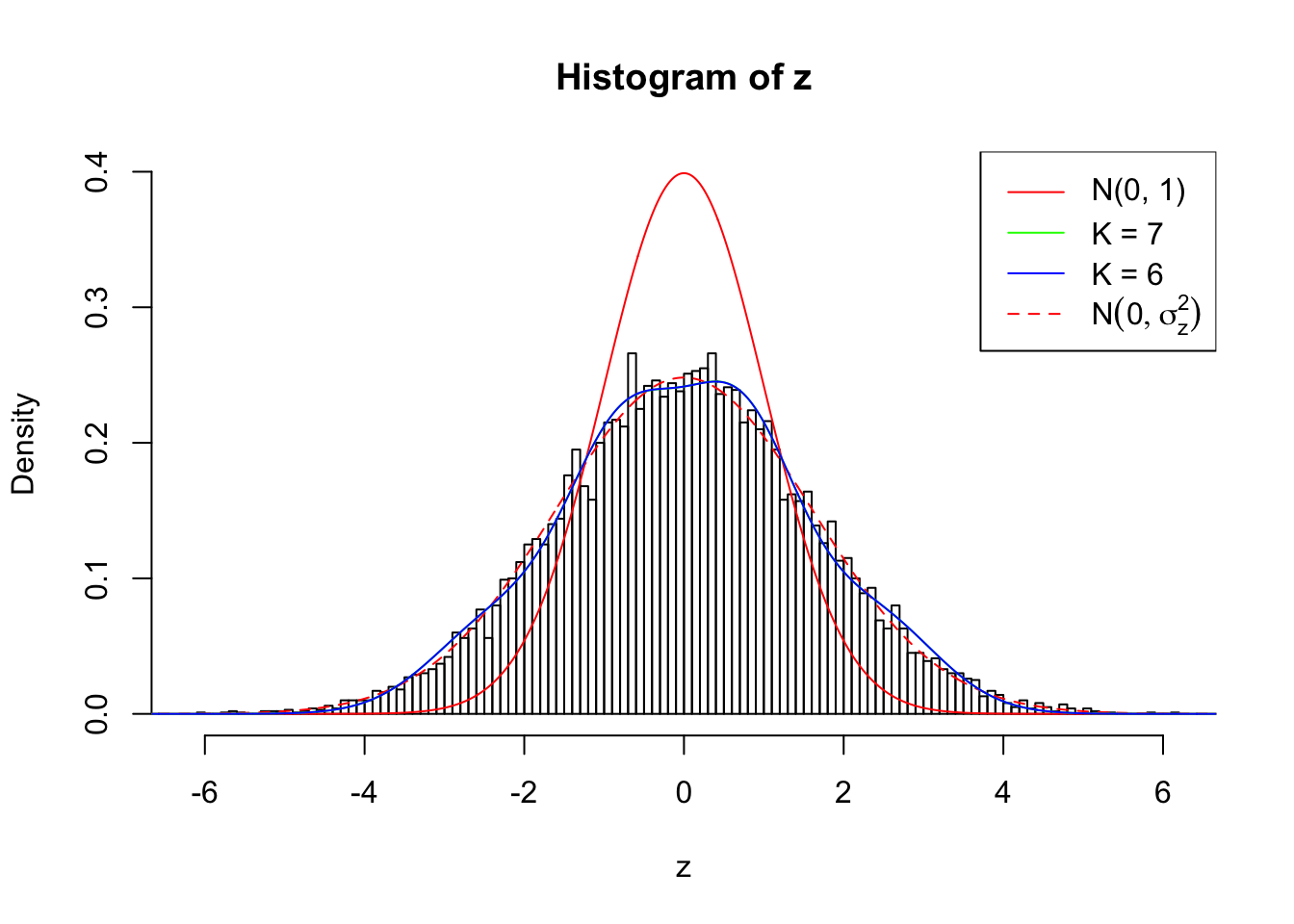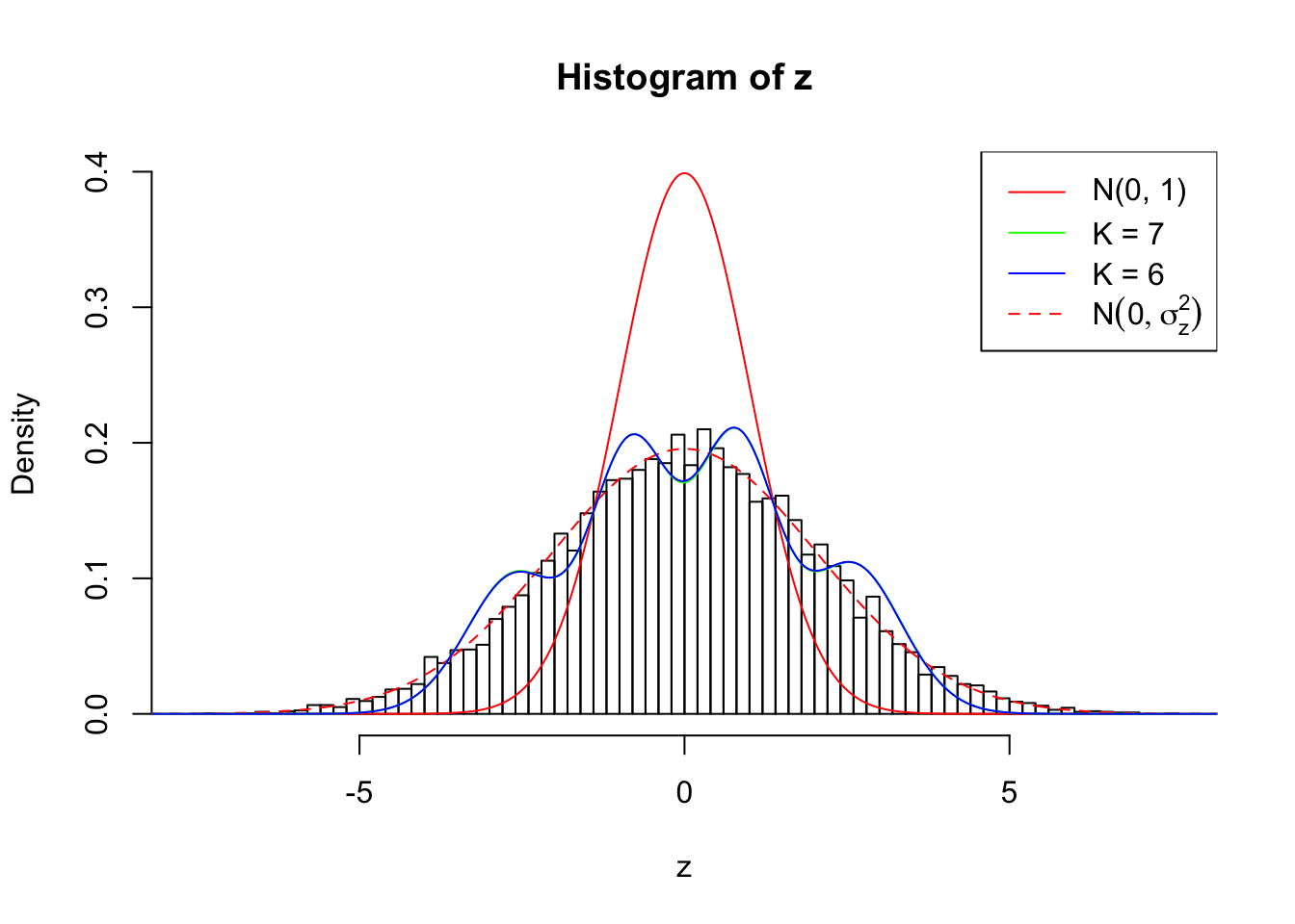 Log-likelihood Ratio between True Distribution N ( 0, 2.258925 ) and Fitted Gaussian Derivatives with K = 6 : 23.89227 ;