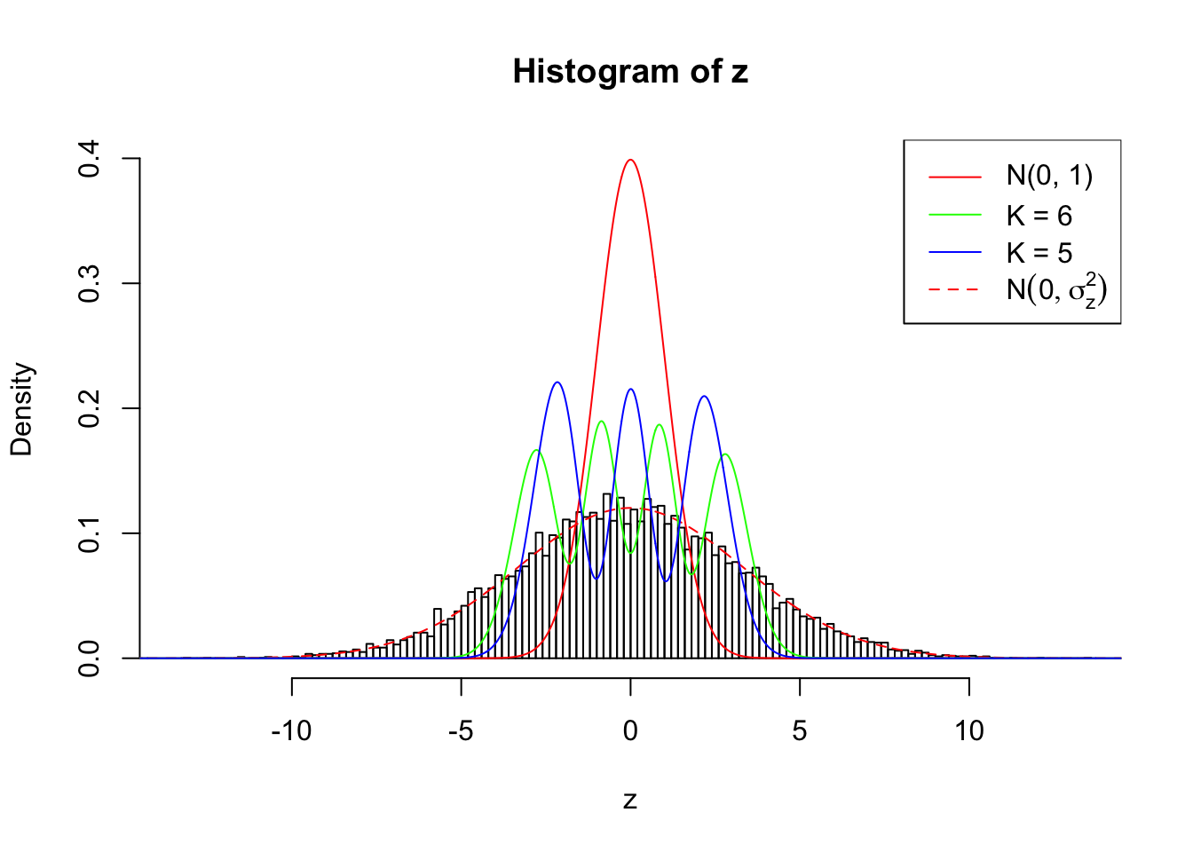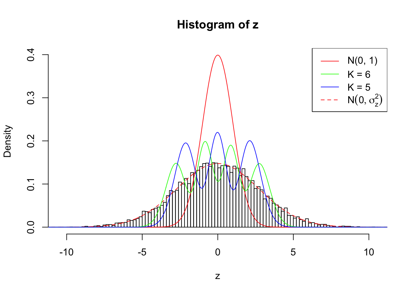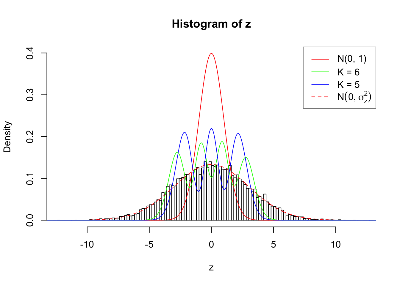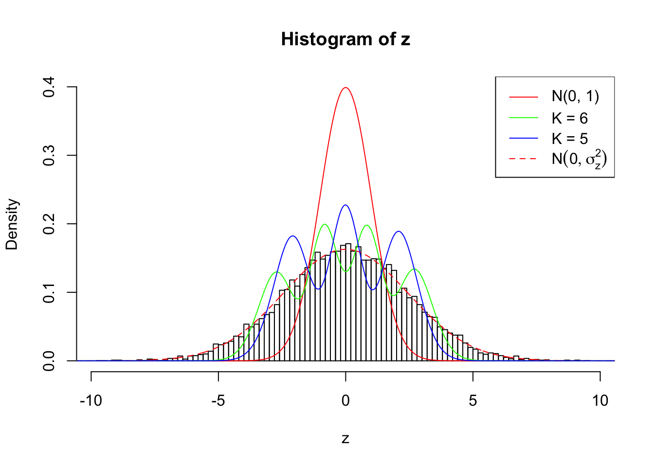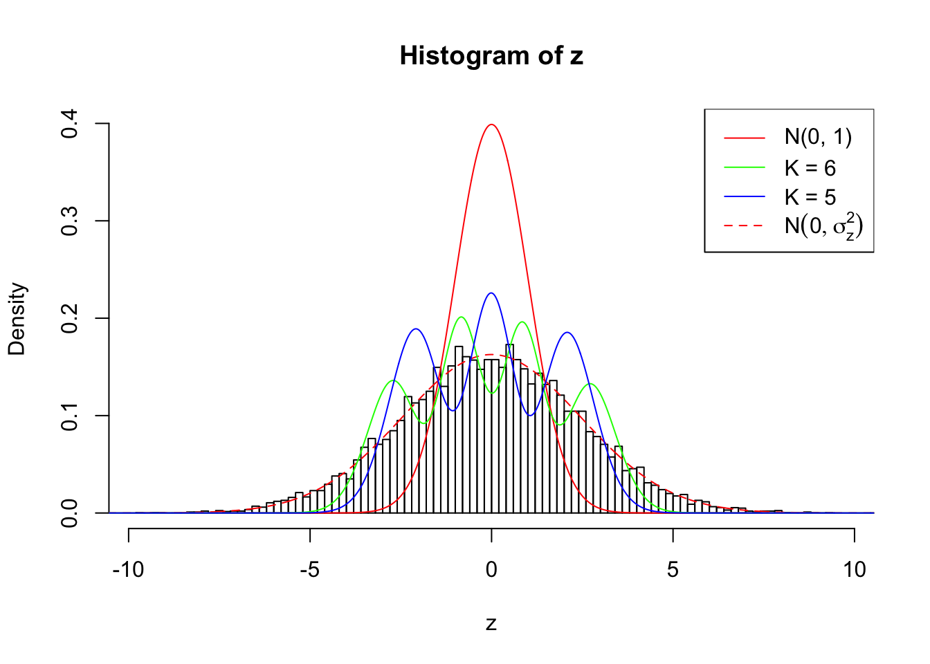 Log-likelihood Ratio between True Distribution N ( 0, 2.258925 ) and Fitted Gaussian Derivatives with K = 6 : 23.89227 ;