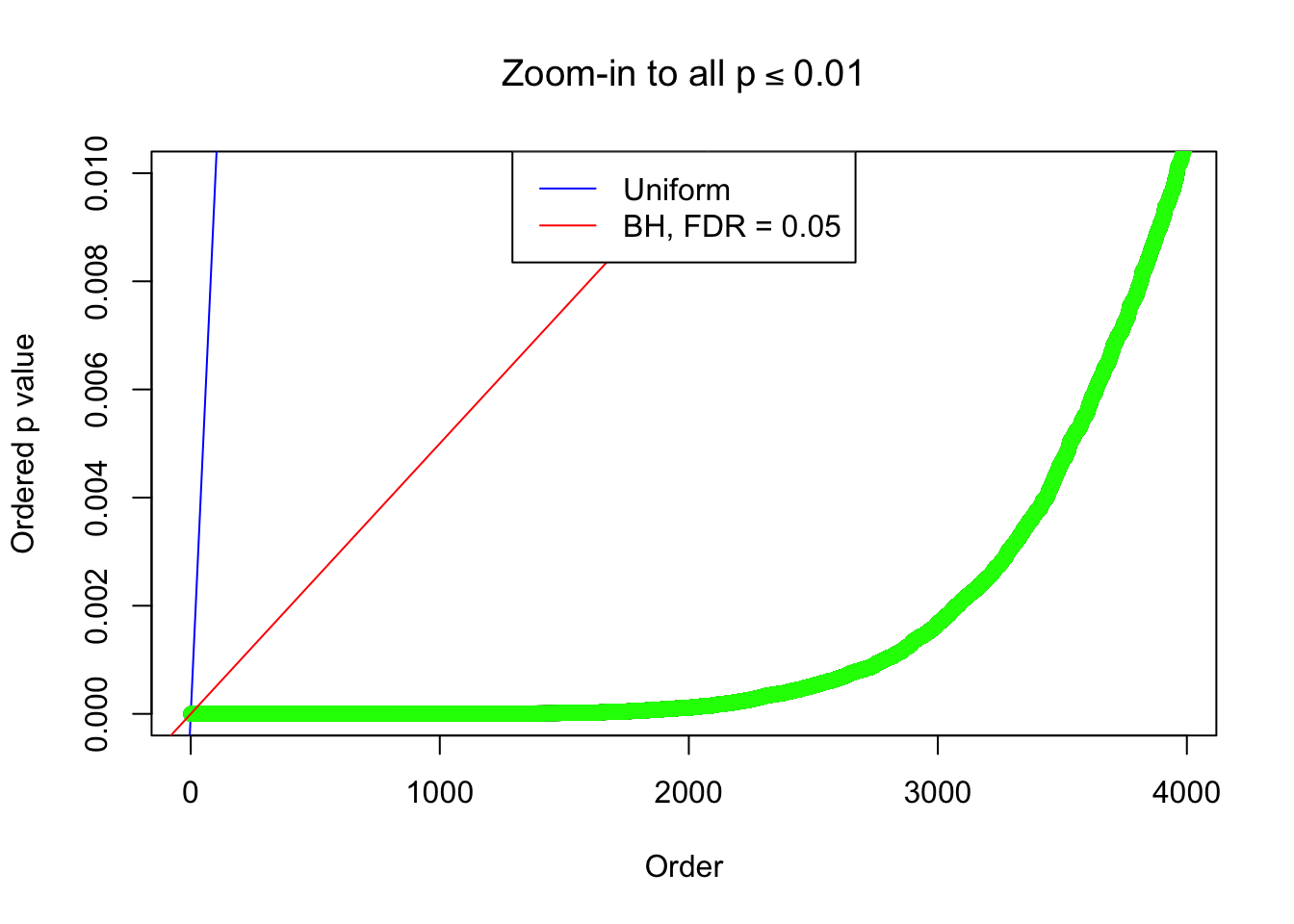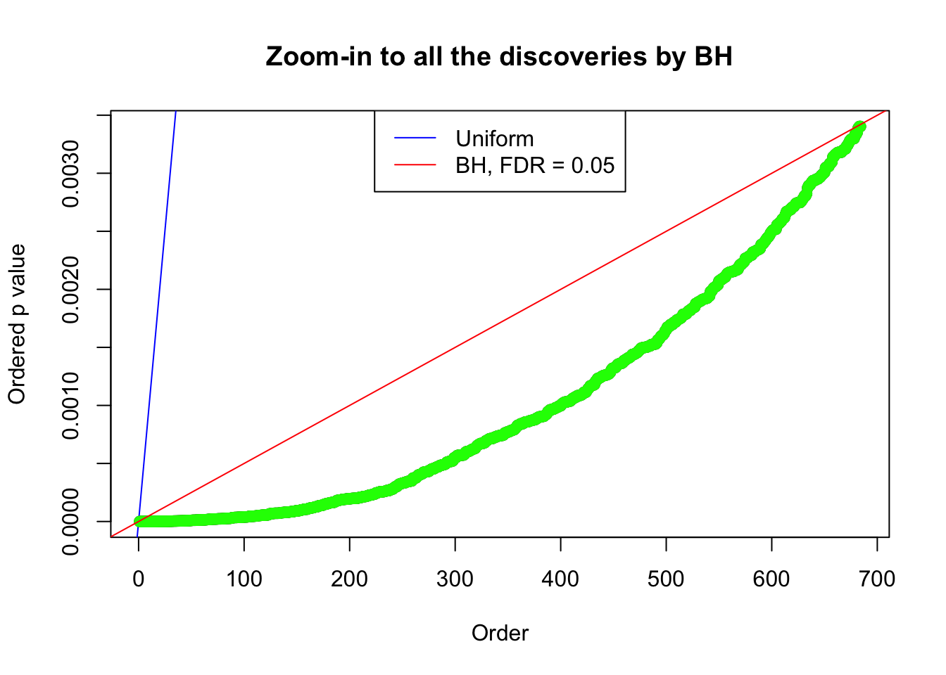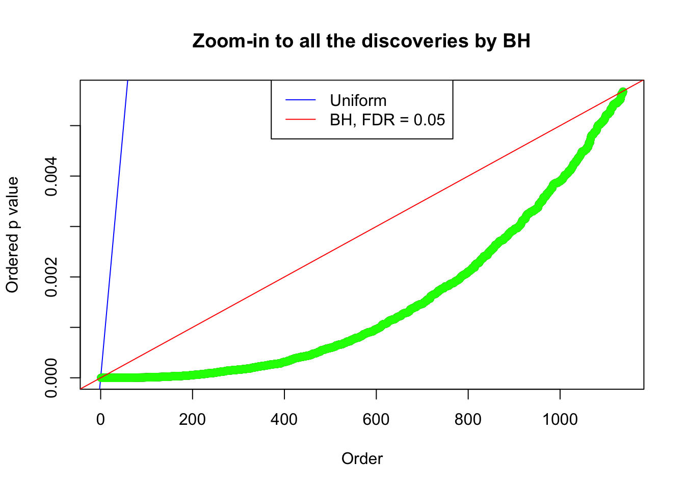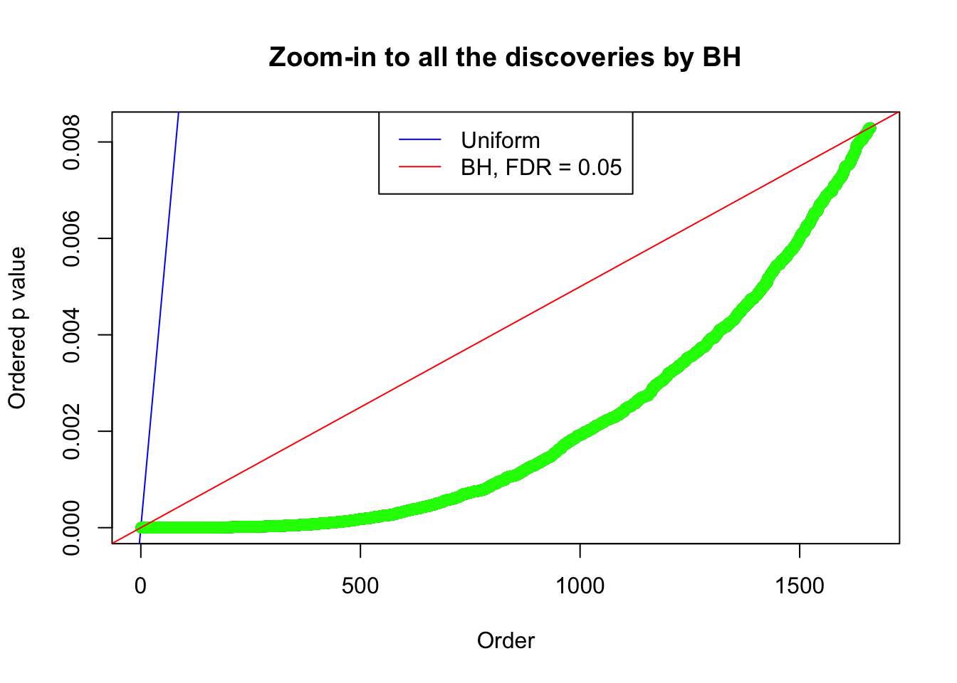 By the way, BH procedure seems very sensible in this task. It gives a lot of discoveries even when SNR = 1 that are too many to be credibly seen as from correlated null. Even SNR = 0 case, BH arguably gives more than expected discoveries, which indicates it’s more likely to be true effects rather than correlation.