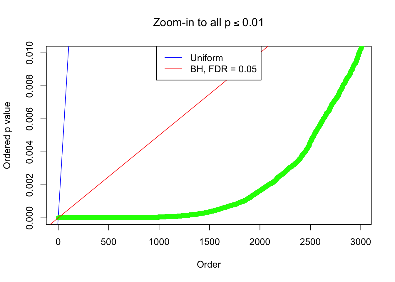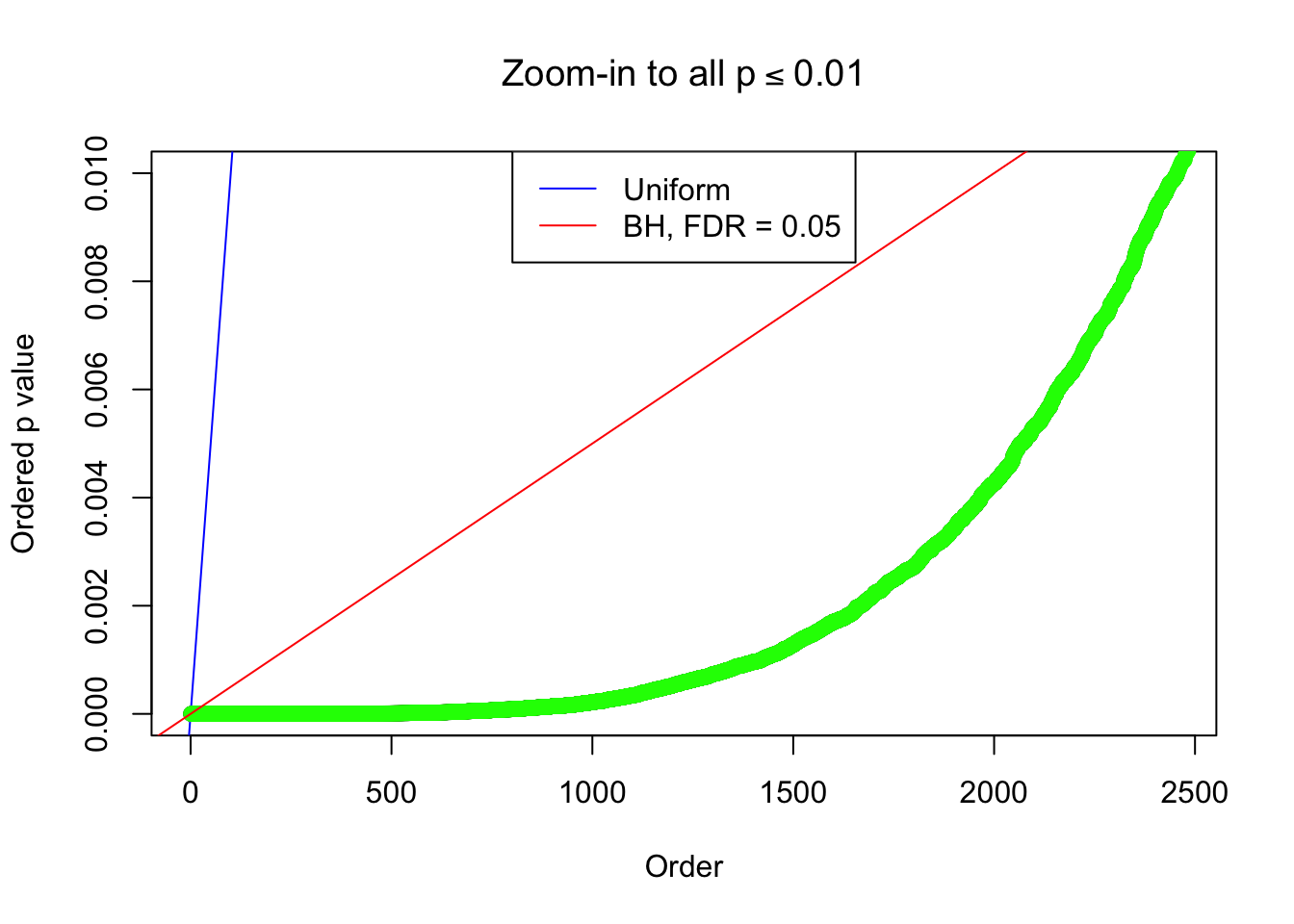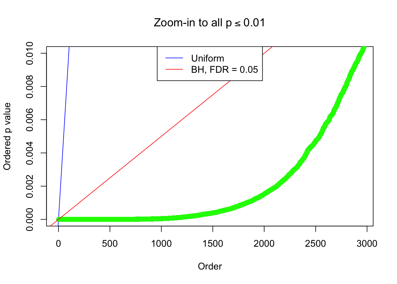 By the way, BH procedure seems very sensible in this task. It gives a lot of discoveries even when SNR = 1 that are too many to be credibly seen as from correlated null. Even SNR = 0 case, BH arguably gives more than expected discoveries, which indicates it’s more likely to be true effects rather than correlation.