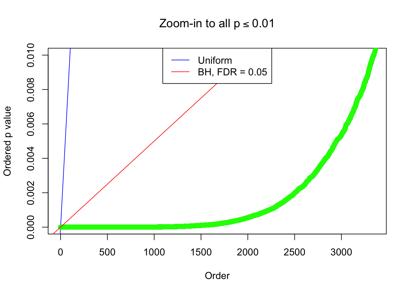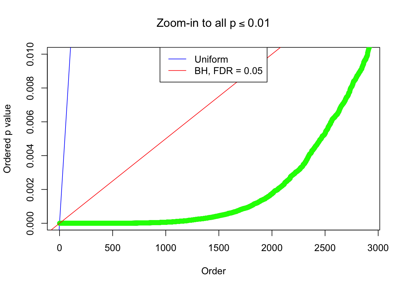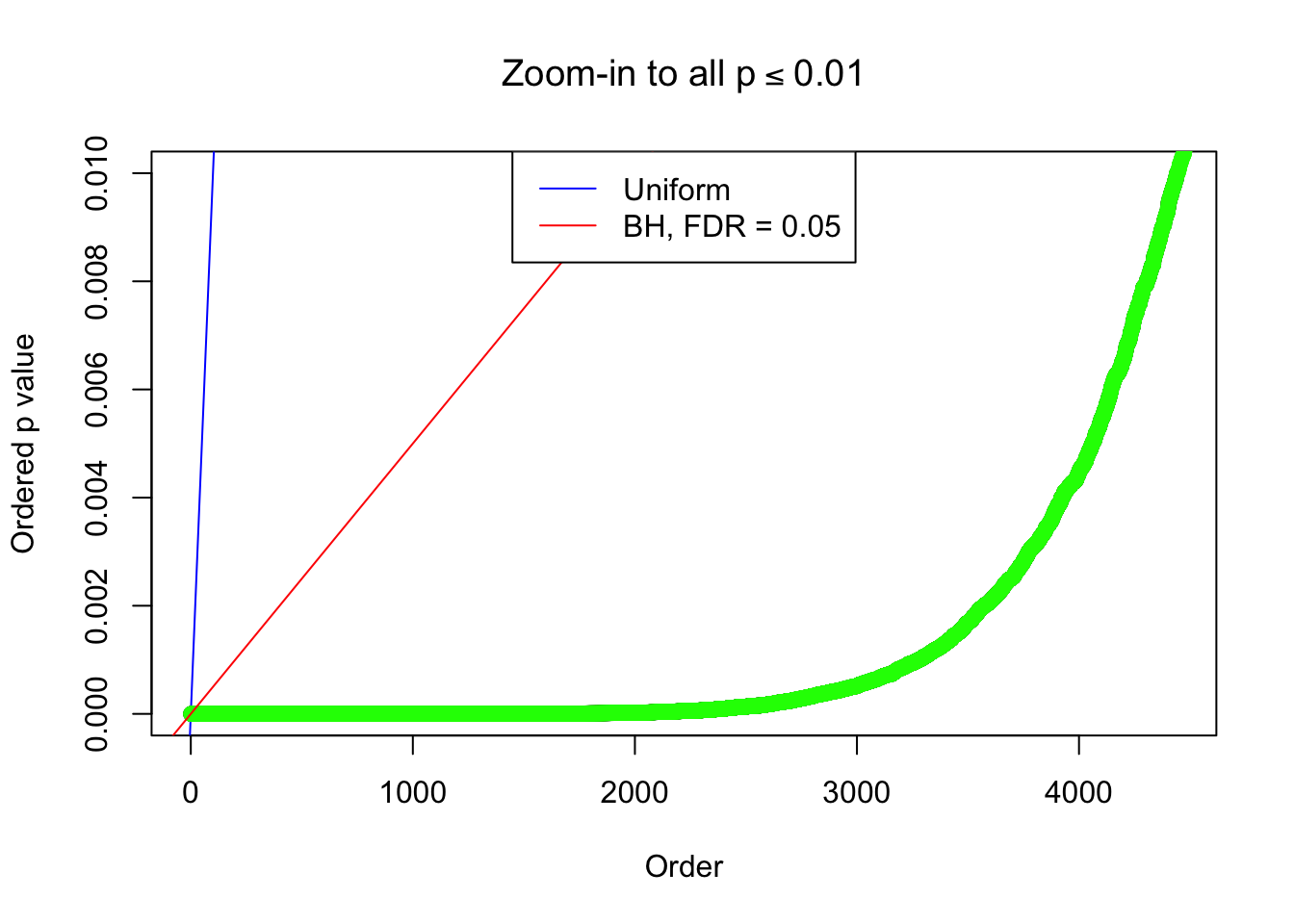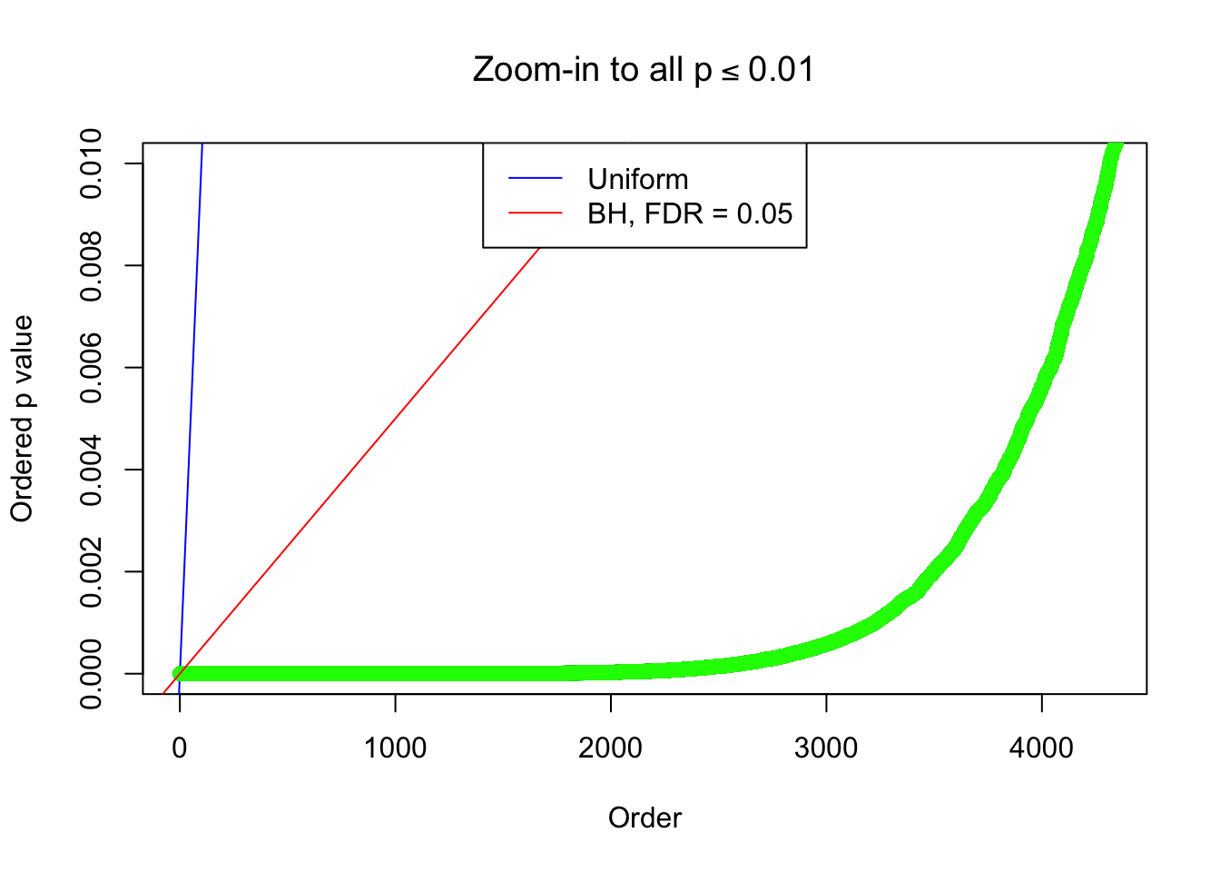 By the way, BH procedure seems very sensible in this task. It gives a lot of discoveries even when SNR = 1 that are too many to be credibly seen as from correlated null. Even SNR = 0 case, BH arguably gives more than expected discoveries, which indicates it’s more likely to be true effects rather than correlation.
