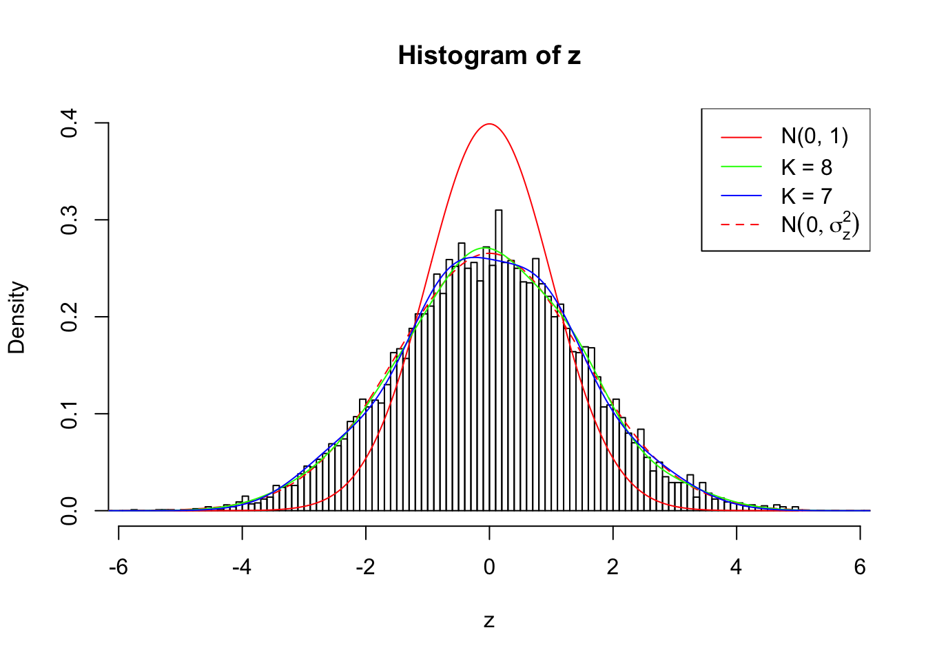 Log-likelihood Ratio between True Distribution N ( 0, 2.258925 ) and Fitted Gaussian Derivatives with K = 8 : 4.720698 ;