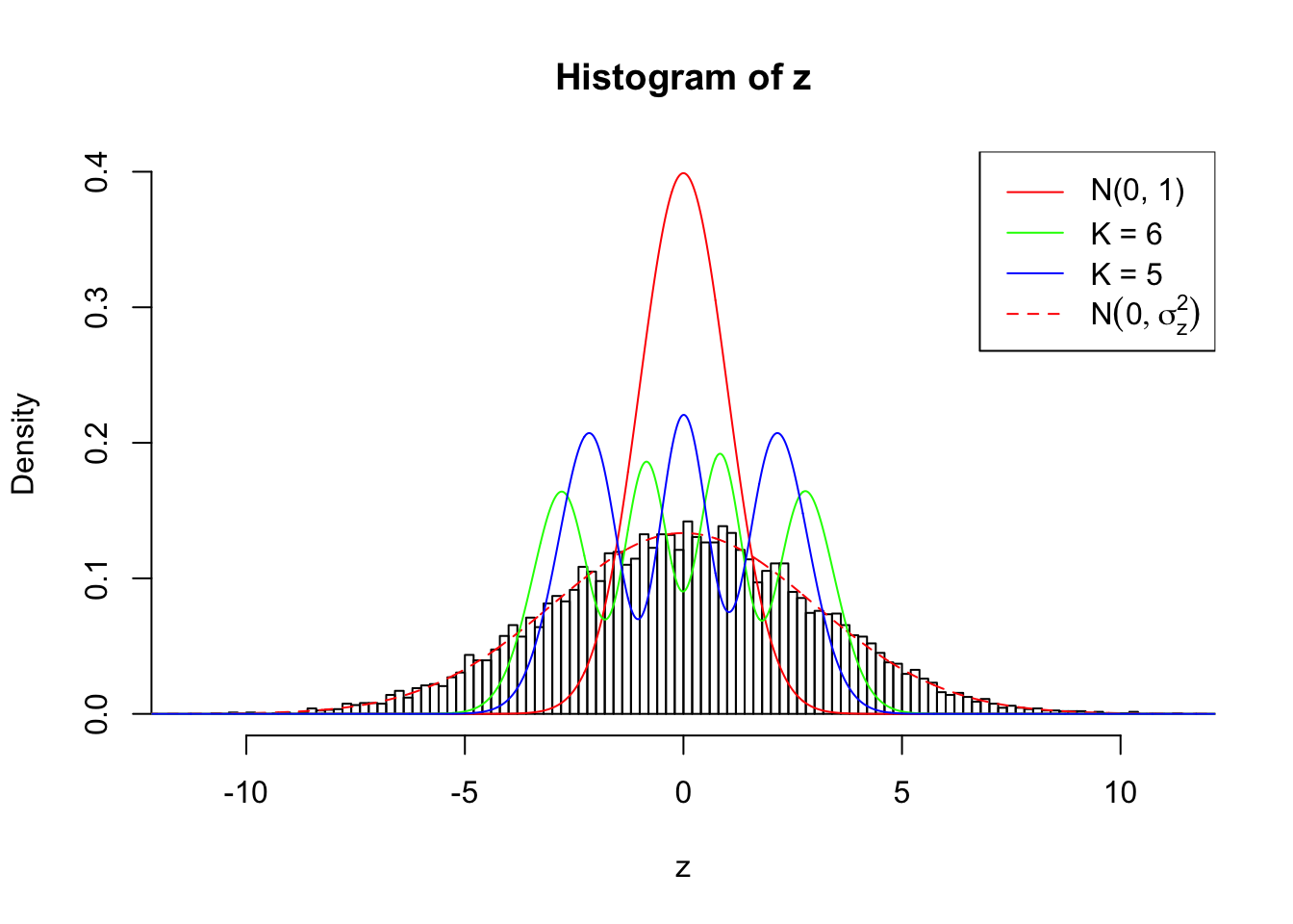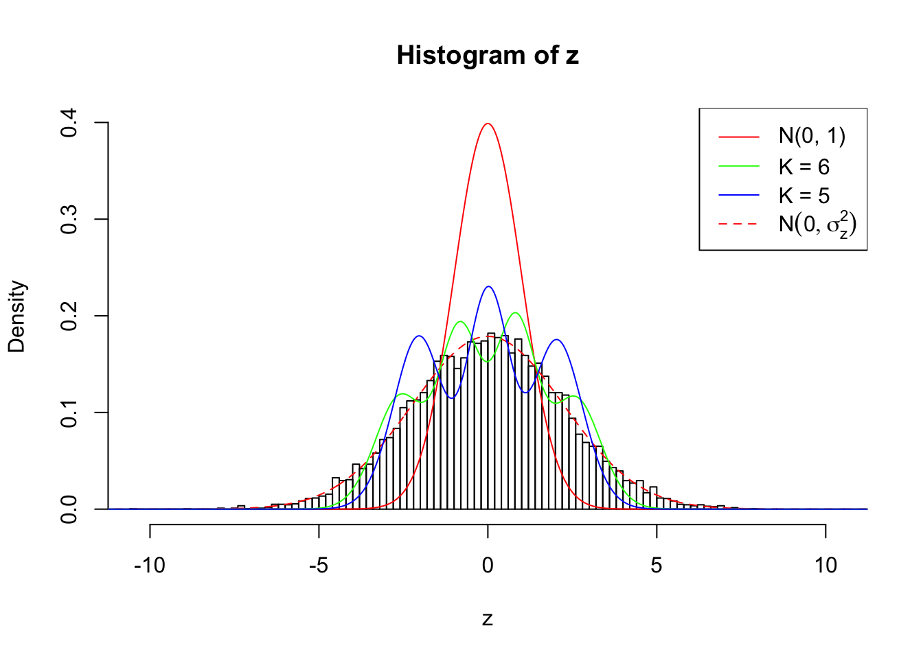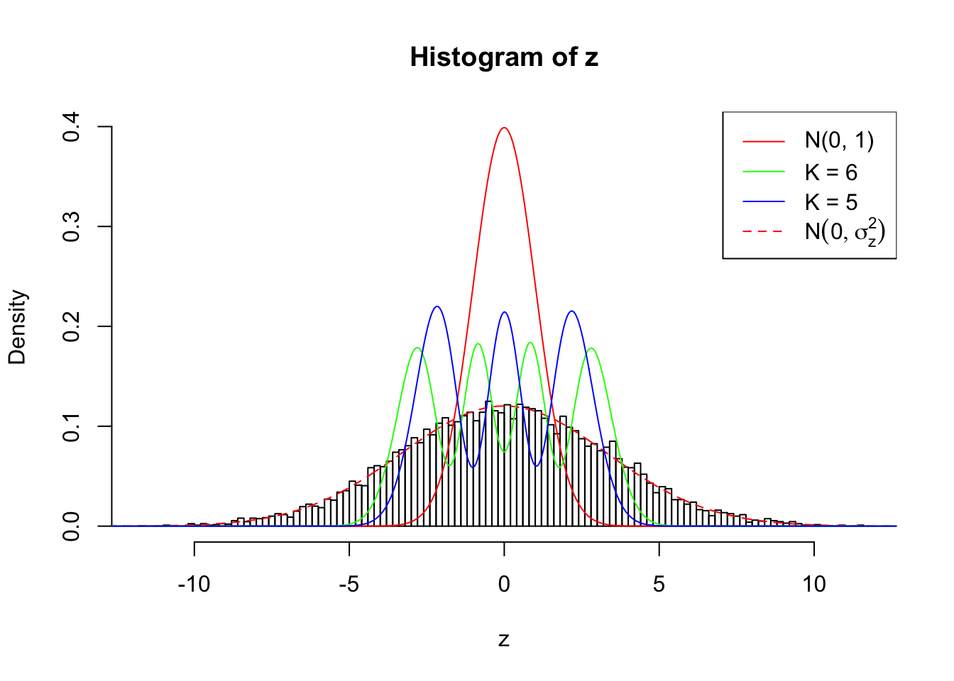 Log-likelihood Ratio between True Distribution N ( 0, 11 ) and Fitted Gaussian Derivatives with K = 6 : 12669.66 ;
