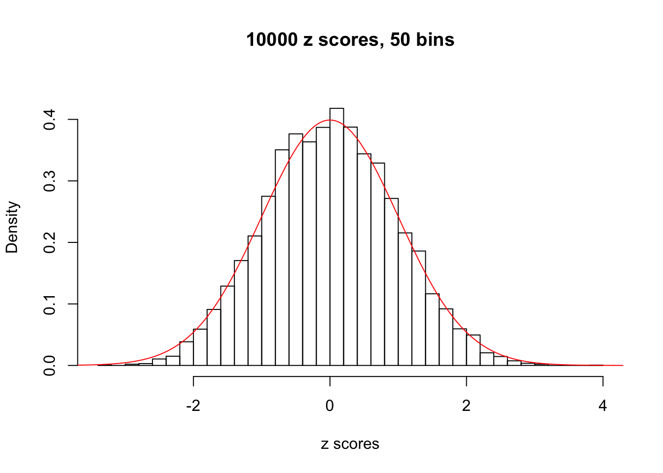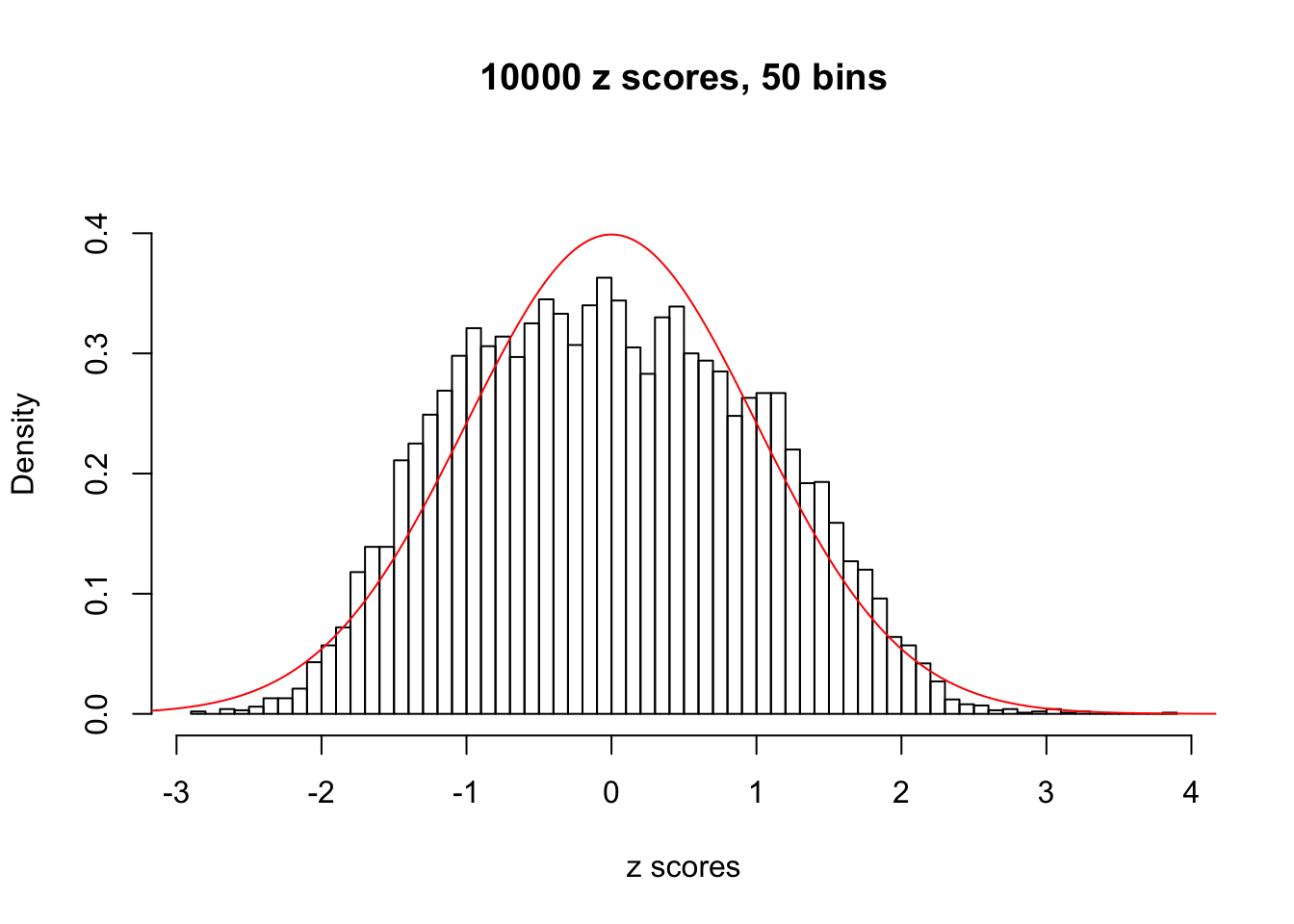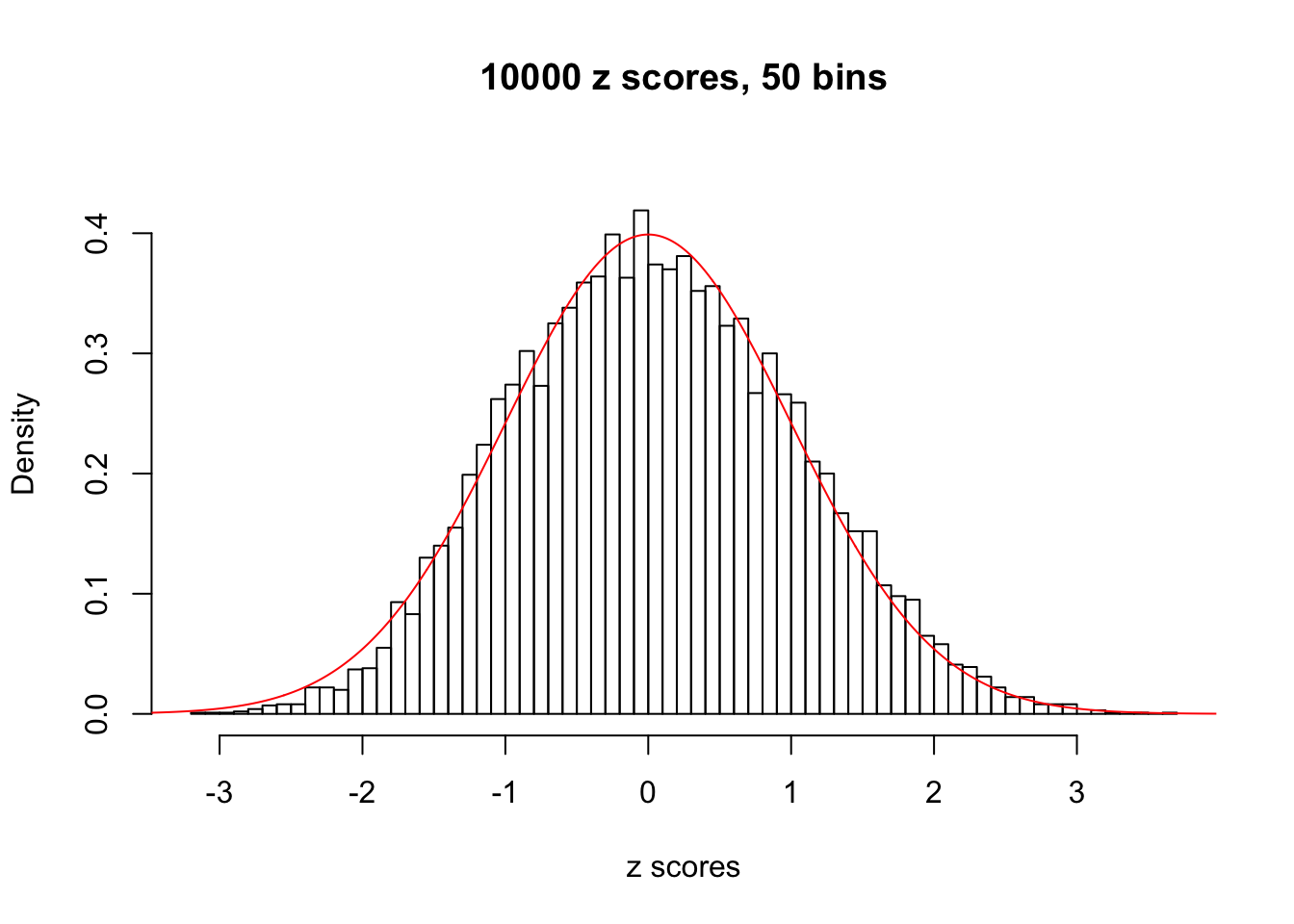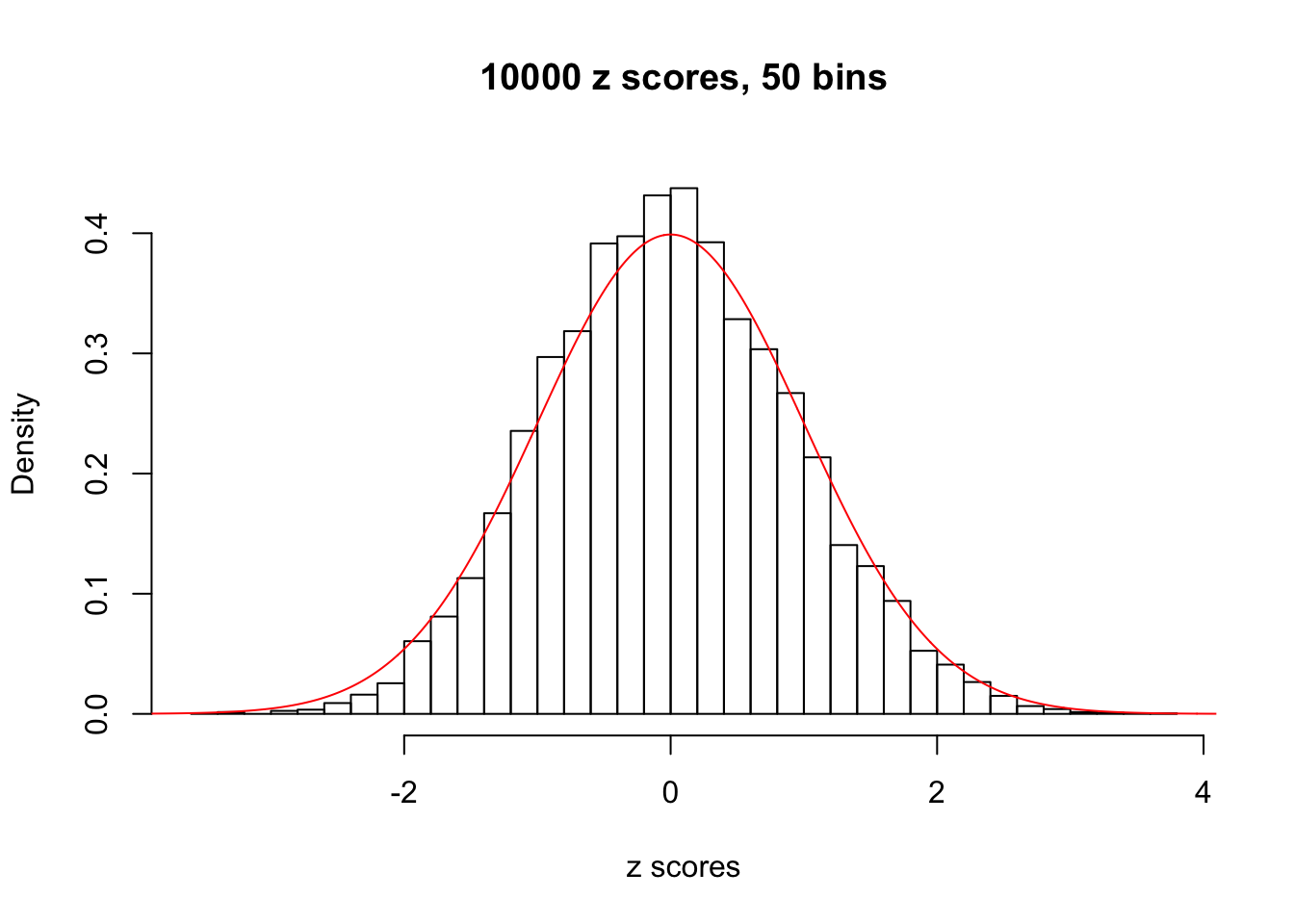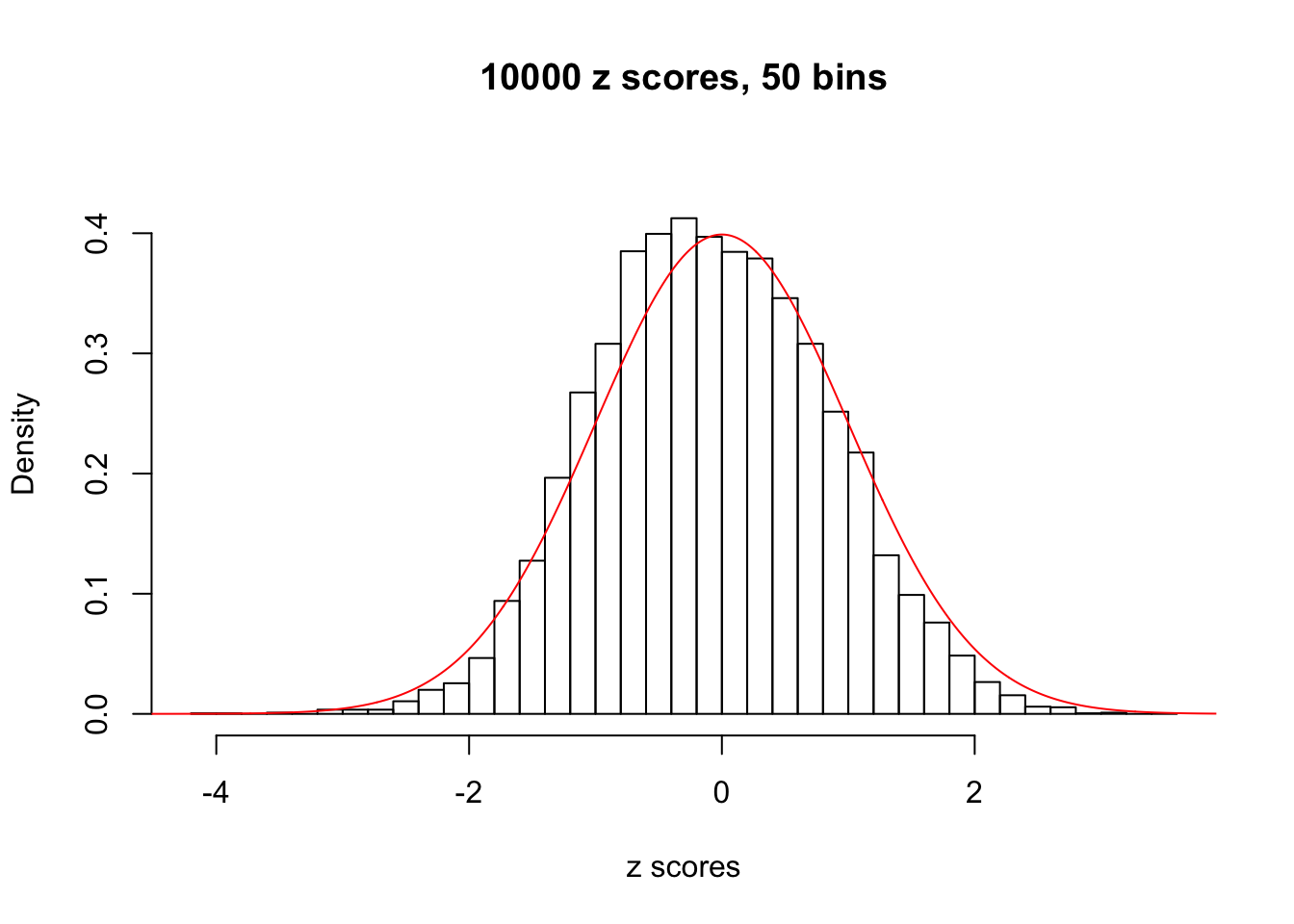hist(as.numeric(z[i, ]), xlab = "z scores", freq = FALSE, ylim = c(0, 0.45), nclass = 50, main = "10000 z scores, 50 bins")