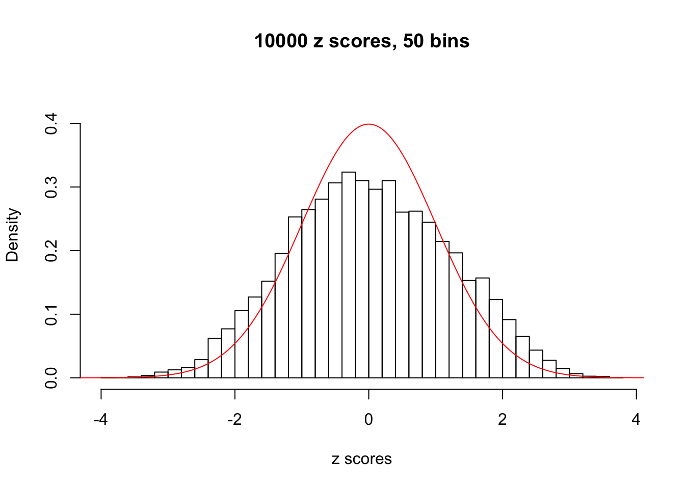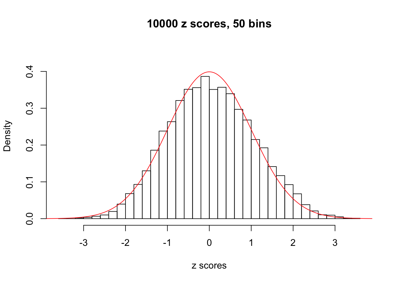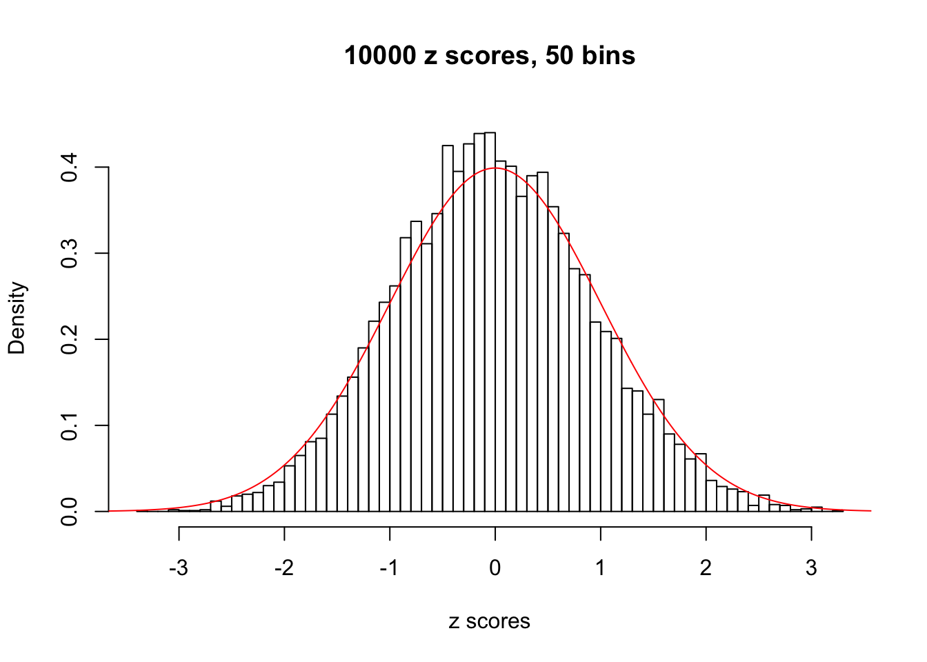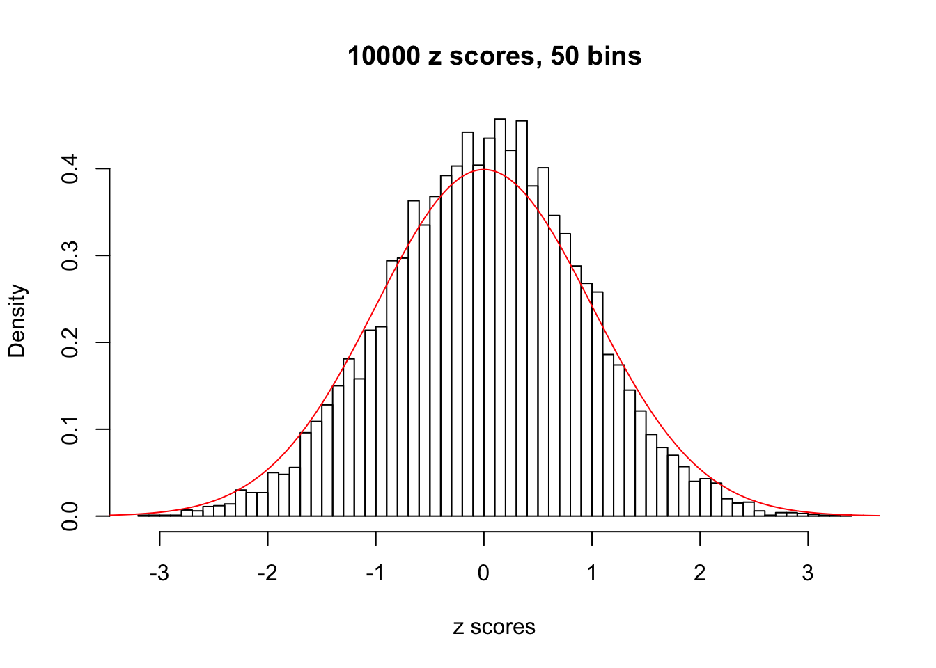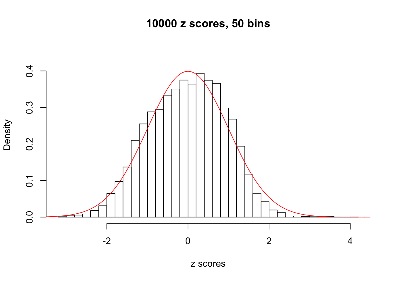 hist(as.numeric(z[i, ]), xlab = "z scores", freq = FALSE, ylim = c(0, 0.45), nclass = 50, main = "10000 z scores, 50 bins")