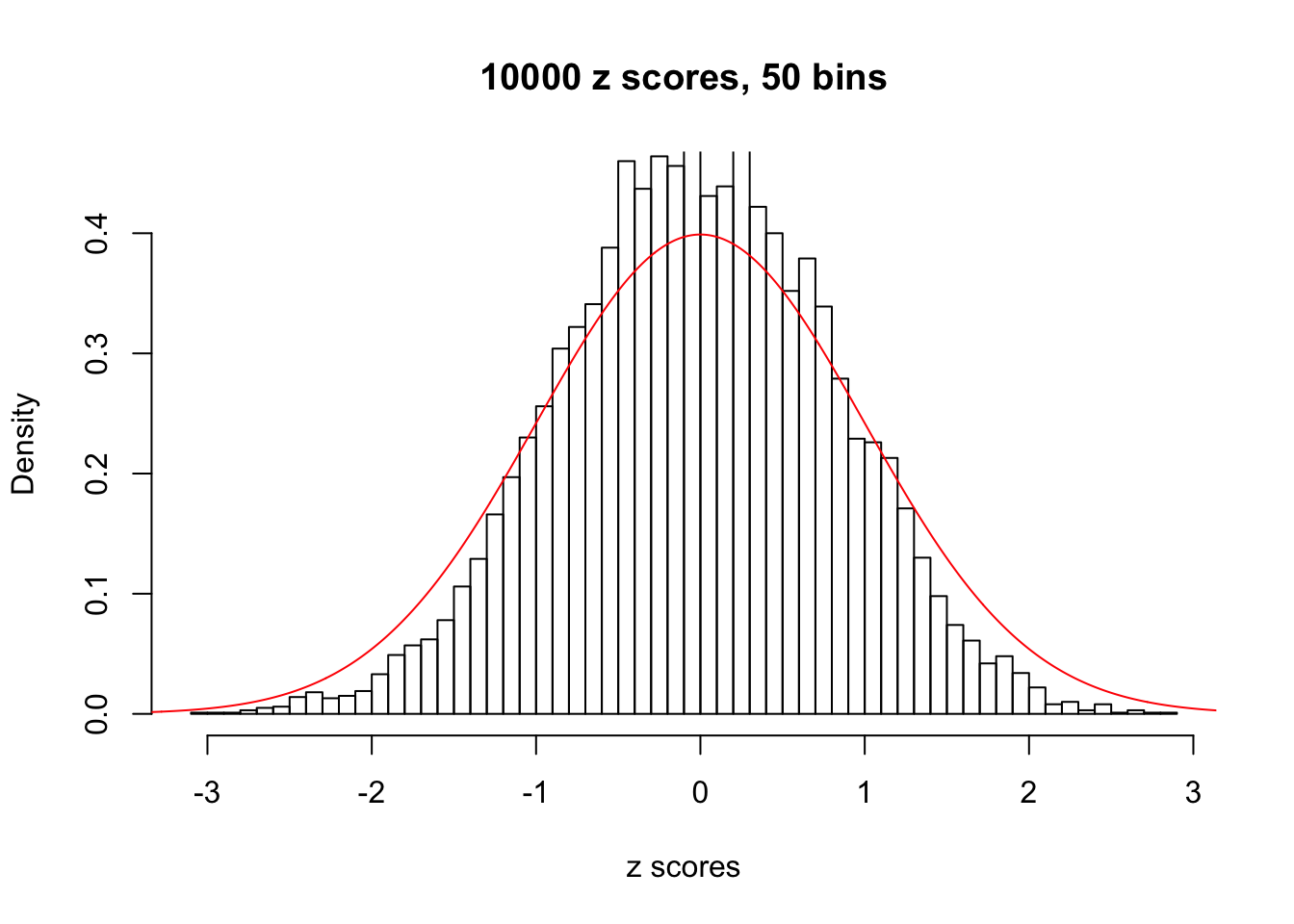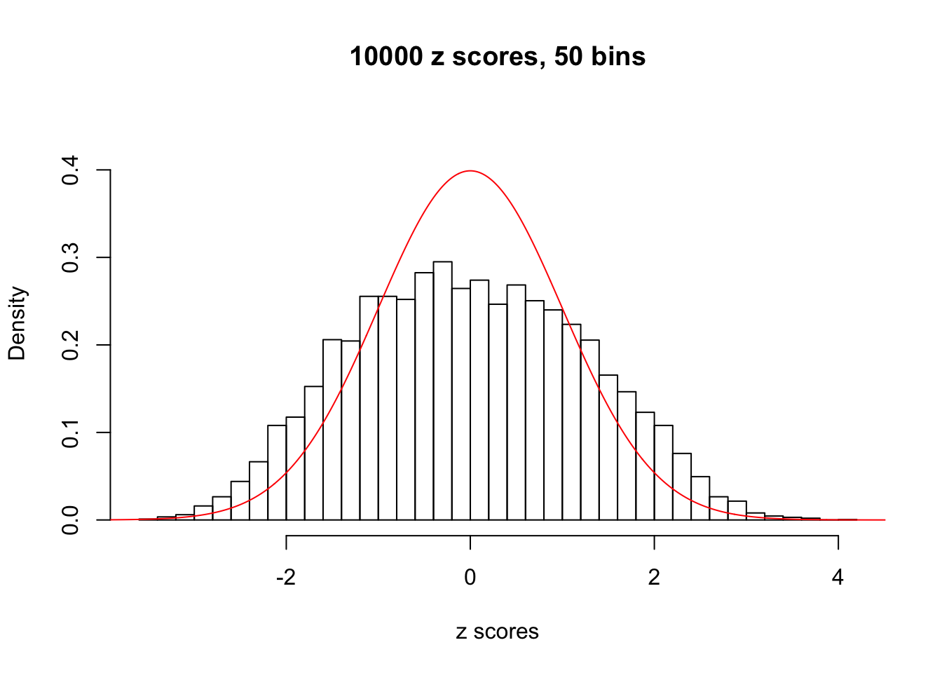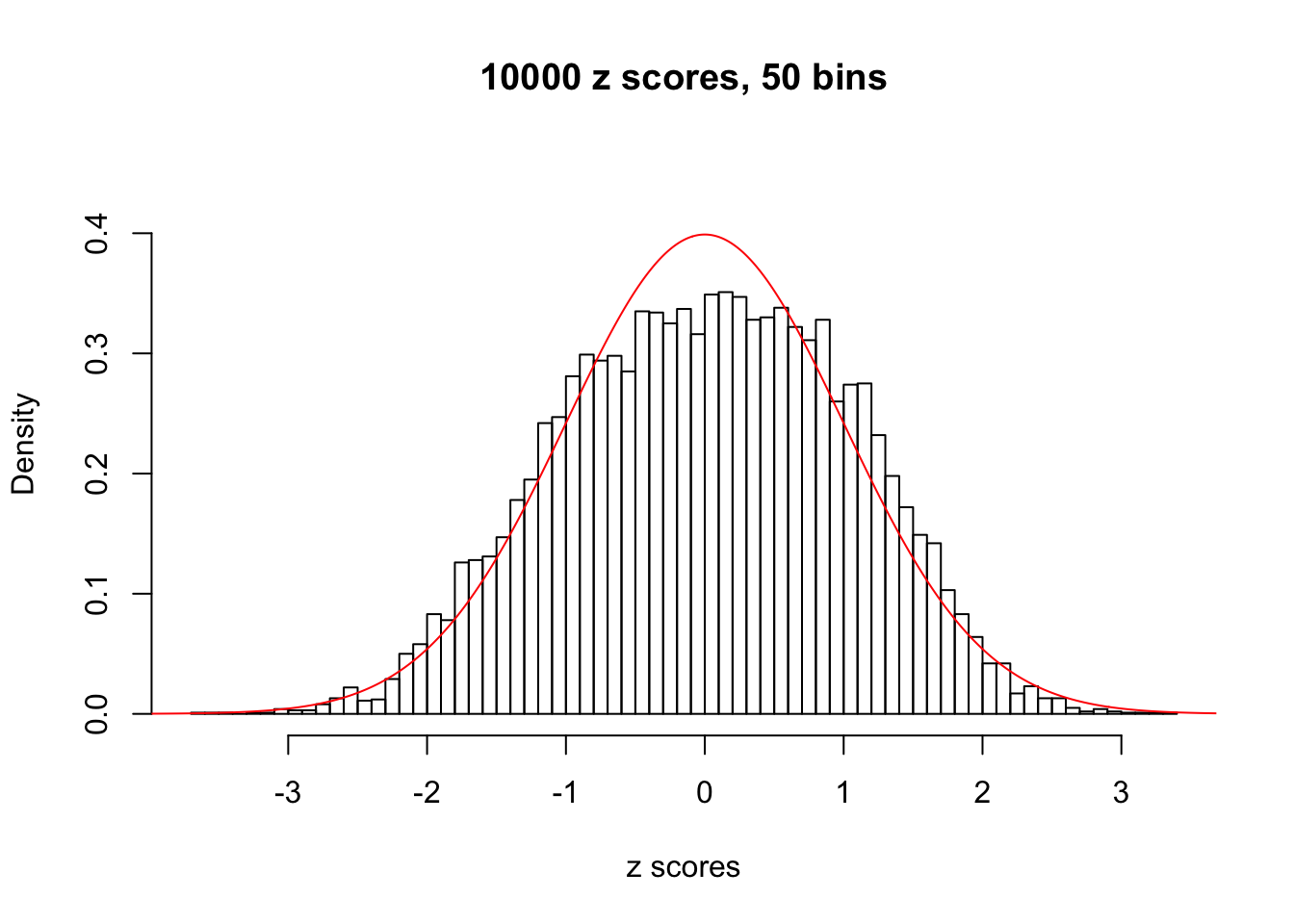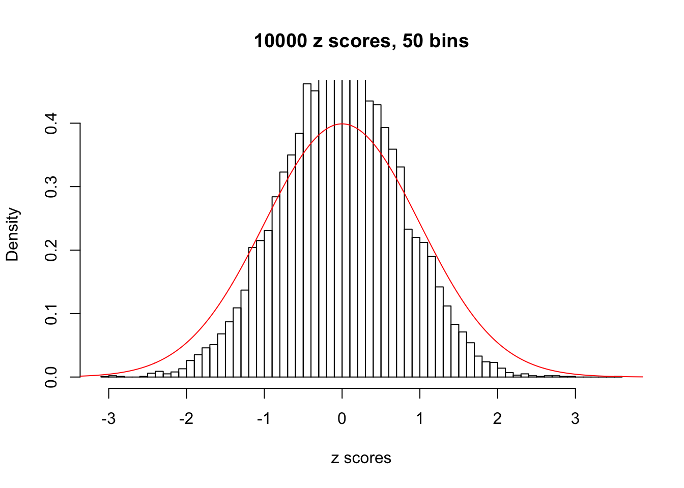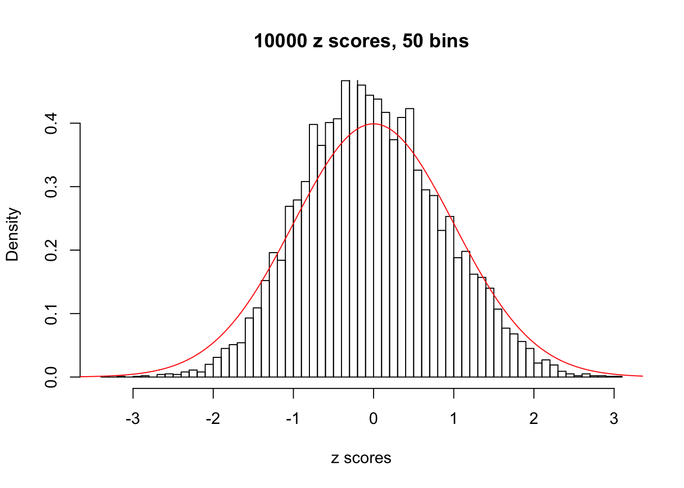 hist(as.numeric(z[i, ]), xlab = "z scores", freq = FALSE, ylim = c(0, 0.45), nclass = 50, main = "10000 z scores, 50 bins")