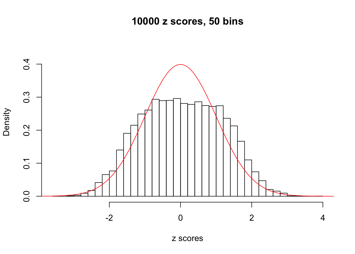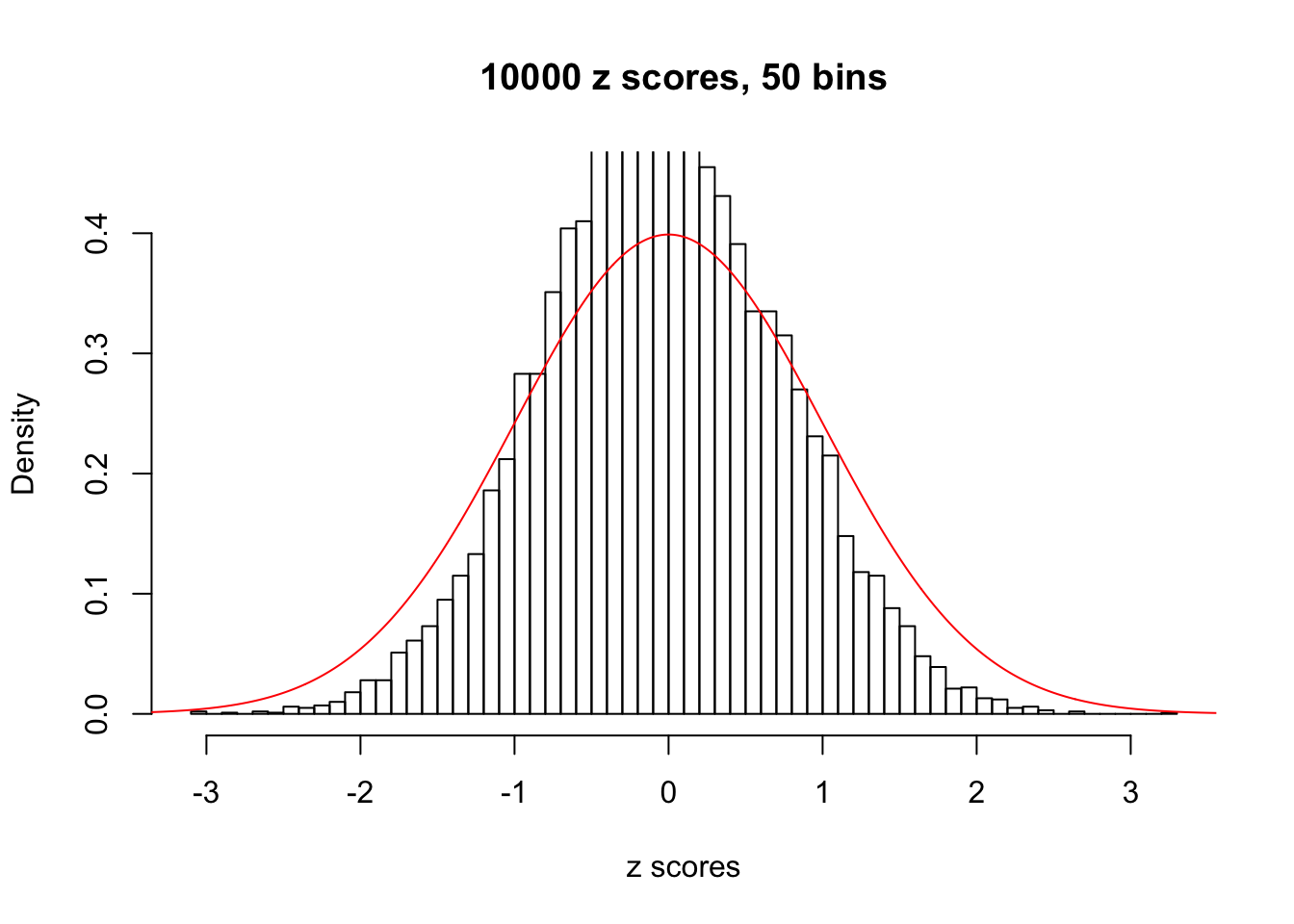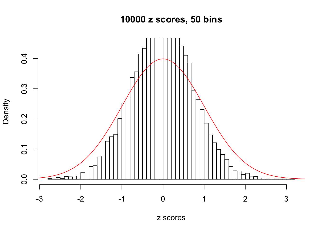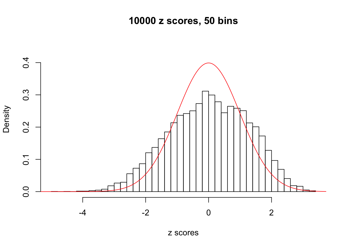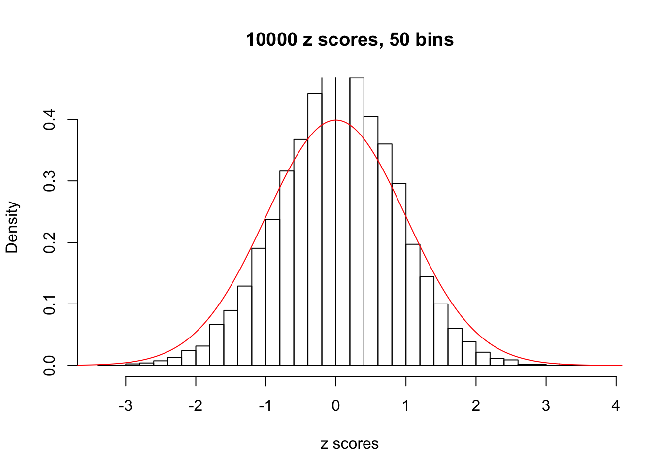 hist(as.numeric(z[i, ]), xlab = "z scores", freq = FALSE, ylim = c(0, 0.45), nclass = 50, main = "10000 z scores, 50 bins")