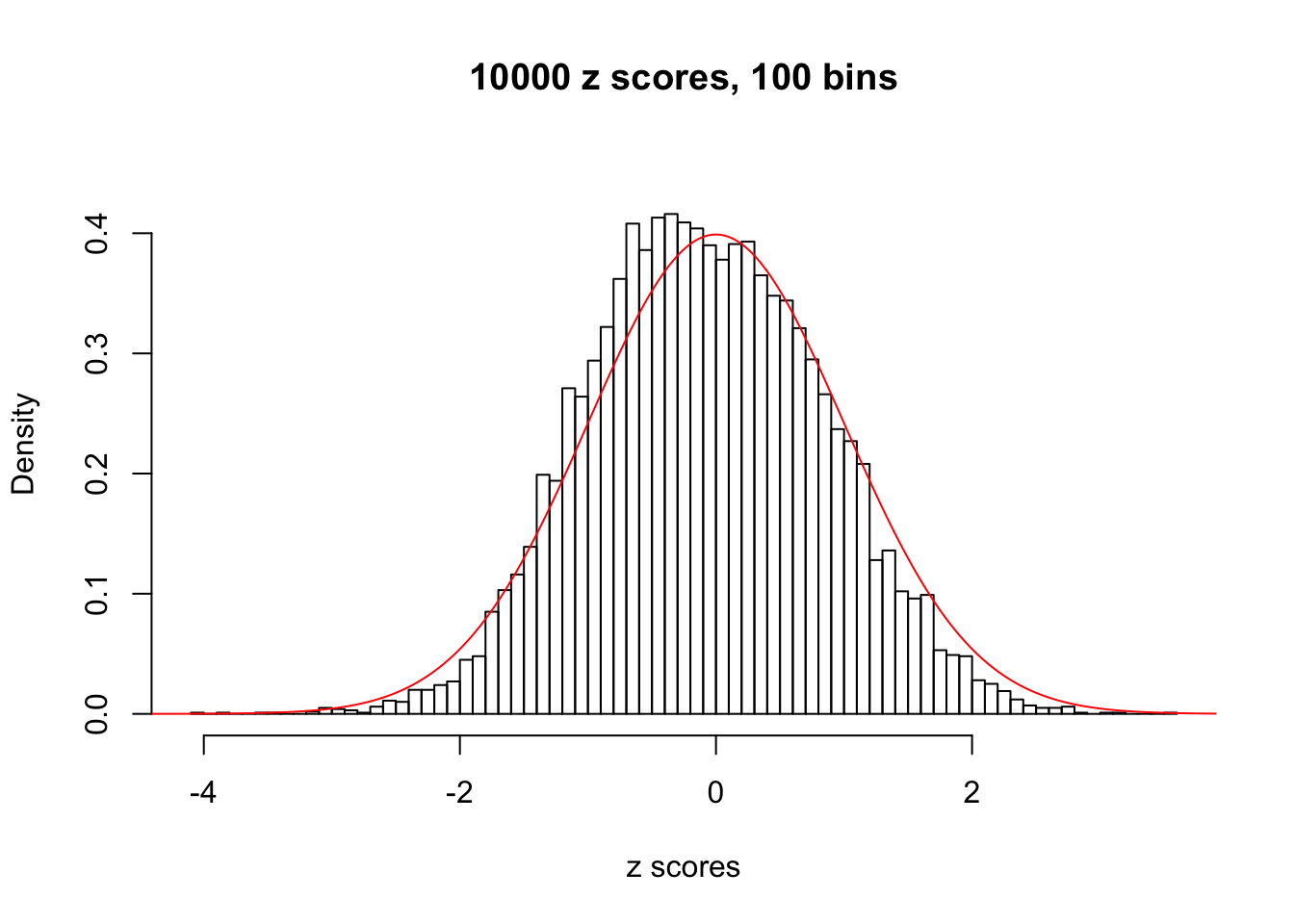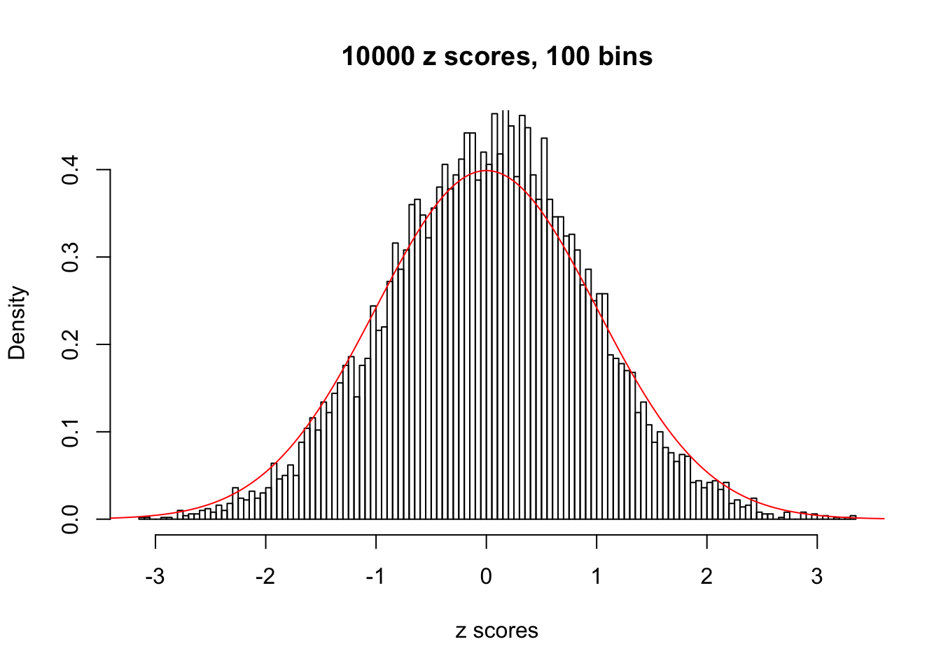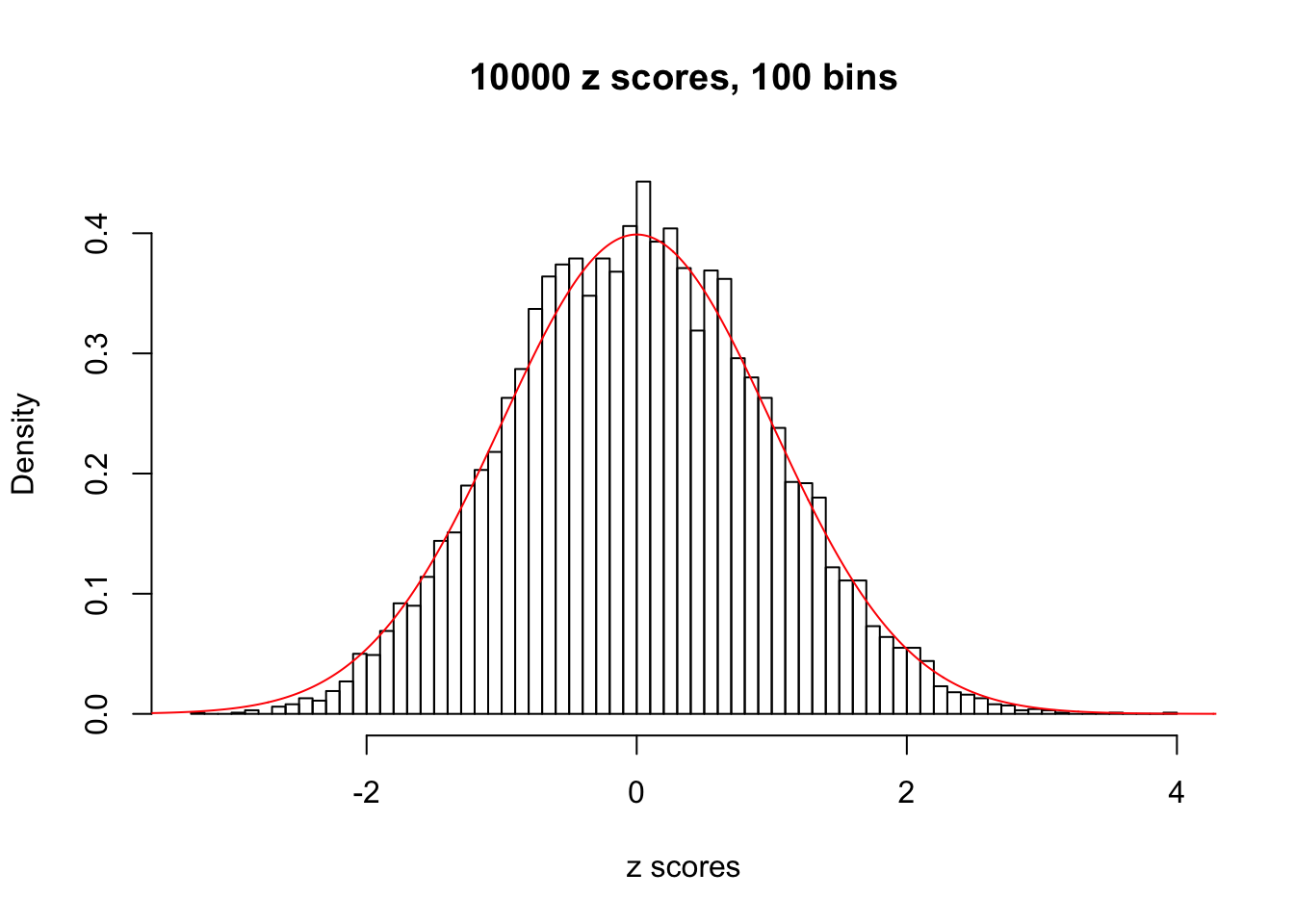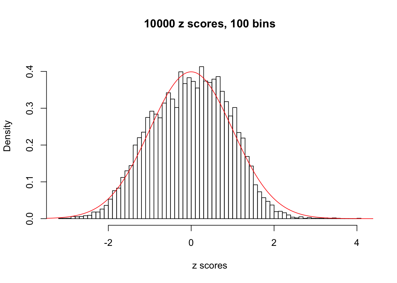 hist(as.numeric(z[i, ]), xlab = "z scores", freq = FALSE, ylim = c(0, 0.45), nclass = 100, main = "10000 z scores, 100 bins")