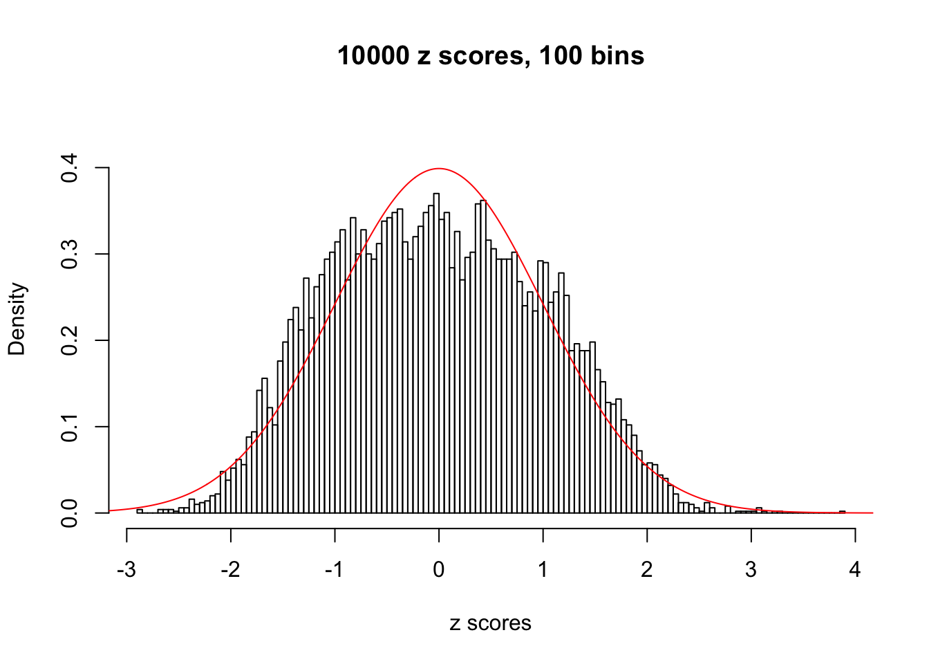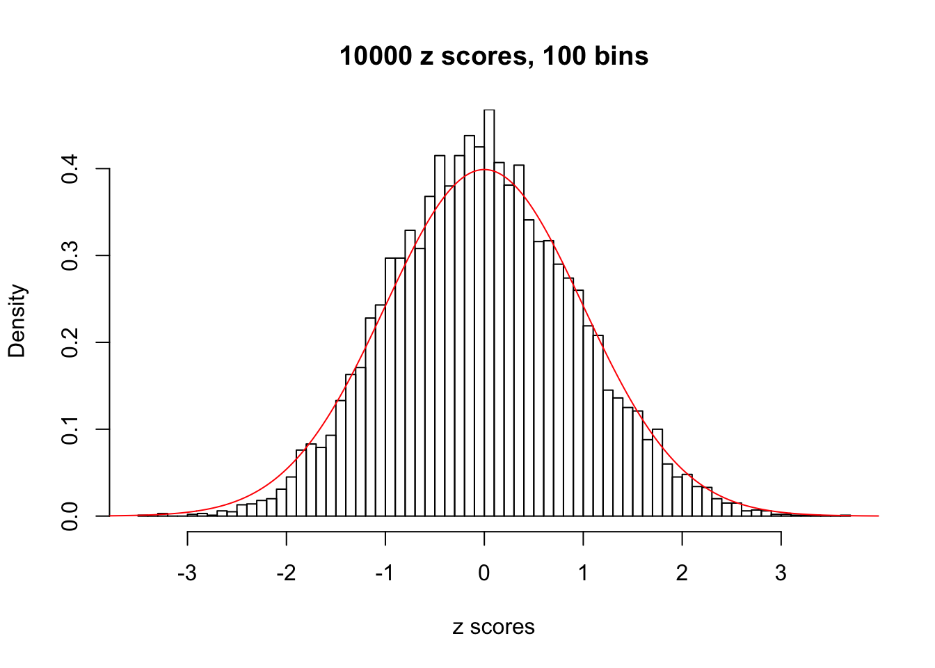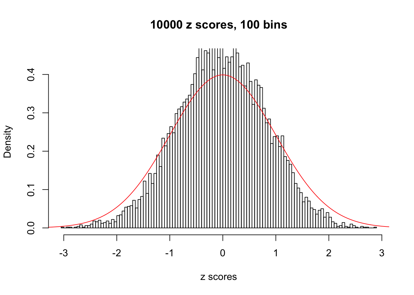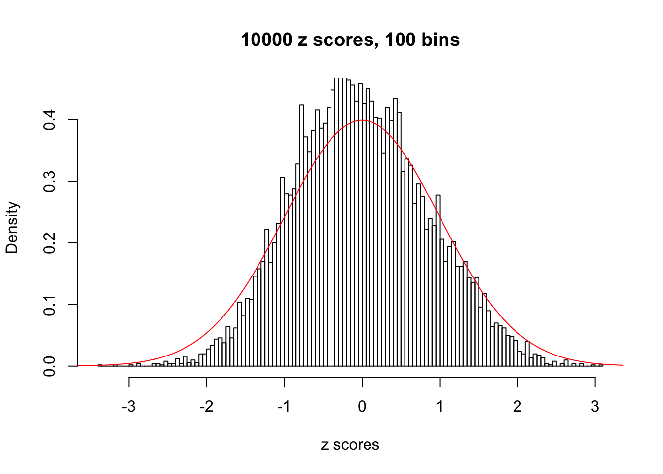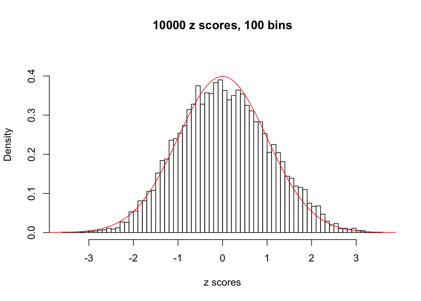 hist(as.numeric(z[i, ]), xlab = "z scores", freq = FALSE, ylim = c(0, 0.45), nclass = 100, main = "10000 z scores, 100 bins")