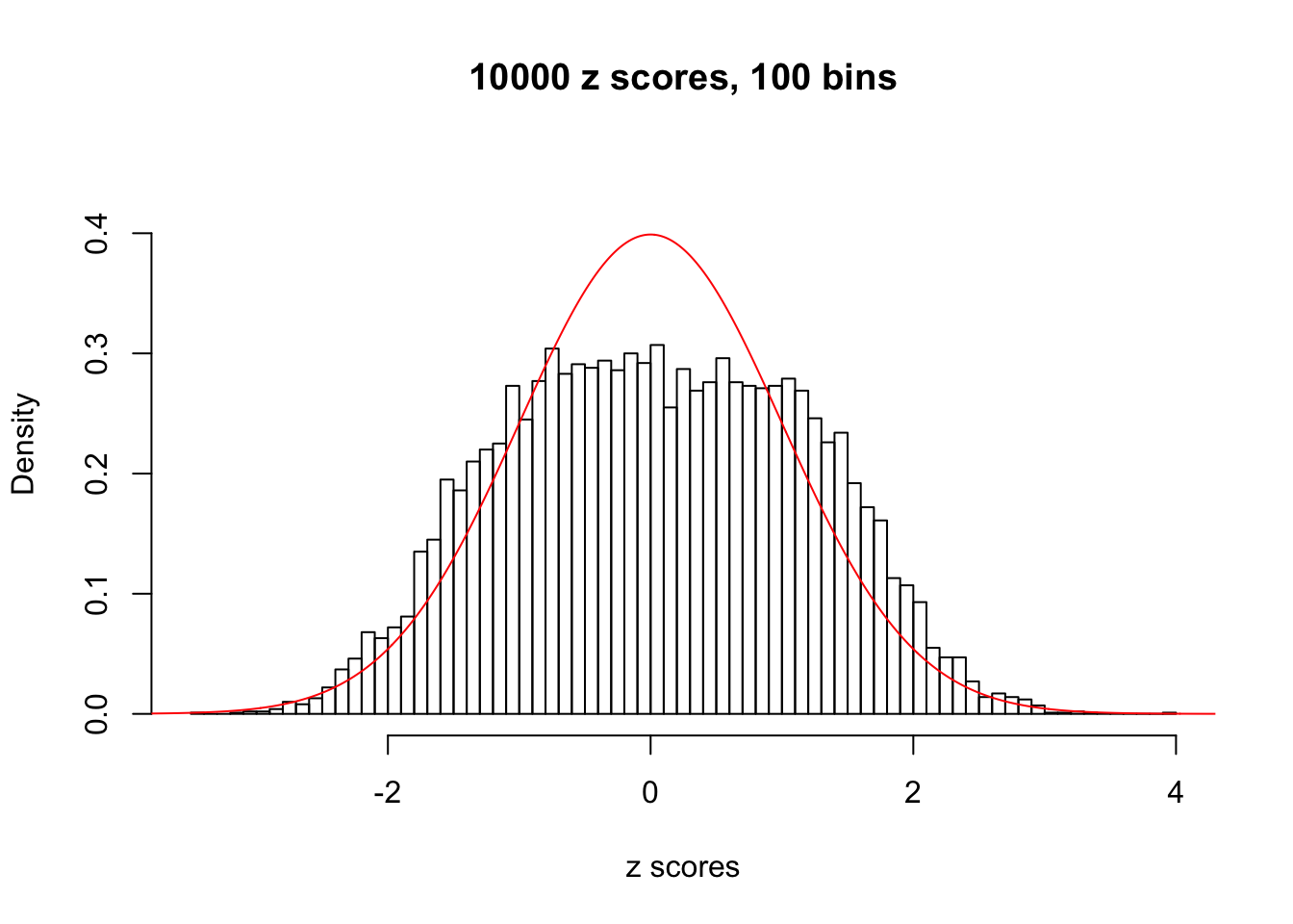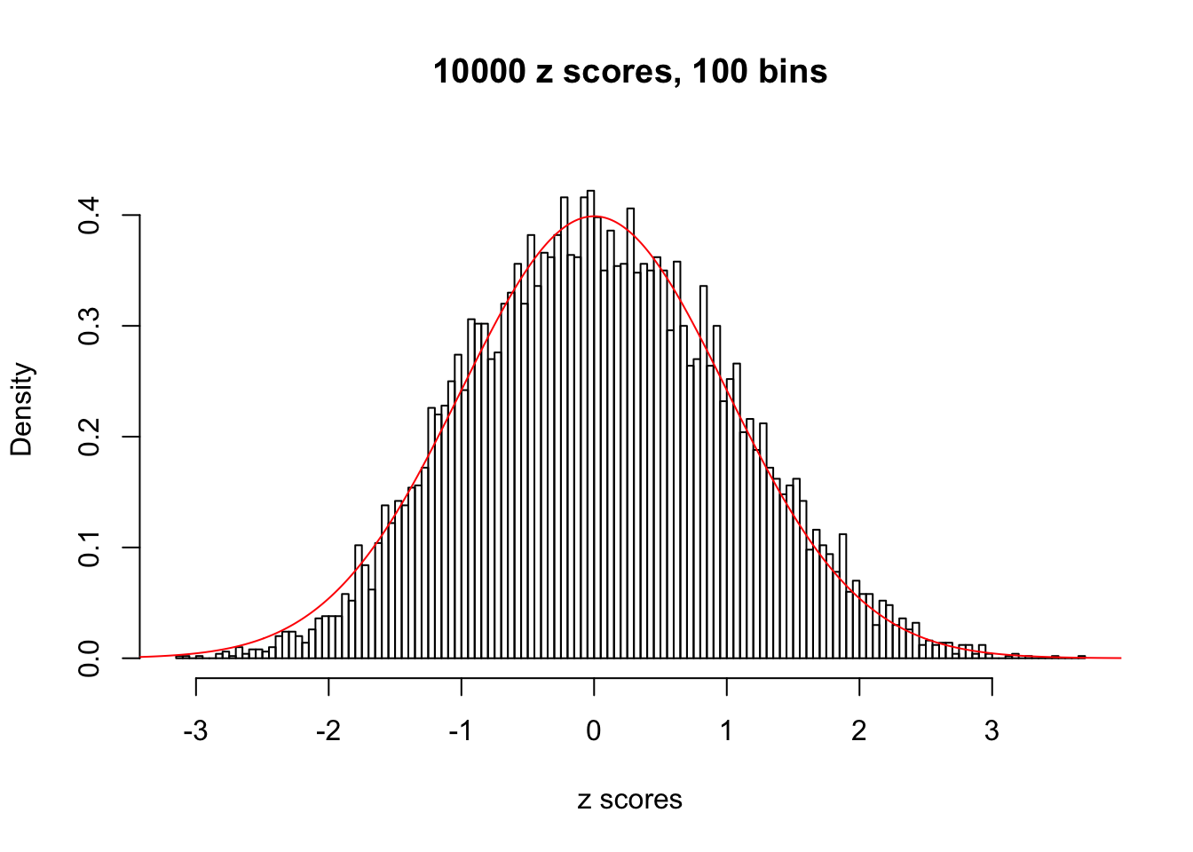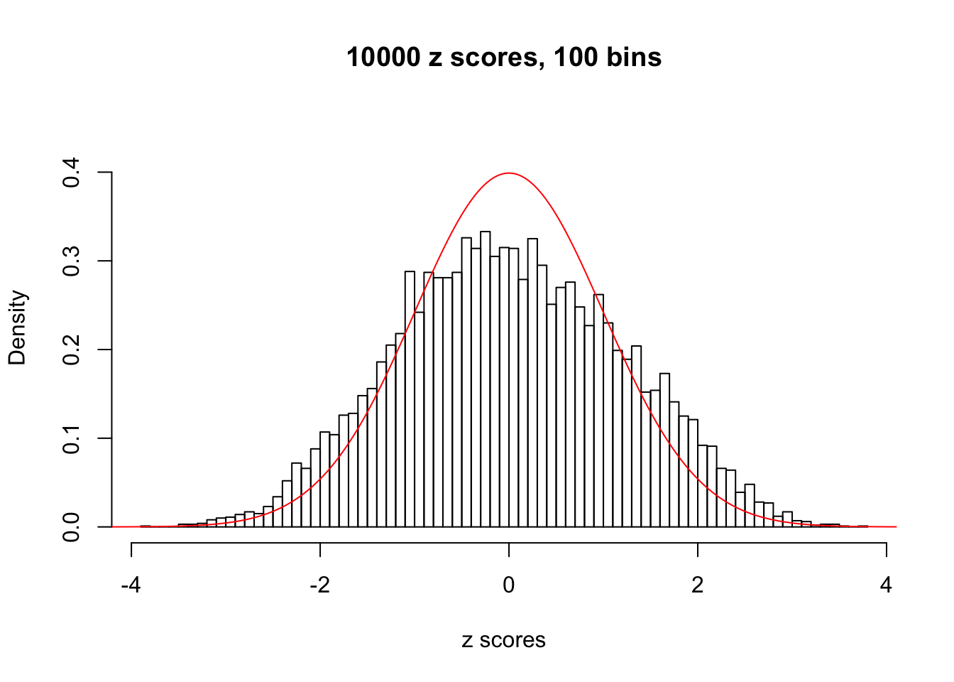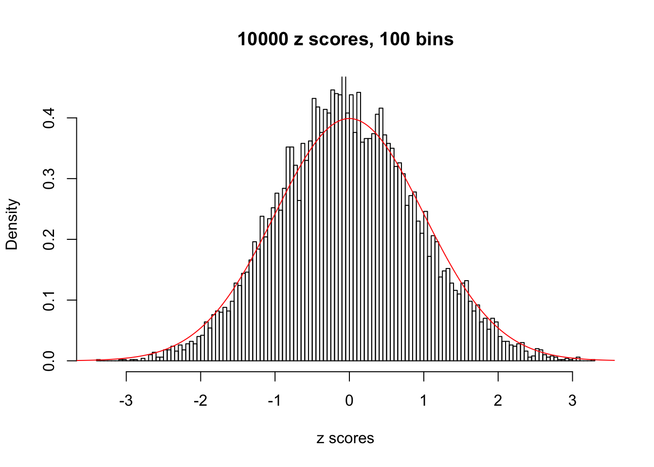 hist(as.numeric(z[i, ]), xlab = "z scores", freq = FALSE, ylim = c(0, 0.45), nclass = 100, main = "10000 z scores, 100 bins")