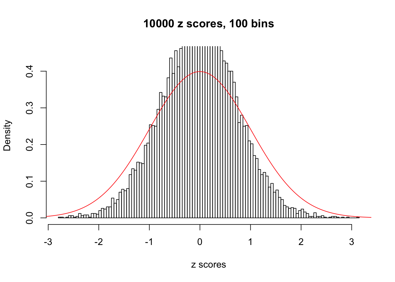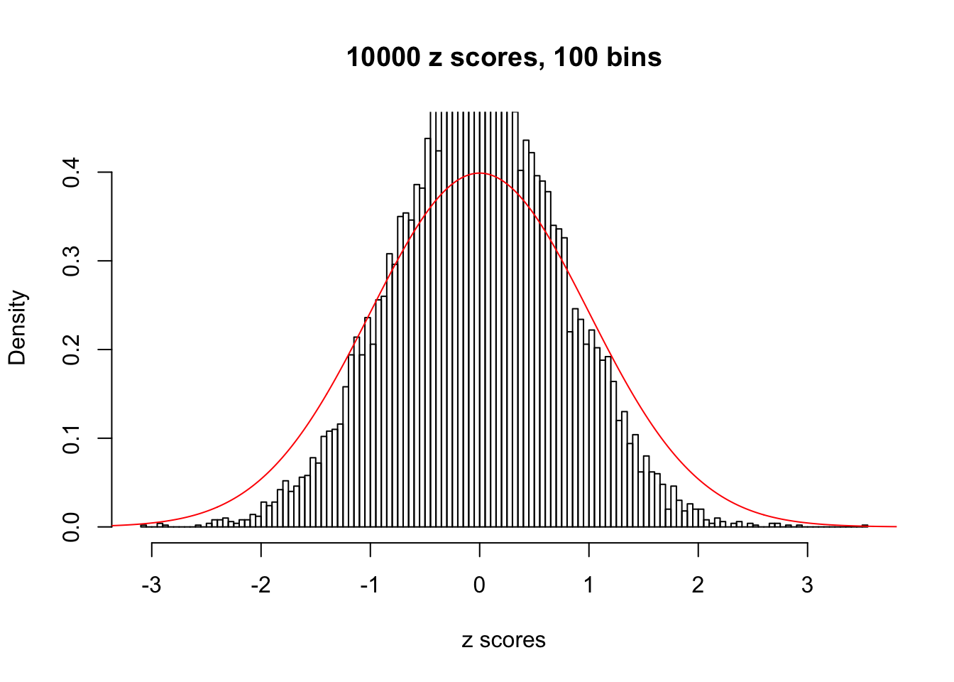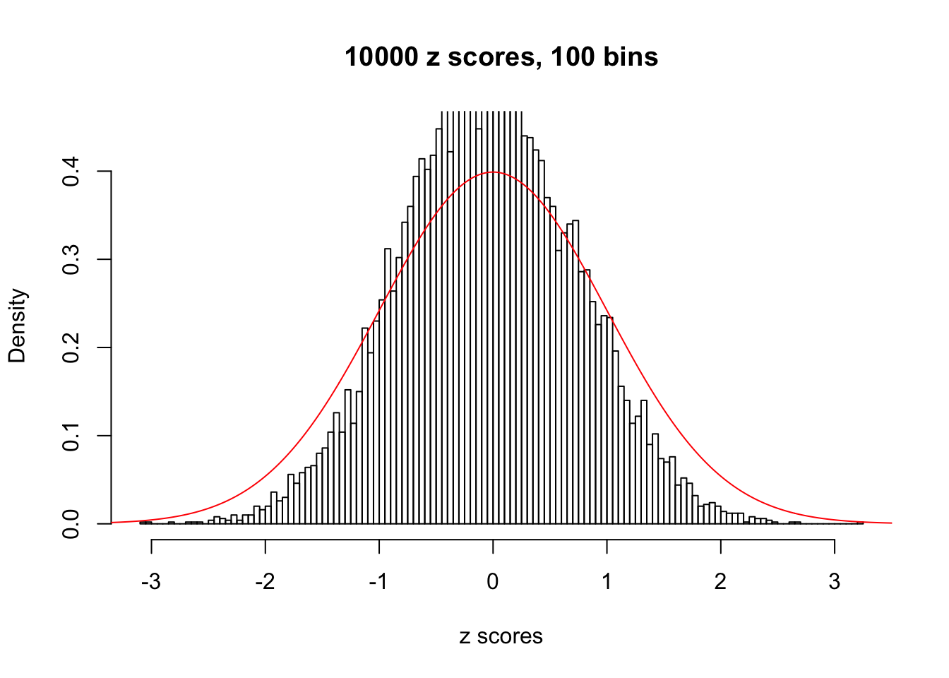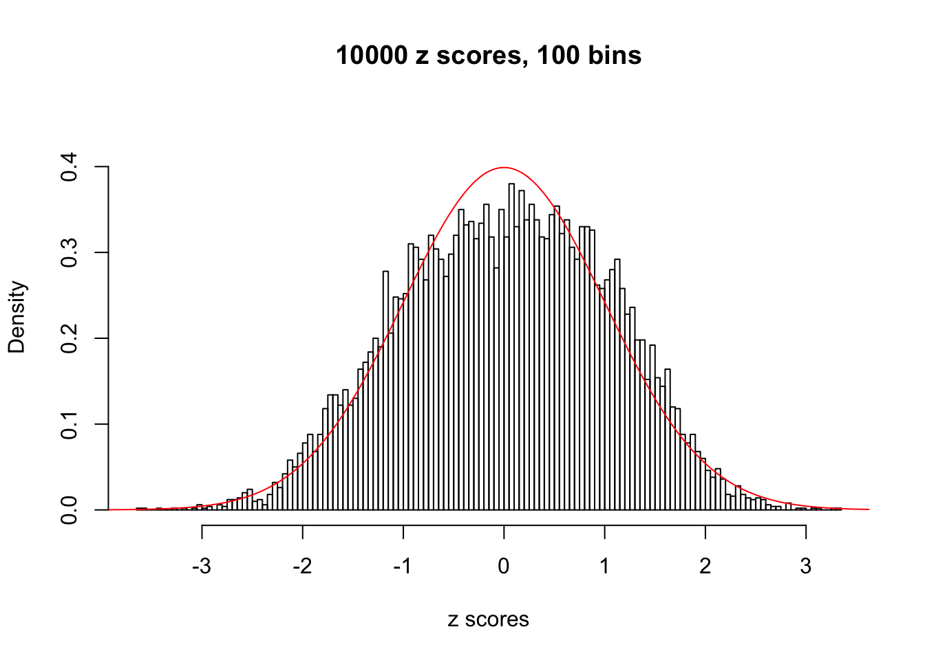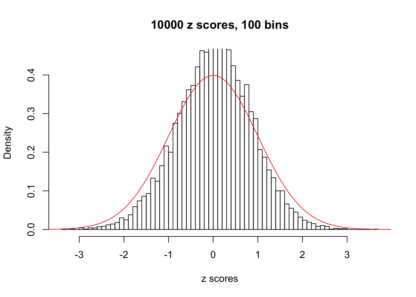 hist(as.numeric(z[i, ]), xlab = "z scores", freq = FALSE, ylim = c(0, 0.45), nclass = 100, main = "10000 z scores, 100 bins")