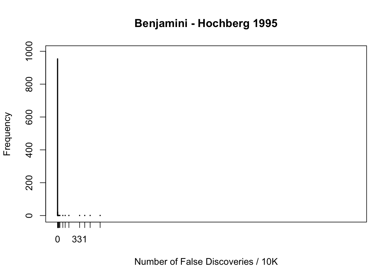 plot(table(fd.bh), xlab = "Number of False Discoveries / 10K", ylab = "Frequency", main = "Benjamini - Hochberg 1995", xlim = xlim, ylim = ylim)