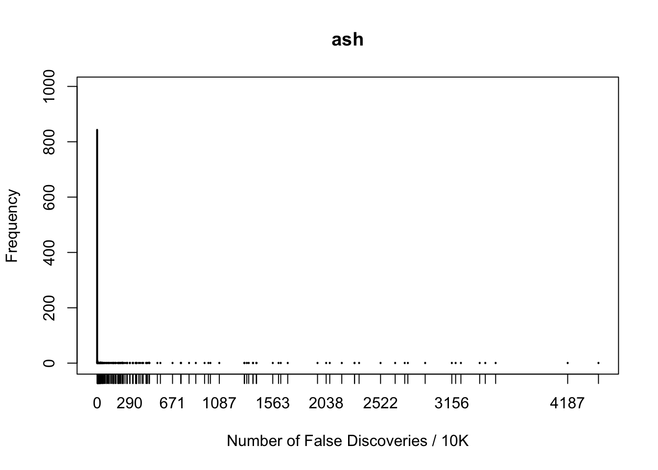 plot(table(fd.ash), xlab = "Number of False Discoveries / 10K", ylab = "Frequency", main = "ash", xlim = xlim, ylim = ylim)
