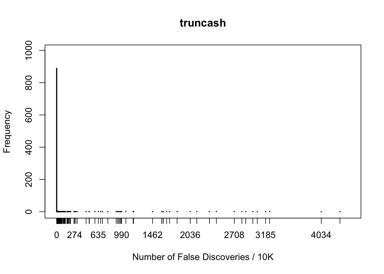 plot(table(fd.truncash), xlab = "Number of False Discoveries / 10K", ylab = "Frequency", main = "truncash", xlim = xlim, ylim = ylim)