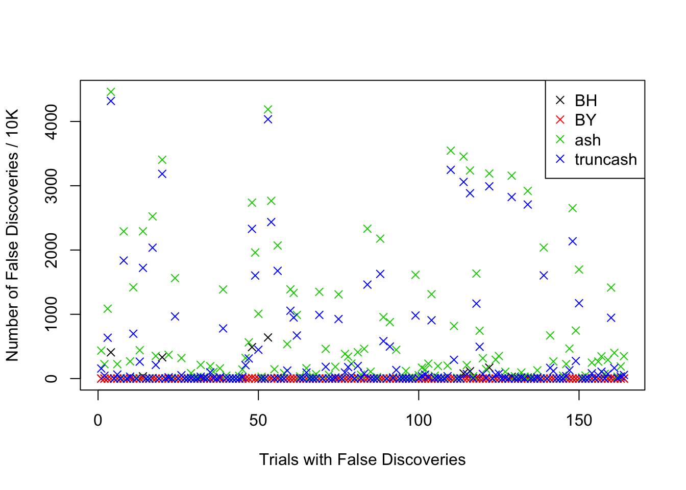 legend("topright", c("BH", "BY", "ash", "truncash"), col = 1:4, pch = 4)
