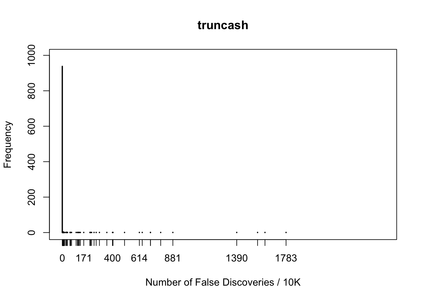 plot(table(fd.truncash), xlab = "Number of False Discoveries / 10K", ylab = "Frequency", main = "truncash", xlim = xlim, ylim = ylim)
