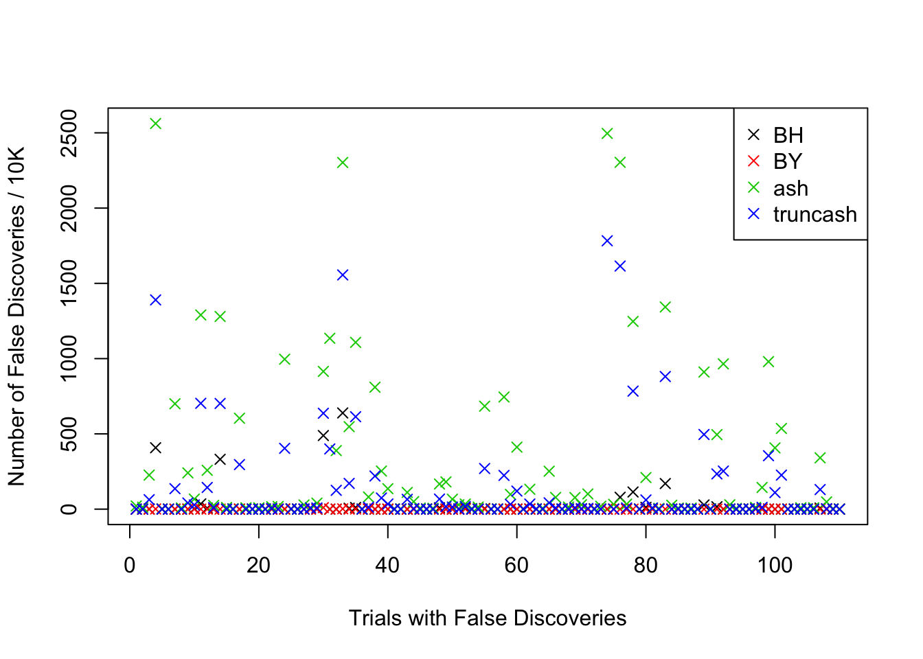 legend("topright", c("BH", "BY", "ash", "truncash"), col = 1:4, pch = 4)