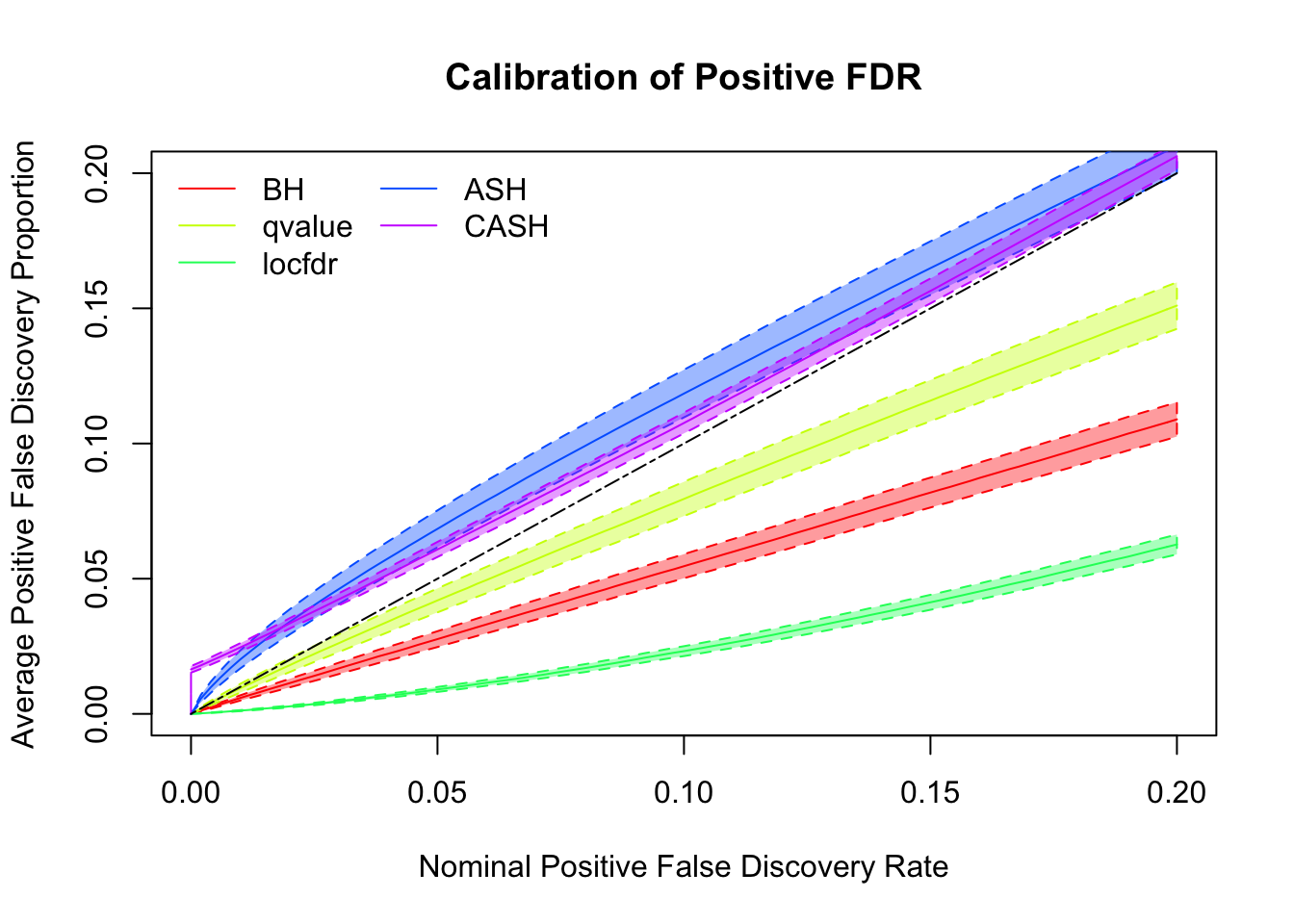We are using the data obtained from the large-scale simulation with real data to show the variability of the positive false discovery proportions obtained by different methods at nominal \(q\) value $ = 0.05$. The true effect distribution is \(0.6\delta_0 + 0.3N(0, 1) + 0.1N(0, 2^2)\).