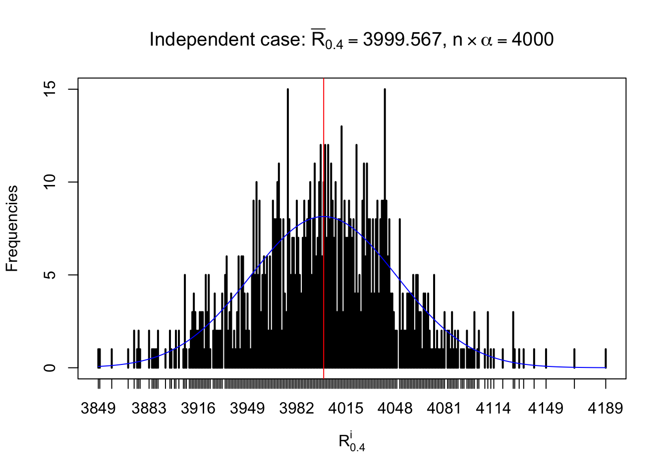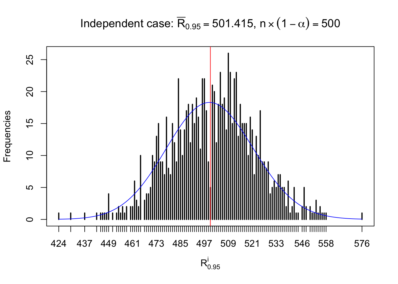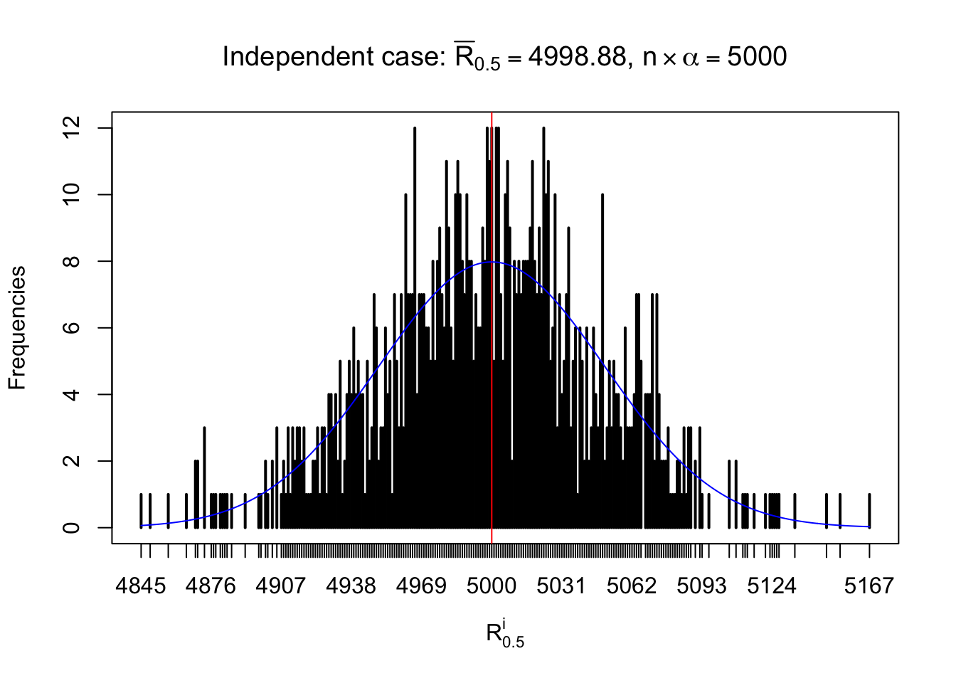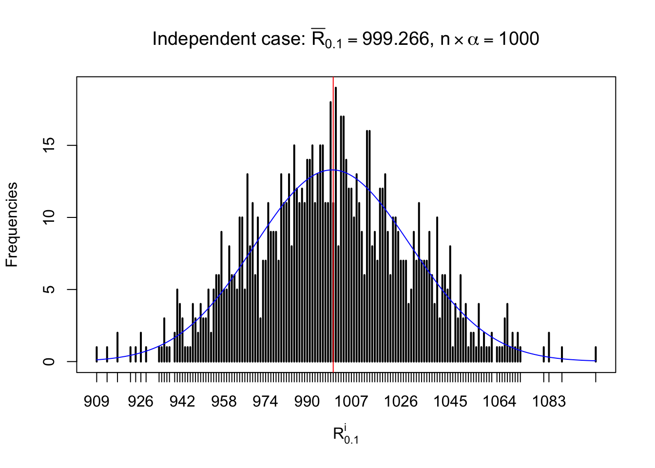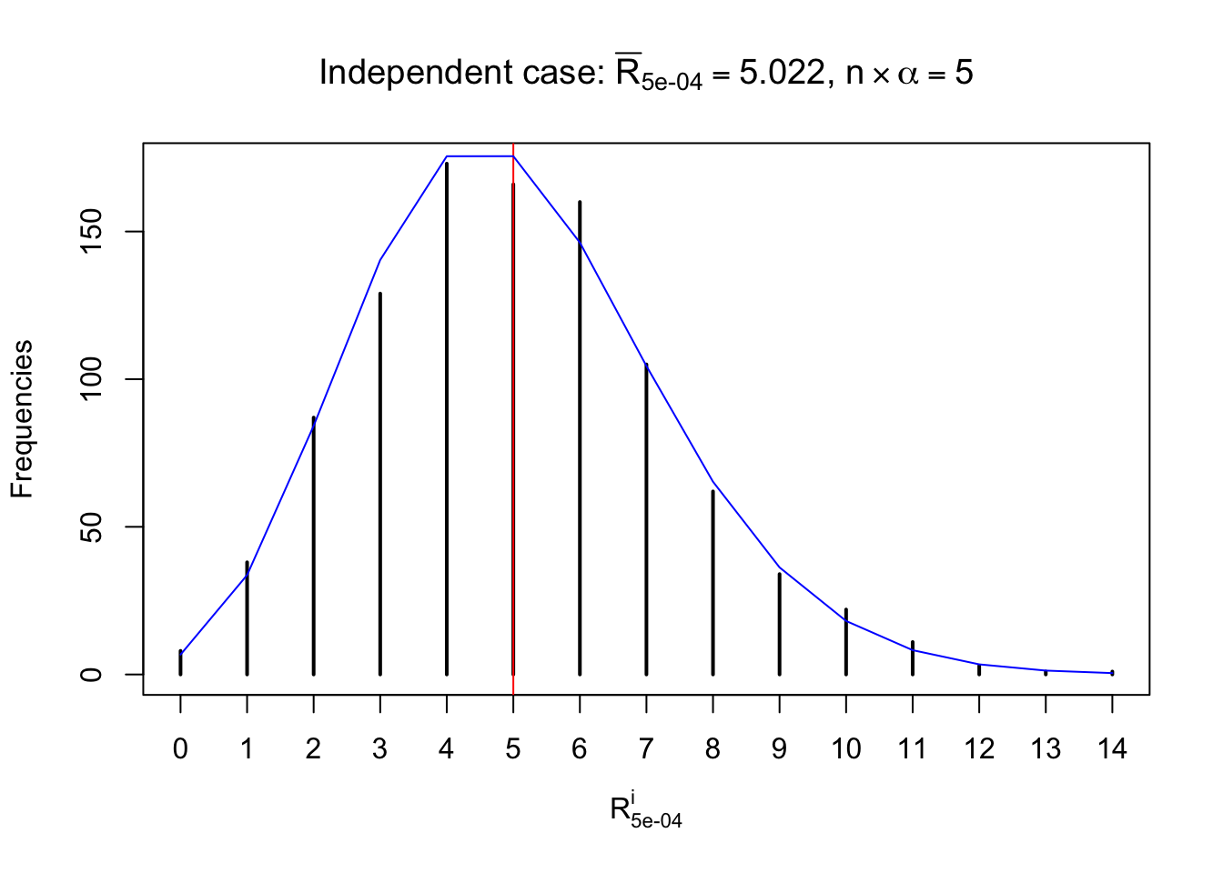 Defined this way, \(R_\alpha^i\) should be a sample from \(n \times F_n^{R_i}\left(z_\alpha\right)\) or \(n \times \left(1- F_n^{R_i}\left(z_\alpha\right)\right)\). We can check if \(E\left[F_n\left(z\right)\right] = \Phi\left(z\right)\) by looking at if the average \[ \bar R_\alpha \approx \begin{cases} n\Phi\left(z_\alpha\right) = n\alpha & \alpha \leq 0.5 \\ n\left(1-\Phi\left(z_\alpha\right)\right) = n\left(1 - \alpha\right) & \alpha > 0.5\end{cases} \ . \] We may also compare the frequencies of \(R_\alpha^i\) with their theoretical expected values \(m \times \text{Binomial}\left(n, \alpha\right)\) (in blue) assuming \(z_{ij}\) are independent.