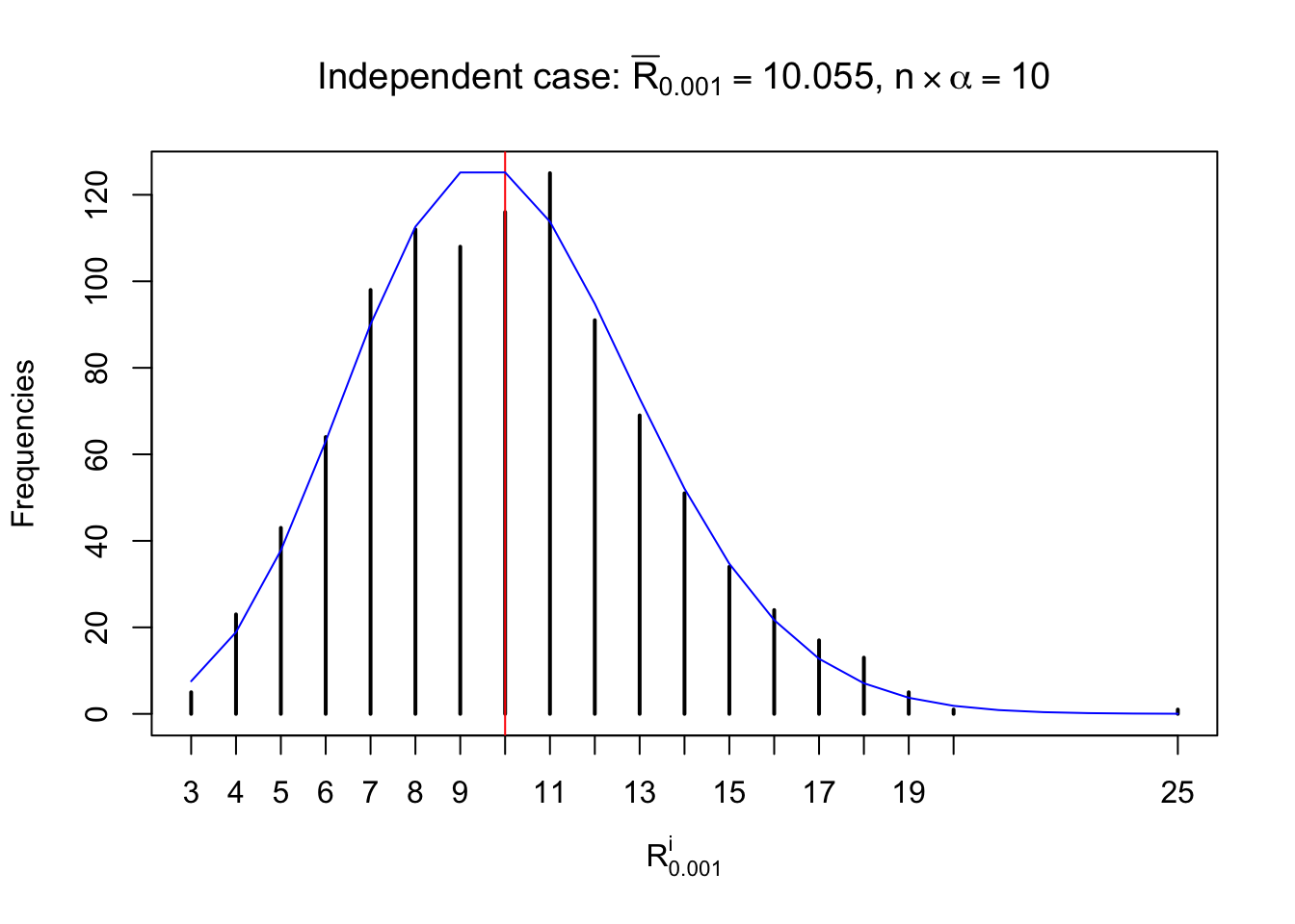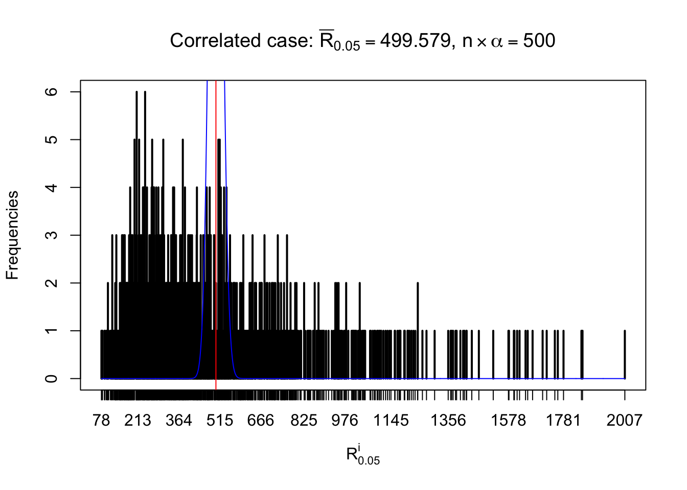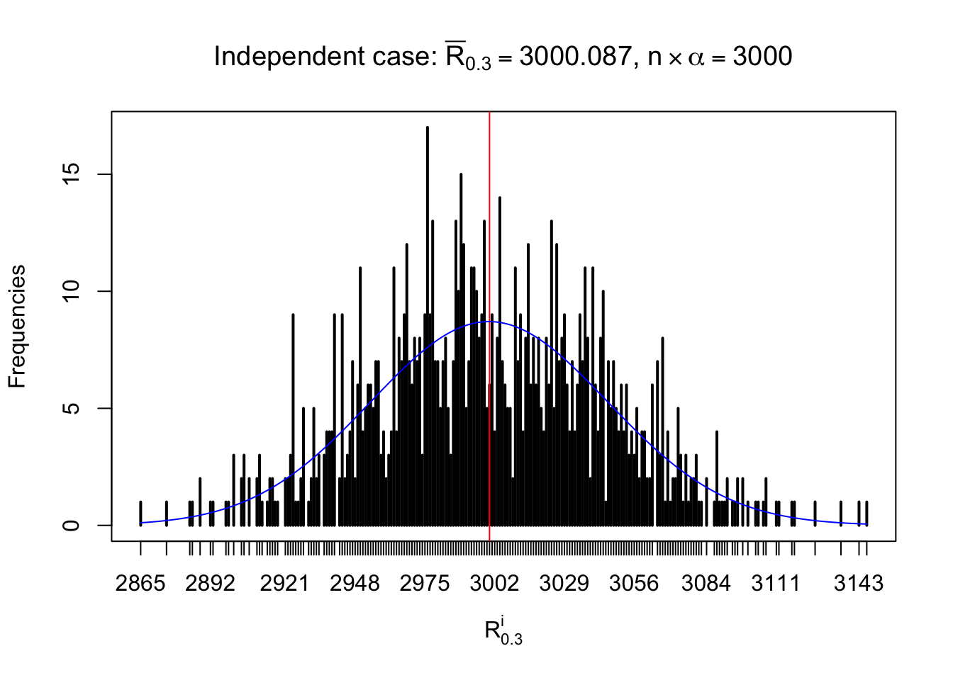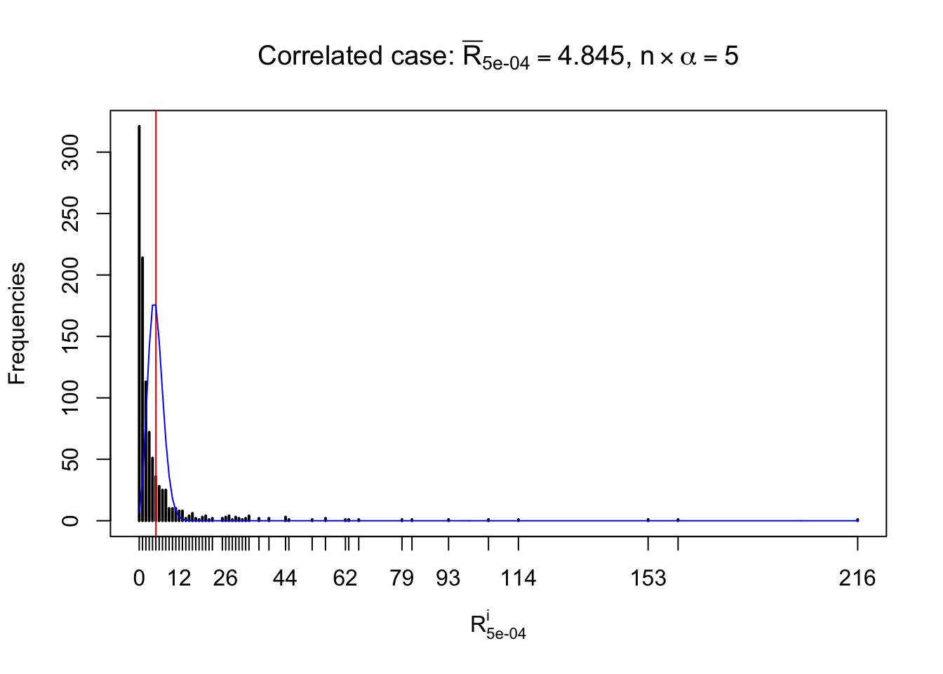 Defined this way, \(R_\alpha^i\) should be a sample from \(n \times F_n^{R_i}\left(z_\alpha\right)\) or \(n \times \left(1- F_n^{R_i}\left(z_\alpha\right)\right)\). We can check if \(E\left[F_n\left(z\right)\right] = \Phi\left(z\right)\) by looking at if the average \[ \bar R_\alpha \approx \begin{cases} n\Phi\left(z_\alpha\right) = n\alpha & \alpha \leq 0.5 \\ n\left(1-\Phi\left(z_\alpha\right)\right) = n\left(1 - \alpha\right) & \alpha > 0.5\end{cases} \ . \] We may also compare the frequencies of \(R_\alpha^i\) with their theoretical expected values \(m \times \text{Binomial}\left(n, \alpha\right)\) (in blue) assuming \(z_{ij}\) are independent.