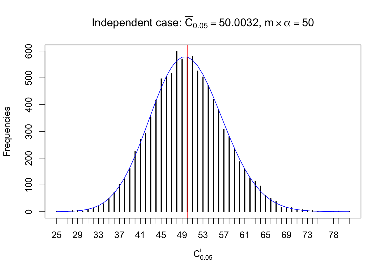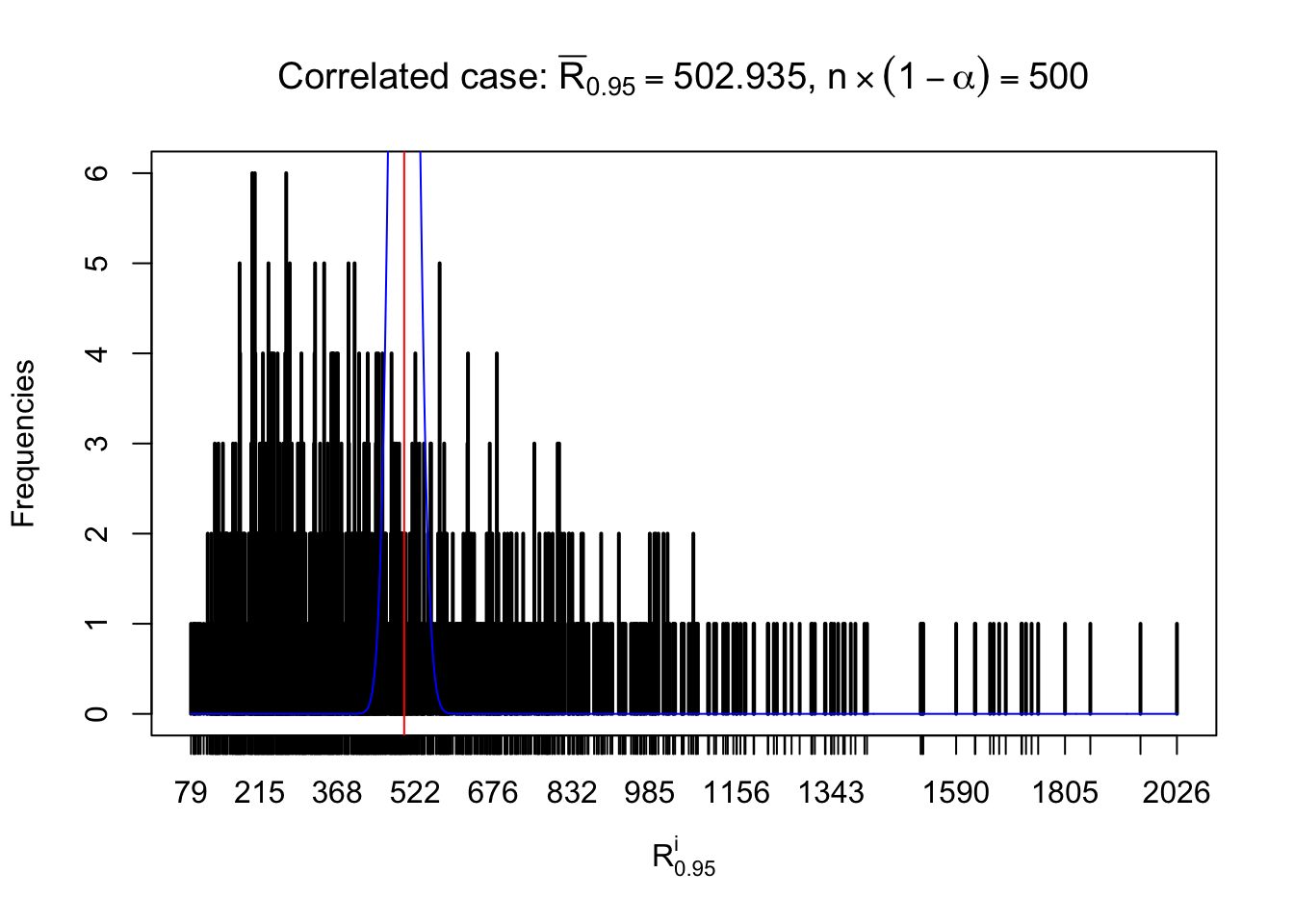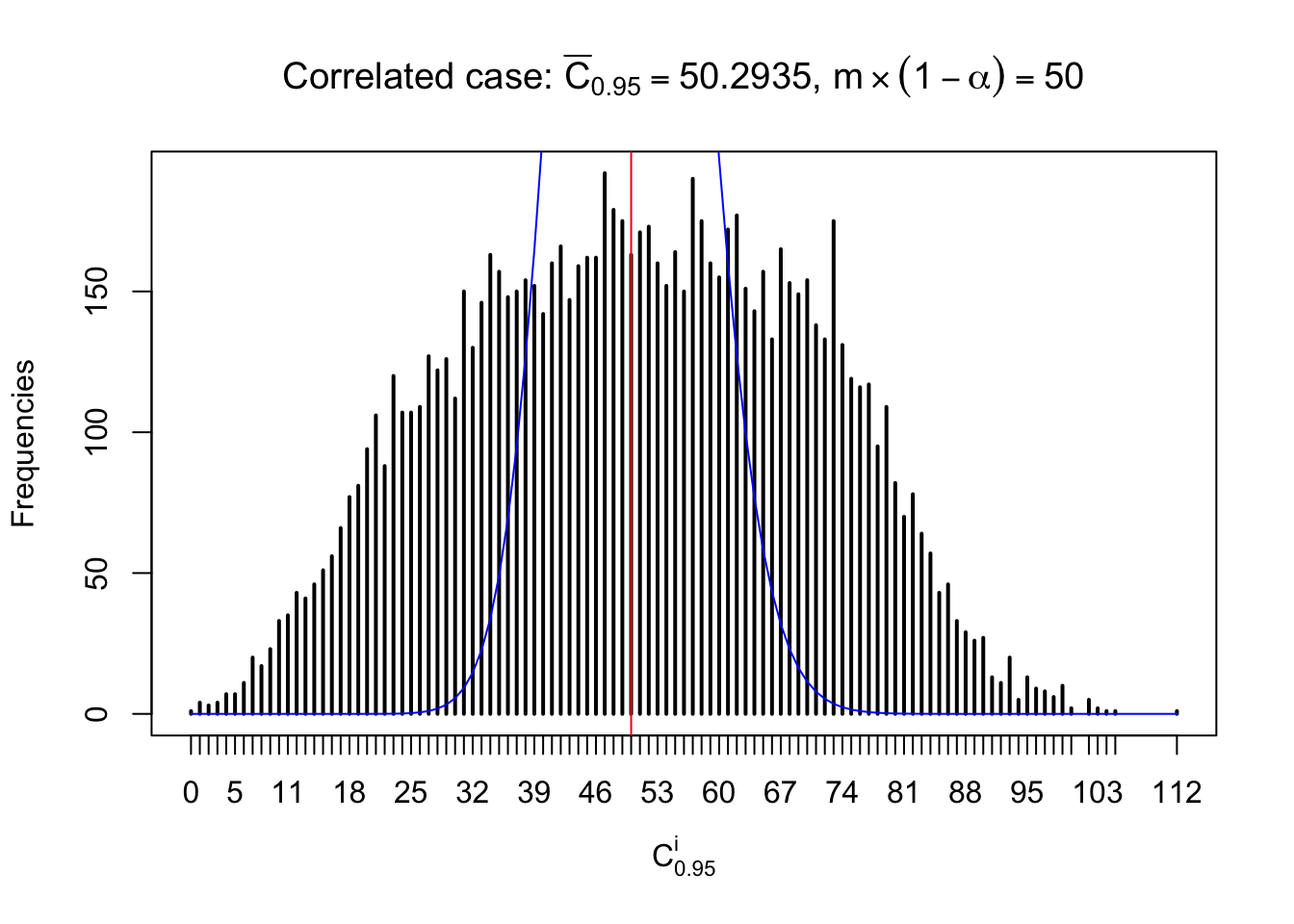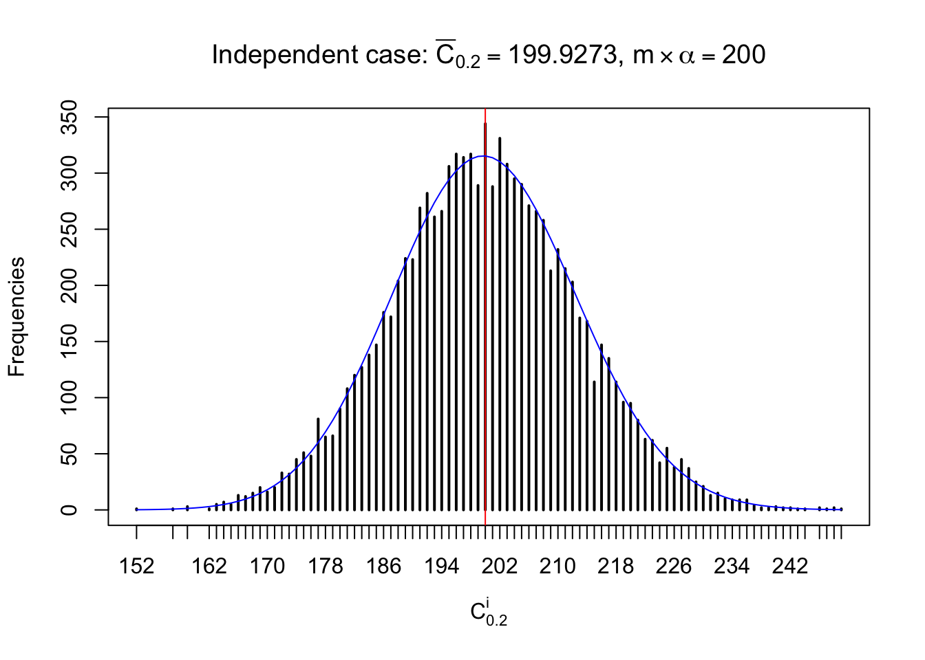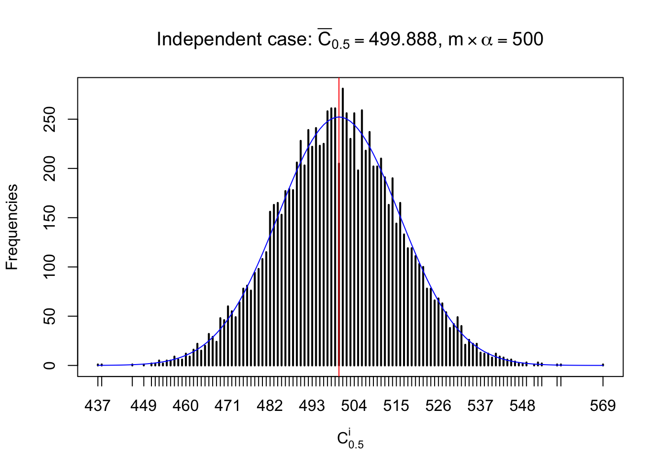 Defined this way, \(R_\alpha^i\) should be a sample from \(n \times F_n^{R_i}\left(z_\alpha\right)\) or \(n \times \left(1- F_n^{R_i}\left(z_\alpha\right)\right)\). We can check if \(E\left[F_n\left(z\right)\right] = \Phi\left(z\right)\) by looking at if the average \[ \bar R_\alpha \approx \begin{cases} n\Phi\left(z_\alpha\right) = n\alpha & \alpha \leq 0.5 \\ n\left(1-\Phi\left(z_\alpha\right)\right) = n\left(1 - \alpha\right) & \alpha > 0.5\end{cases} \ . \] We may also compare the frequencies of \(R_\alpha^i\) with their theoretical expected values \(m \times \text{Binomial}\left(n, \alpha\right)\) (in blue) assuming \(z_{ij}\) are independent.