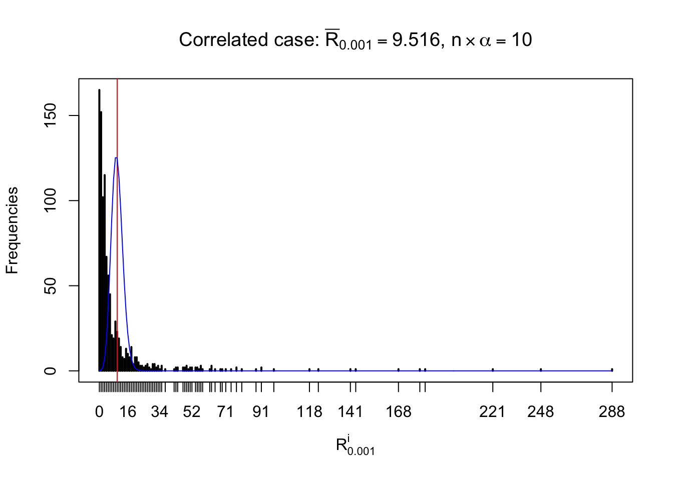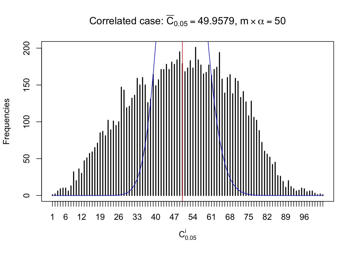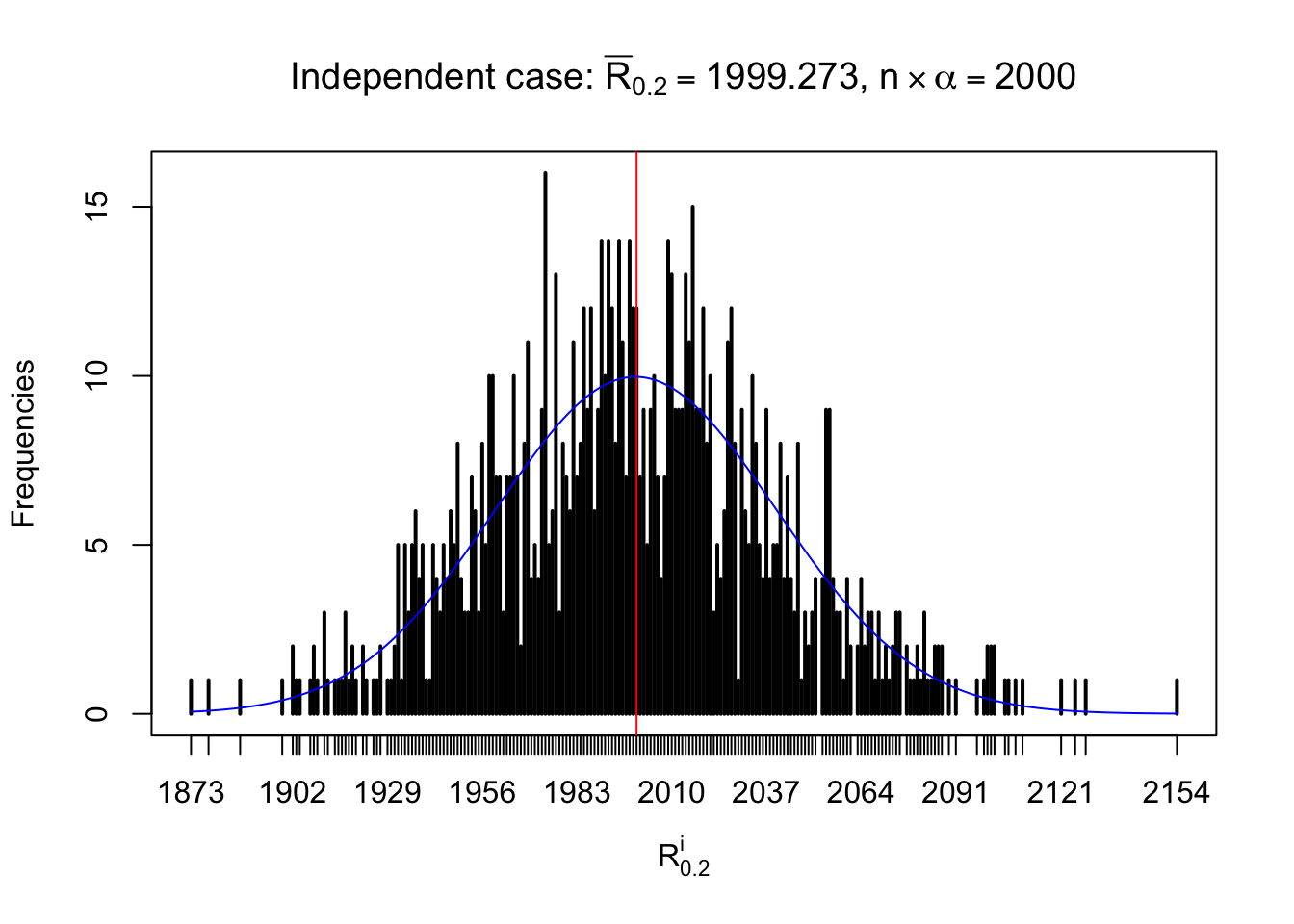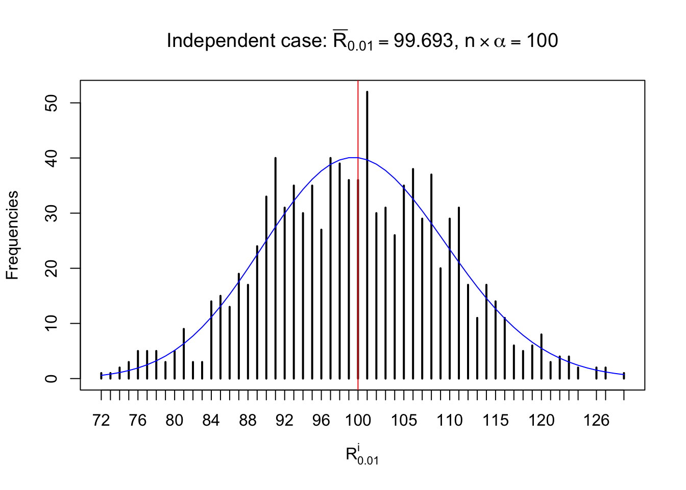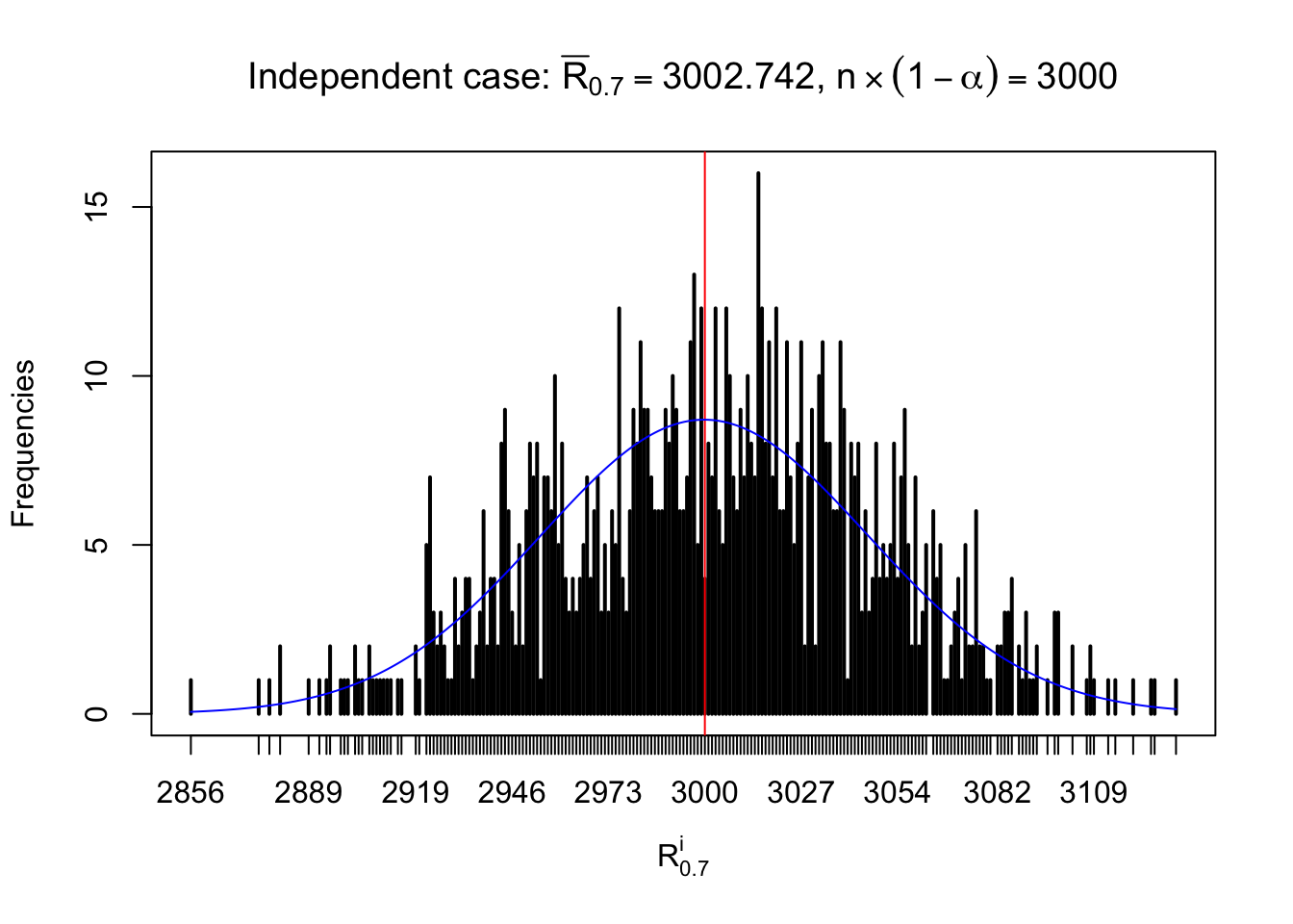Defined this way, \(R_\alpha^i\) should be a sample from \(n \times F_n^{R_i}\left(z_\alpha\right)\) or \(n \times \left(1- F_n^{R_i}\left(z_\alpha\right)\right)\). We can check if \(E\left[F_n\left(z\right)\right] = \Phi\left(z\right)\) by looking at if the average \[ \bar R_\alpha \approx \begin{cases} n\Phi\left(z_\alpha\right) = n\alpha & \alpha \leq 0.5 \\ n\left(1-\Phi\left(z_\alpha\right)\right) = n\left(1 - \alpha\right) & \alpha > 0.5\end{cases} \ . \] We may also compare the frequencies of \(R_\alpha^i\) with their theoretical expected values \(m \times \text{Binomial}\left(n, \alpha\right)\) (in blue) assuming \(z_{ij}\) are independent.