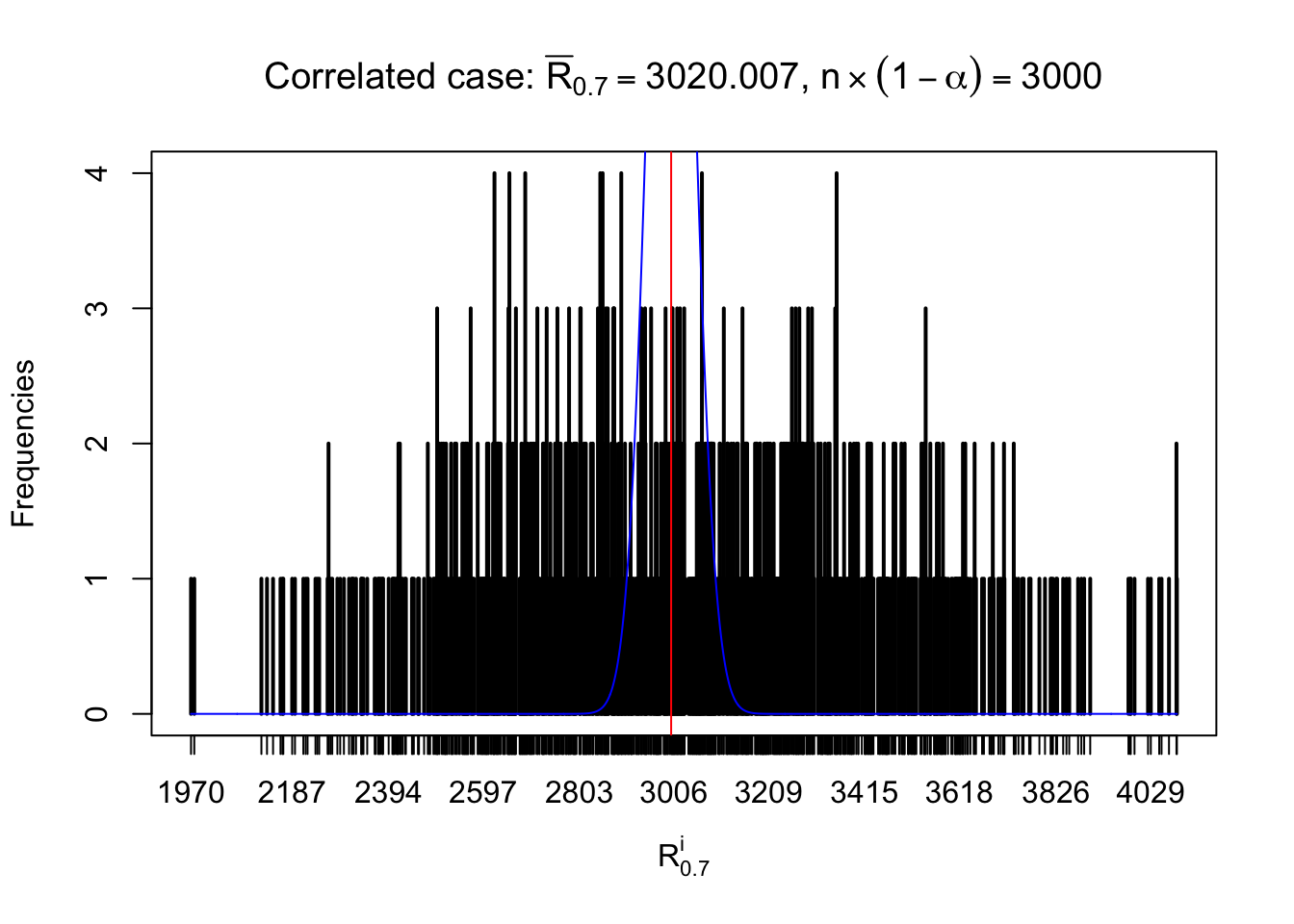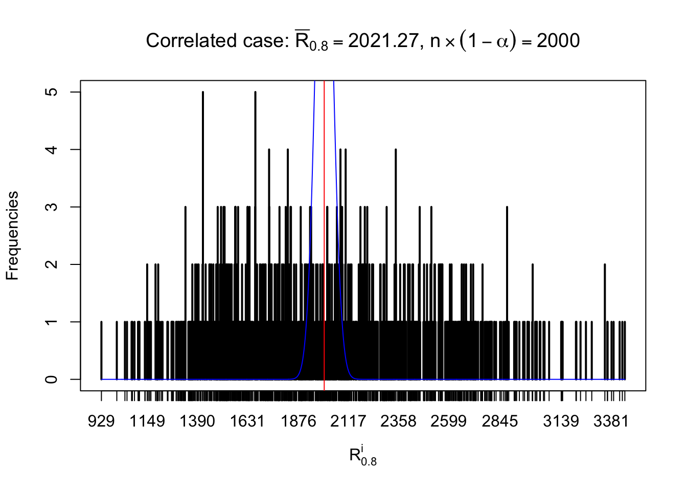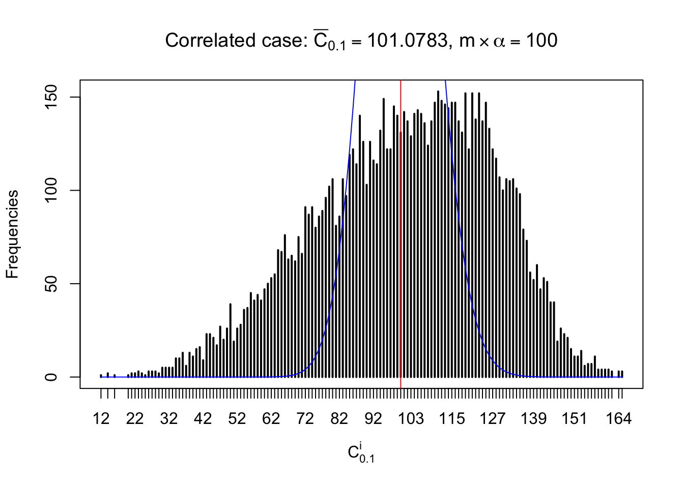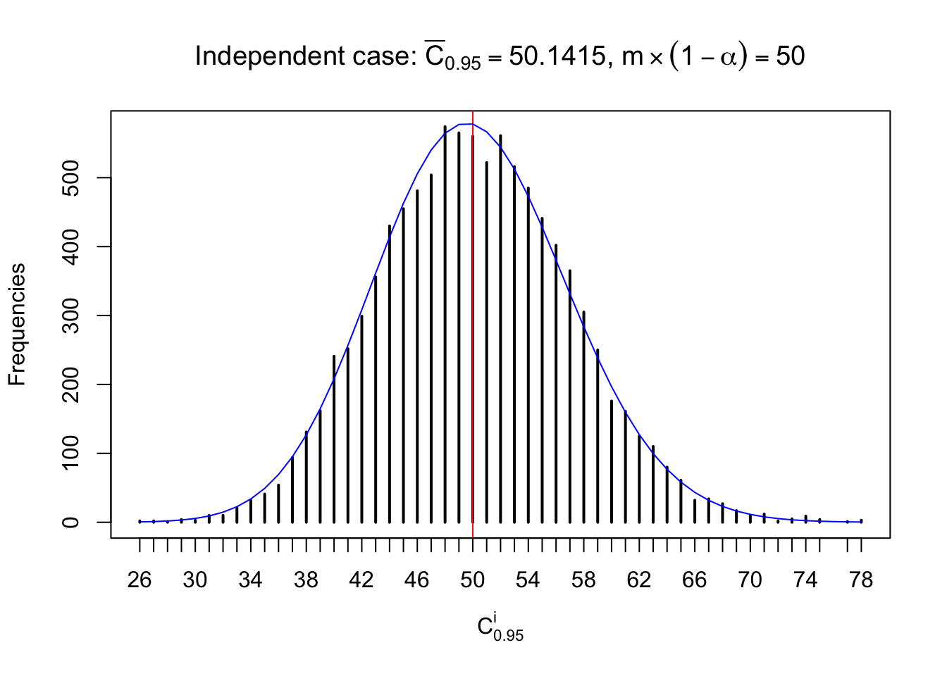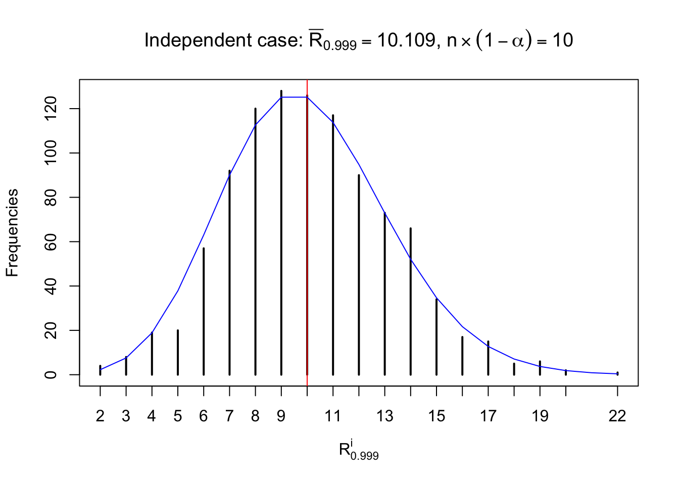 Defined this way, \(R_\alpha^i\) should be a sample from \(n \times F_n^{R_i}\left(z_\alpha\right)\) or \(n \times \left(1- F_n^{R_i}\left(z_\alpha\right)\right)\). We can check if \(E\left[F_n\left(z\right)\right] = \Phi\left(z\right)\) by looking at if the average \[ \bar R_\alpha \approx \begin{cases} n\Phi\left(z_\alpha\right) = n\alpha & \alpha \leq 0.5 \\ n\left(1-\Phi\left(z_\alpha\right)\right) = n\left(1 - \alpha\right) & \alpha > 0.5\end{cases} \ . \] We may also compare the frequencies of \(R_\alpha^i\) with their theoretical expected values \(m \times \text{Binomial}\left(n, \alpha\right)\) (in blue) assuming \(z_{ij}\) are independent.