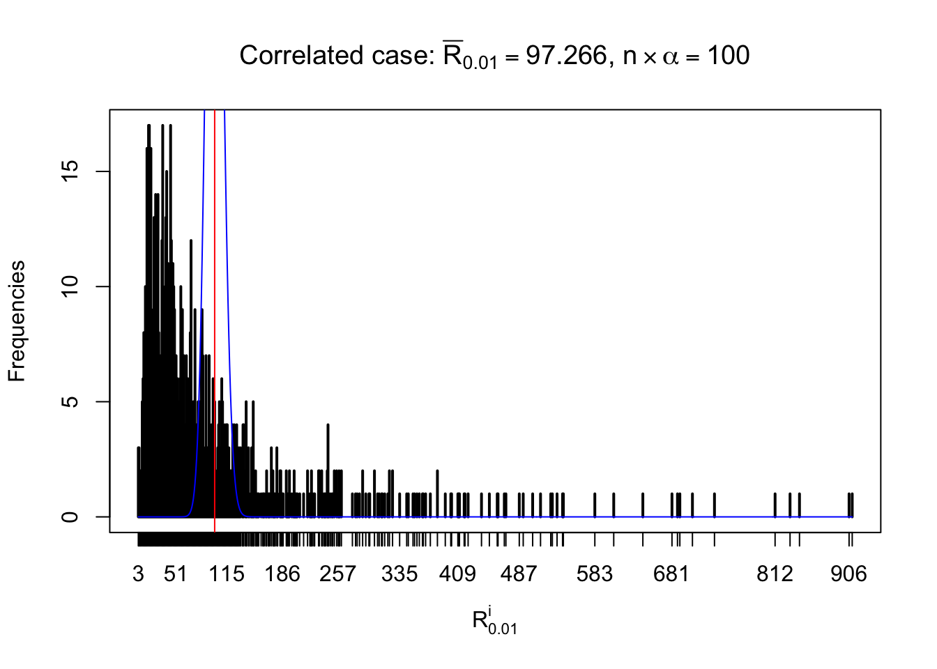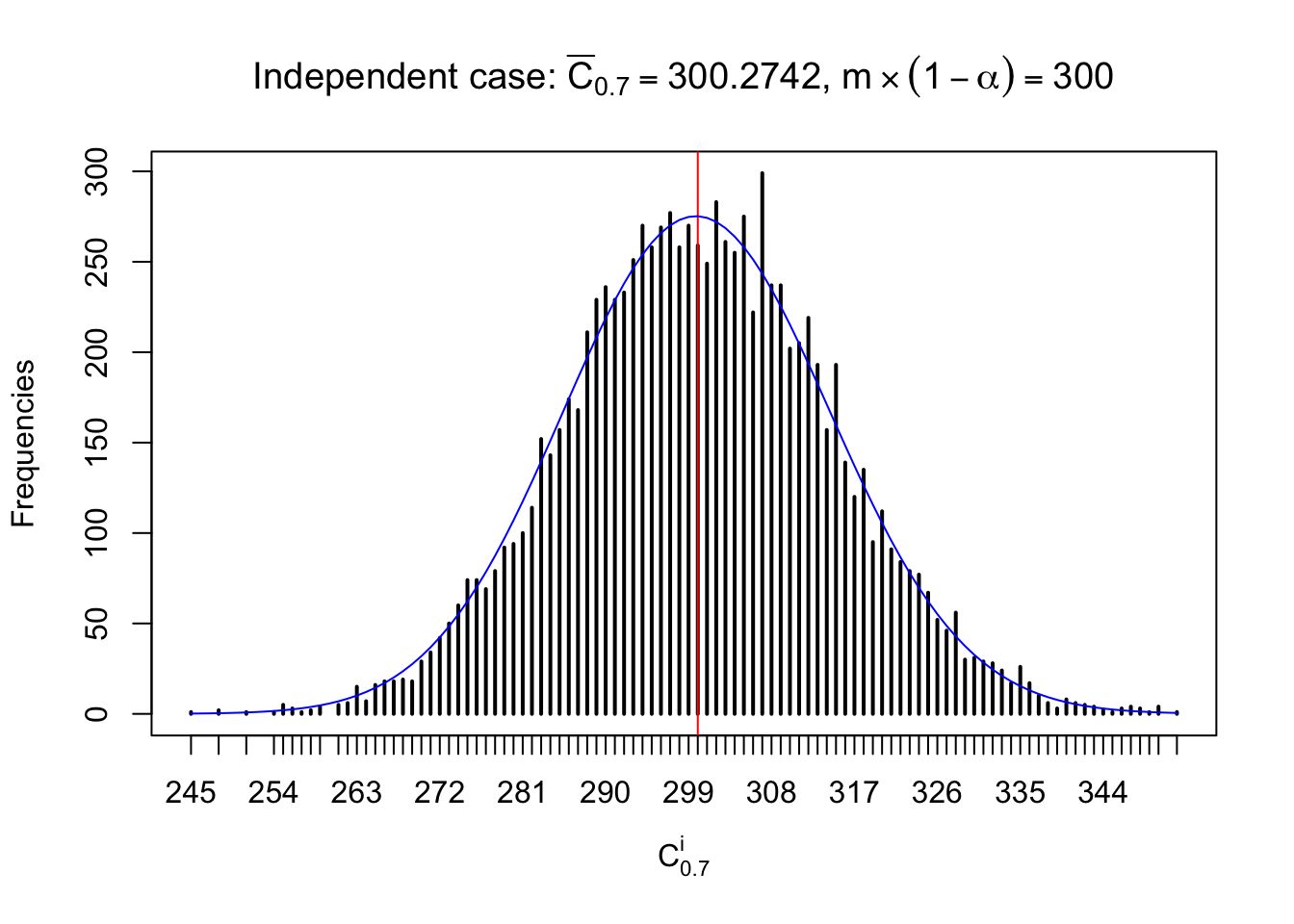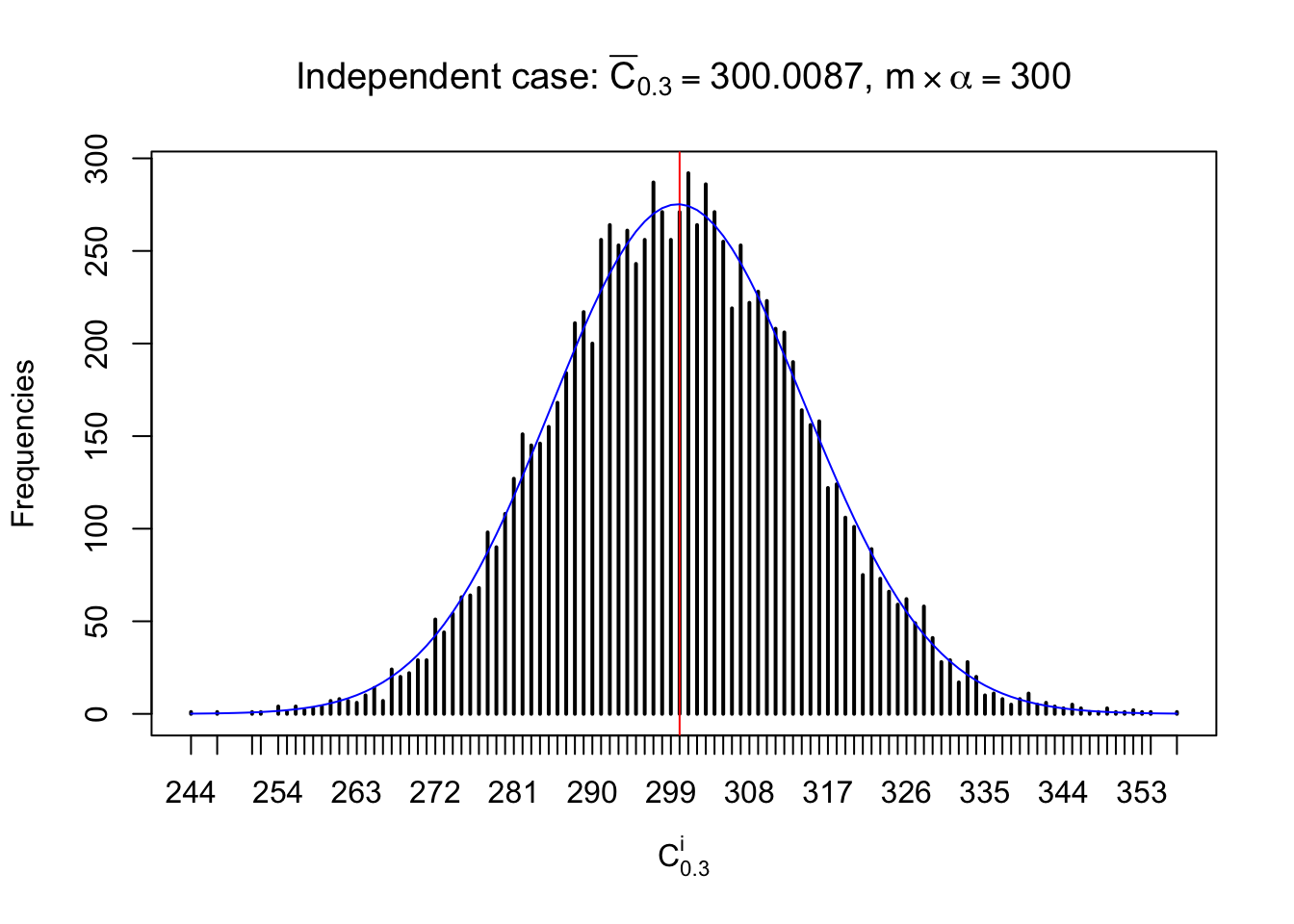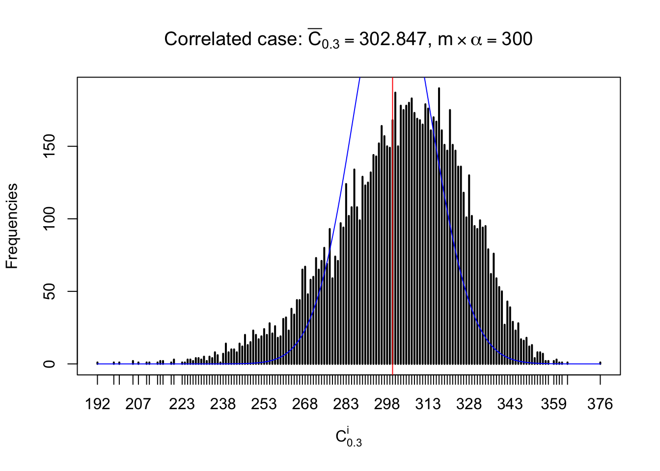Defined this way, \(R_\alpha^i\) should be a sample from \(n \times F_n^{R_i}\left(z_\alpha\right)\) or \(n \times \left(1- F_n^{R_i}\left(z_\alpha\right)\right)\). We can check if \(E\left[F_n\left(z\right)\right] = \Phi\left(z\right)\) by looking at if the average \[ \bar R_\alpha \approx \begin{cases} n\Phi\left(z_\alpha\right) = n\alpha & \alpha \leq 0.5 \\ n\left(1-\Phi\left(z_\alpha\right)\right) = n\left(1 - \alpha\right) & \alpha > 0.5\end{cases} \ . \] We may also compare the frequencies of \(R_\alpha^i\) with their theoretical expected values \(m \times \text{Binomial}\left(n, \alpha\right)\) (in blue) assuming \(z_{ij}\) are independent.