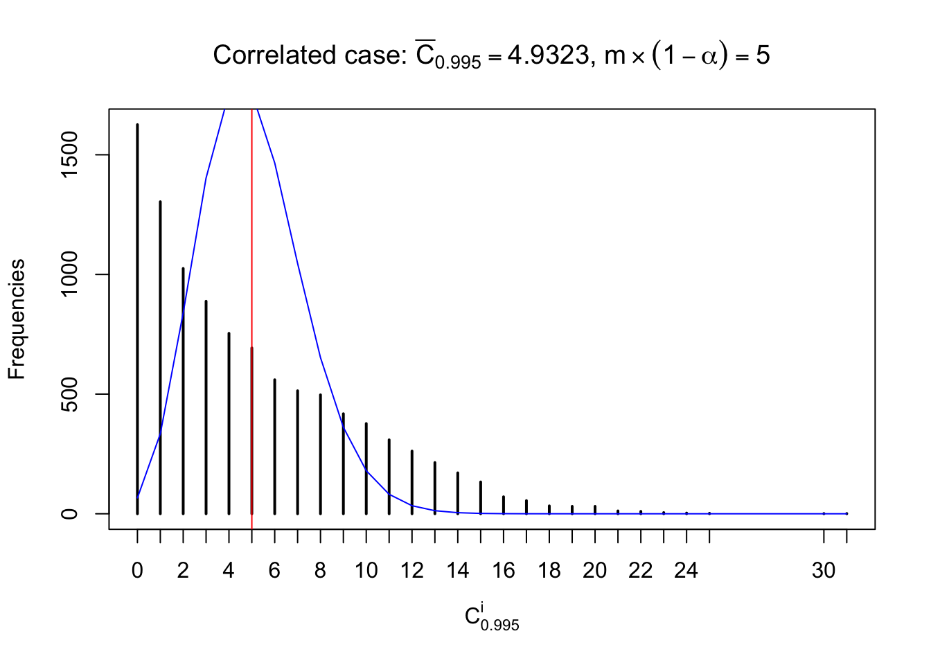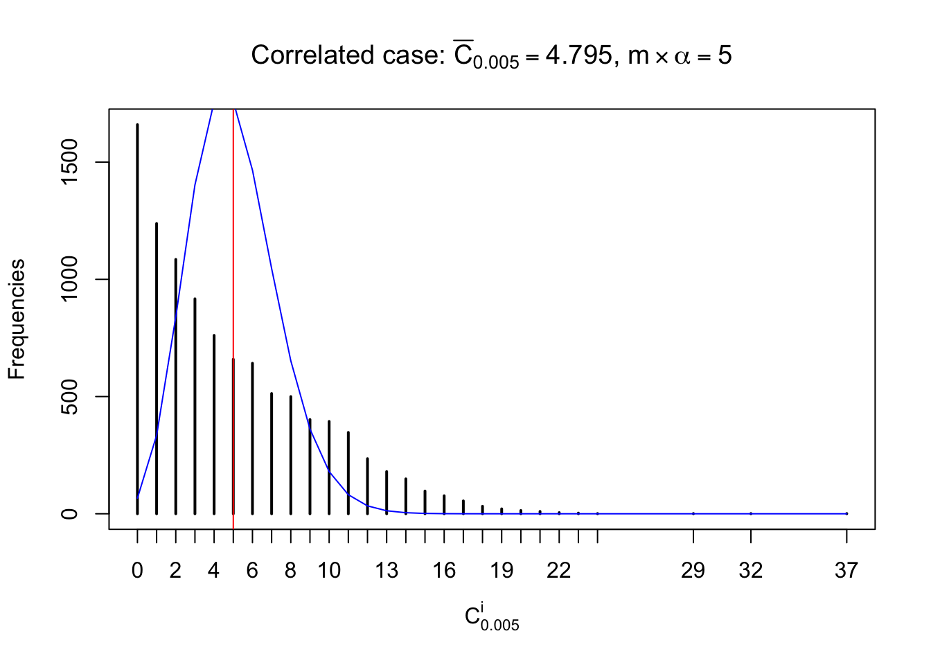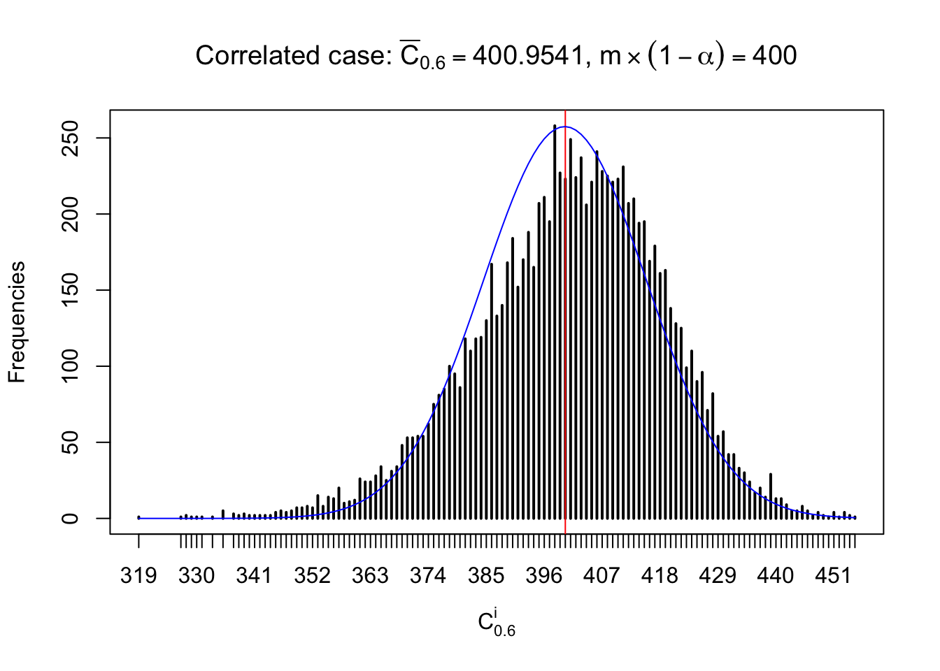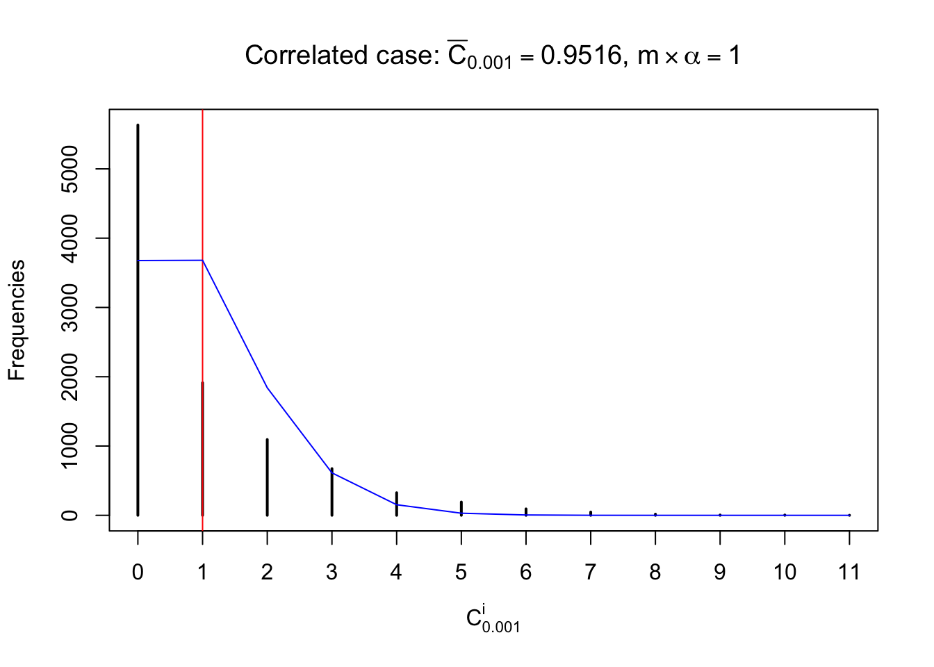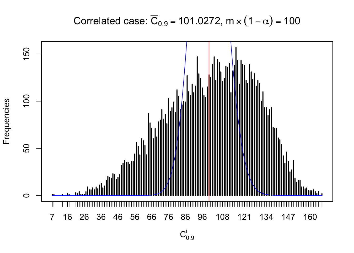 Defined this way, \(R_\alpha^i\) should be a sample from \(n \times F_n^{R_i}\left(z_\alpha\right)\) or \(n \times \left(1- F_n^{R_i}\left(z_\alpha\right)\right)\). We can check if \(E\left[F_n\left(z\right)\right] = \Phi\left(z\right)\) by looking at if the average \[ \bar R_\alpha \approx \begin{cases} n\Phi\left(z_\alpha\right) = n\alpha & \alpha \leq 0.5 \\ n\left(1-\Phi\left(z_\alpha\right)\right) = n\left(1 - \alpha\right) & \alpha > 0.5\end{cases} \ . \] We may also compare the frequencies of \(R_\alpha^i\) with their theoretical expected values \(m \times \text{Binomial}\left(n, \alpha\right)\) (in blue) assuming \(z_{ij}\) are independent.