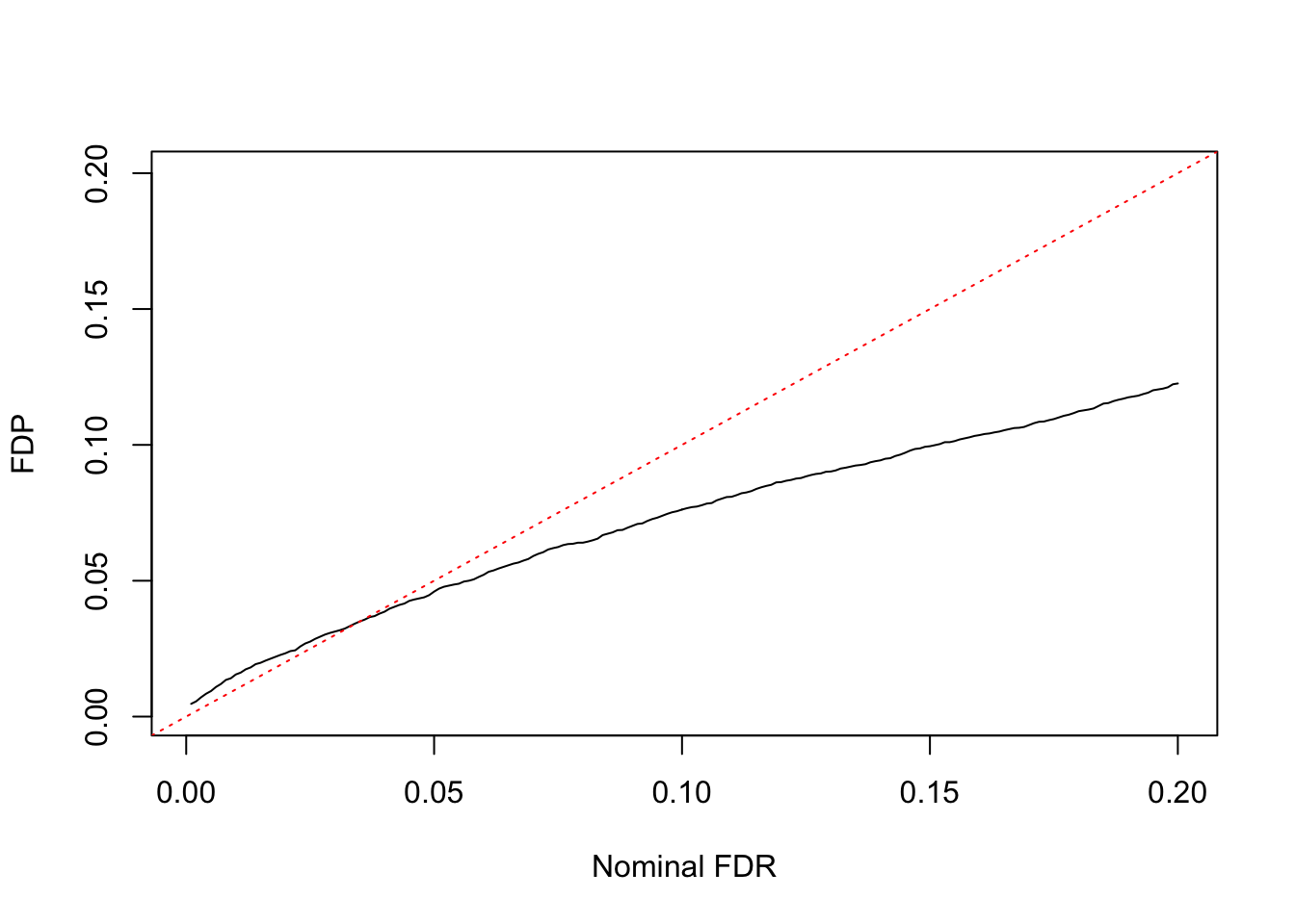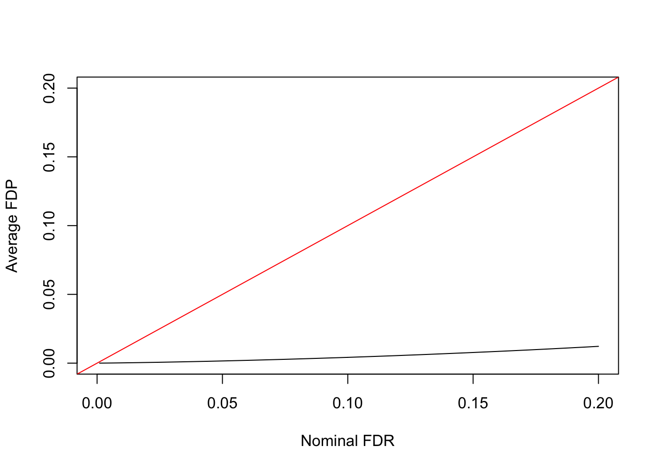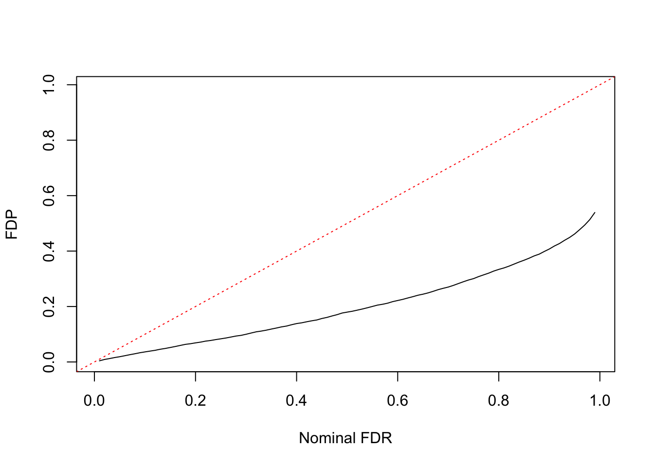 plot(q.cutoff, fdp.avg, type = "l", xlim = range(q.cutoff, fdp.avg), ylim = range(q.cutoff, fdp.avg), xlab = "Nominal FDR", ylab = "Average FDP")