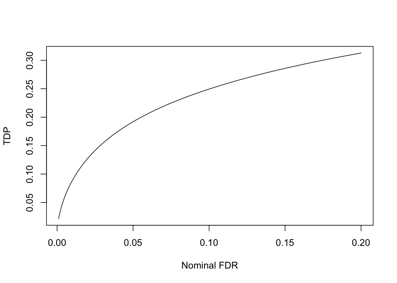 plot(q.cutoff, tdp.avg, type = "l", xlab = "Nominal FDR", ylab = "TDP")