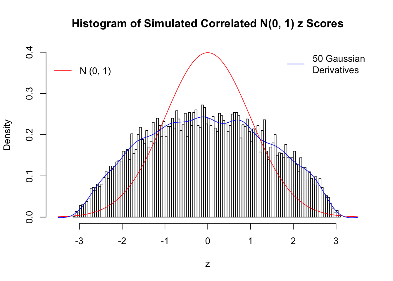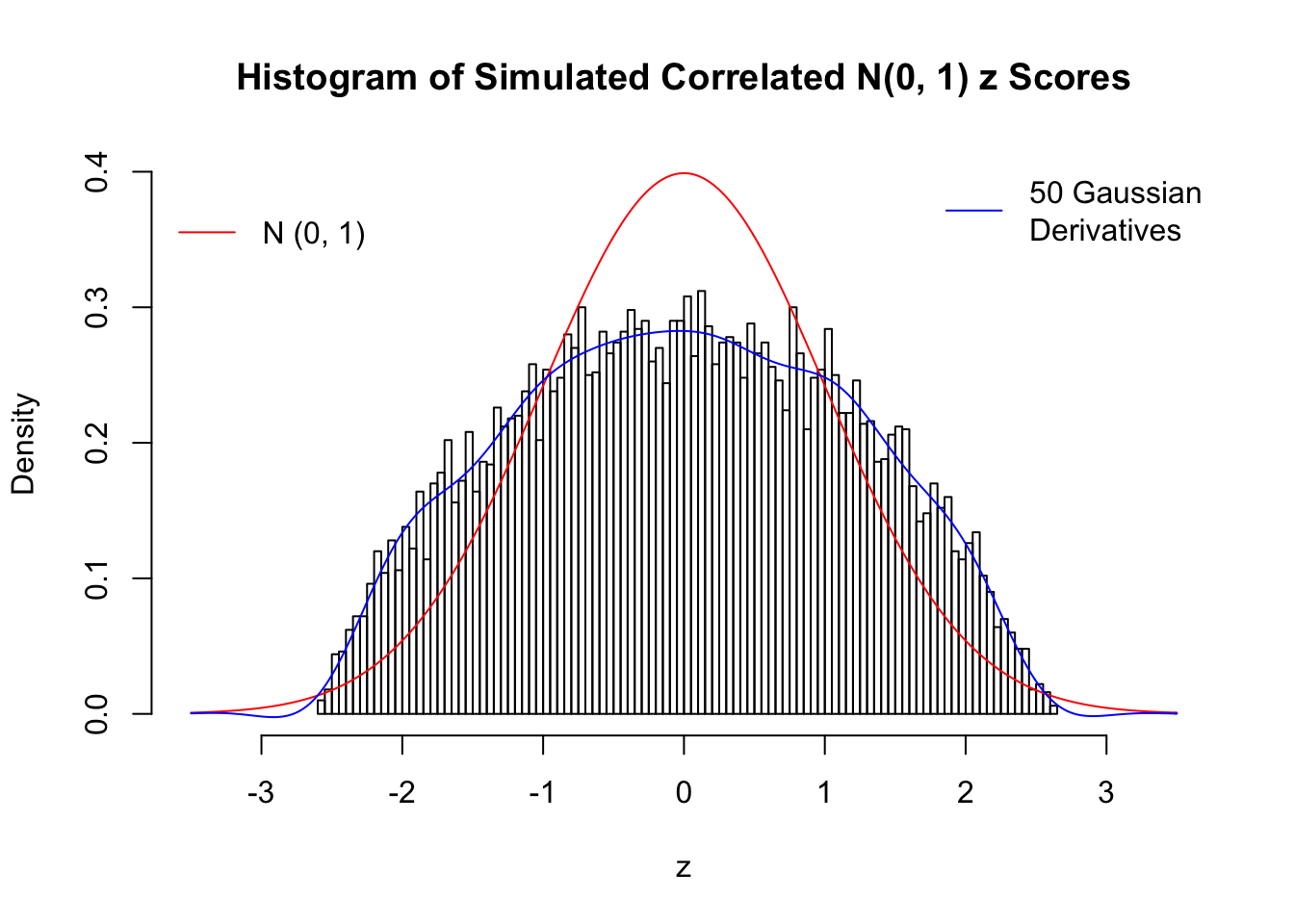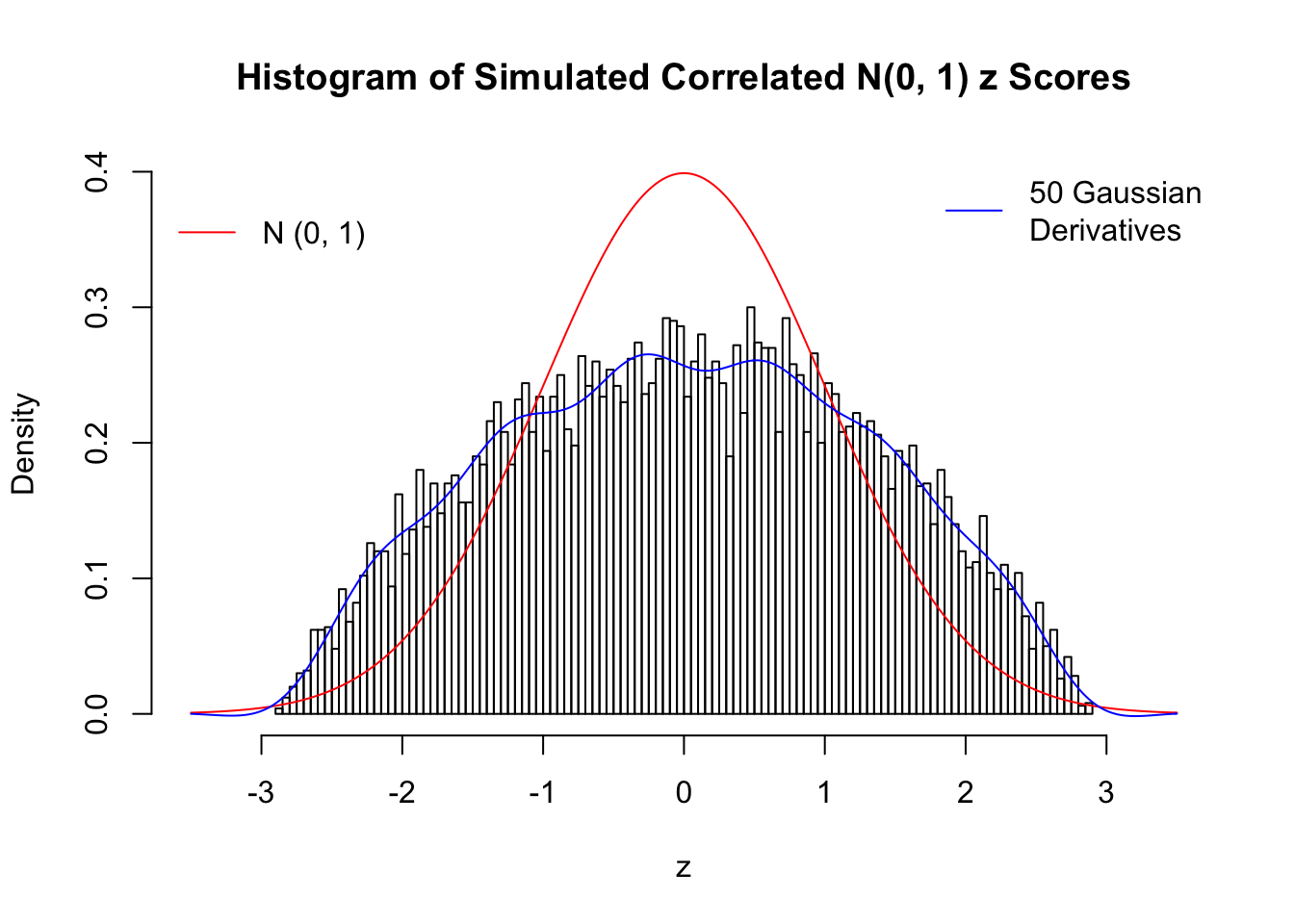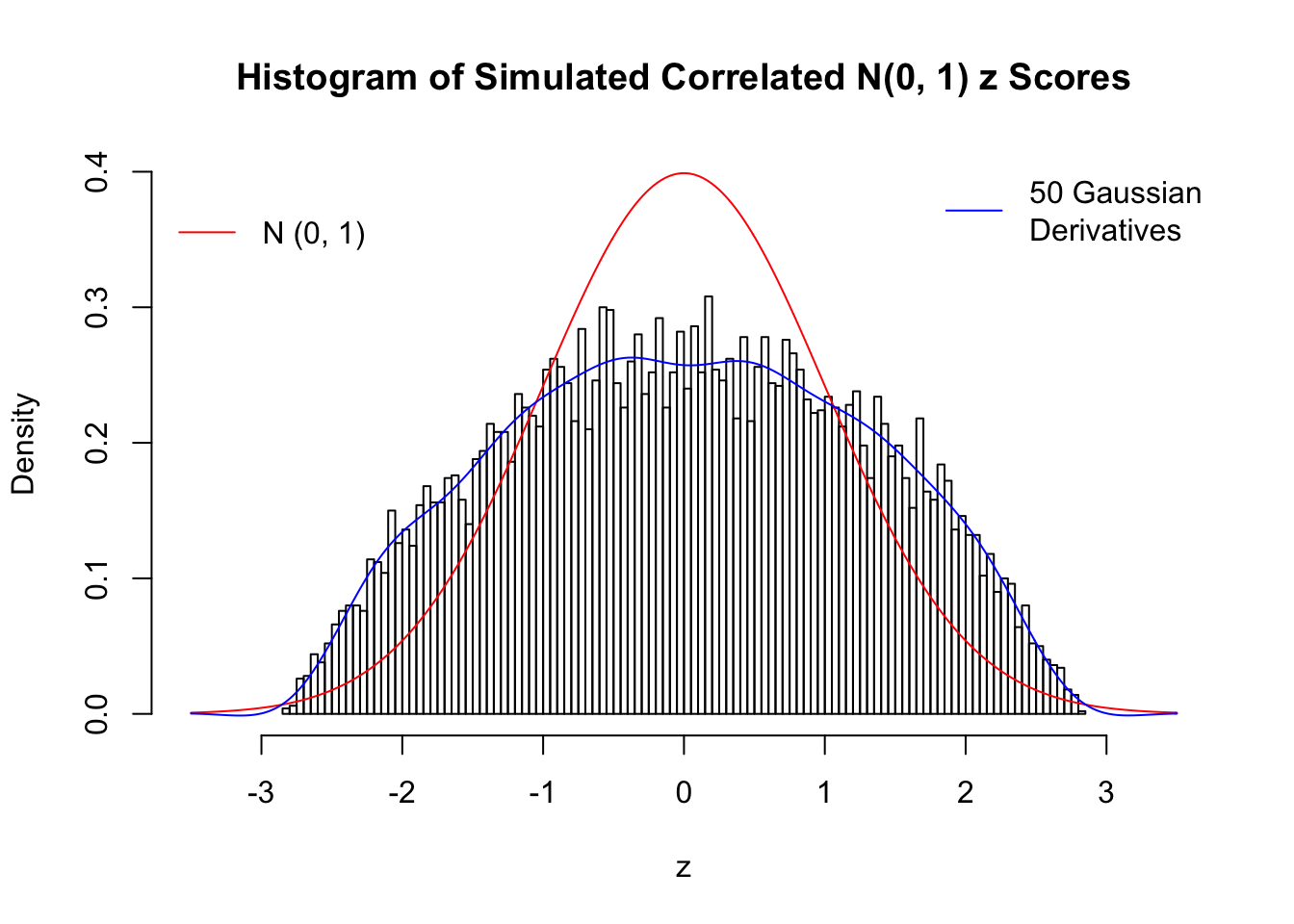 Following Gao’s suggestion, we investigate whether Gaussian derivatives can fit the empirical distributions of purely synthetic correlated \(z\) scores simulated as follows.