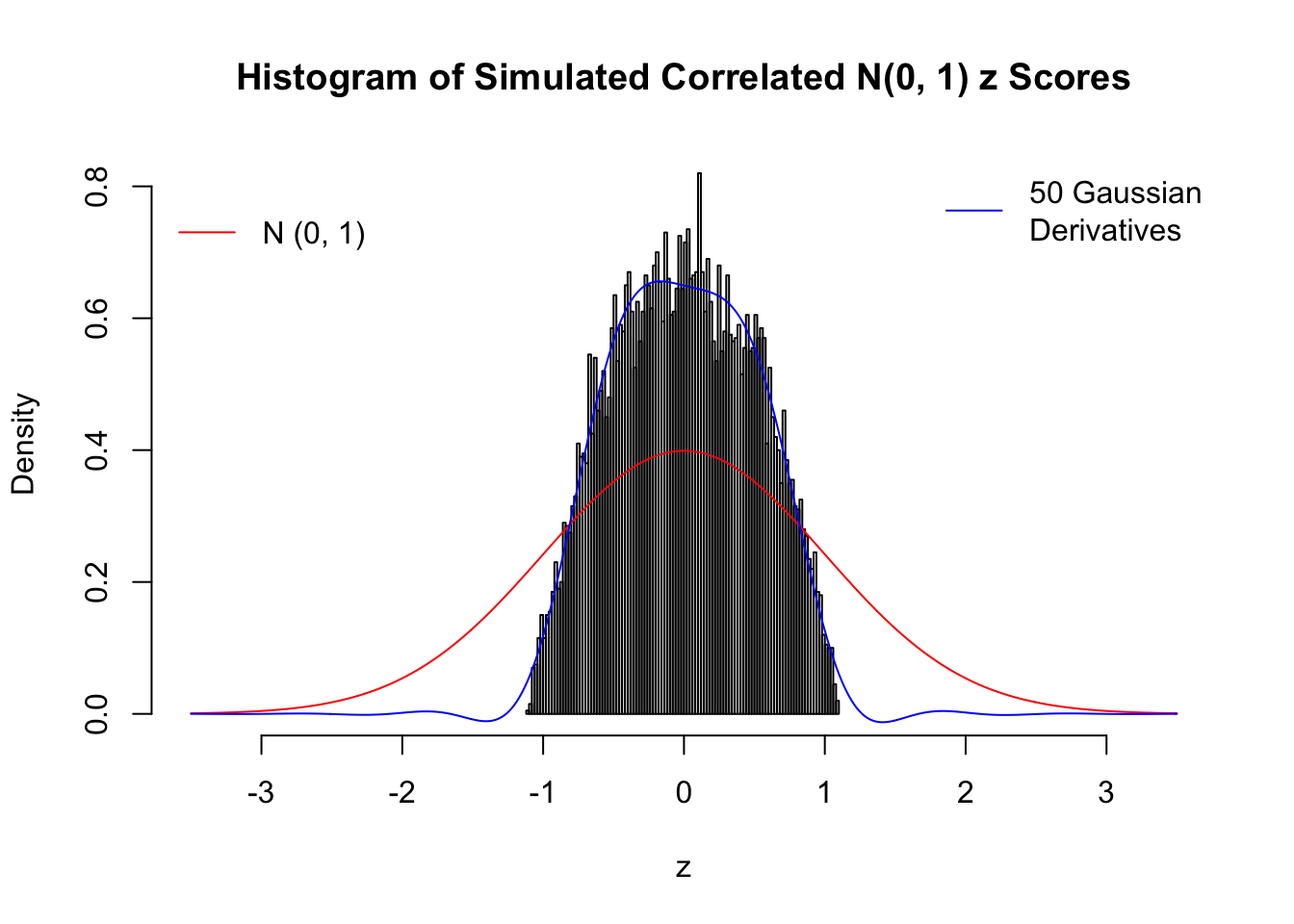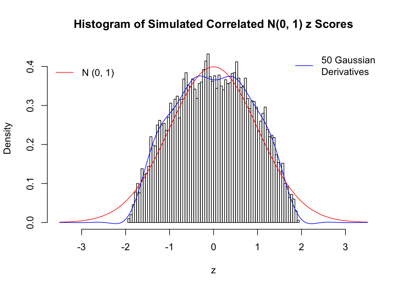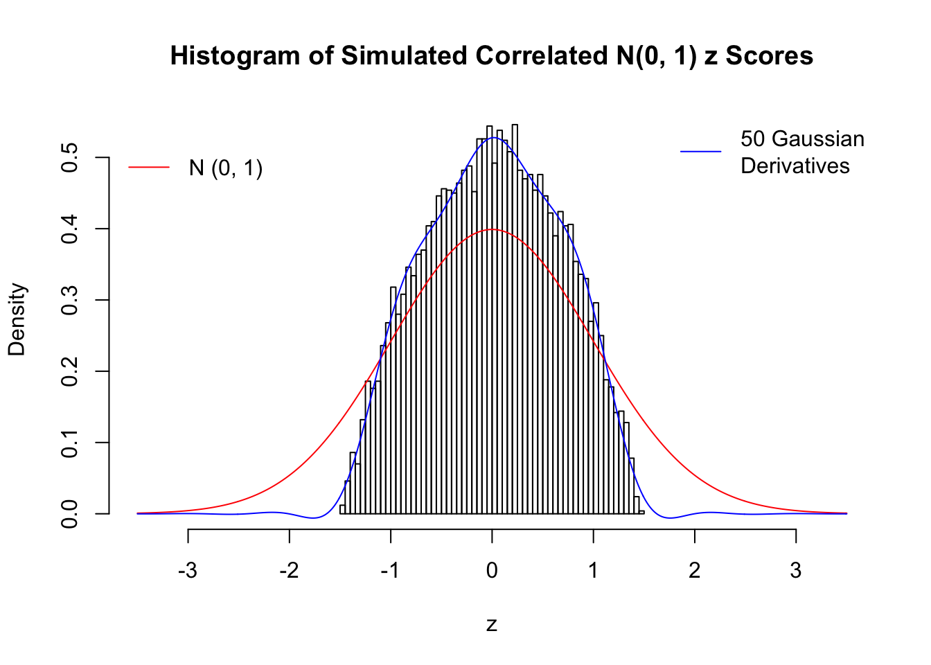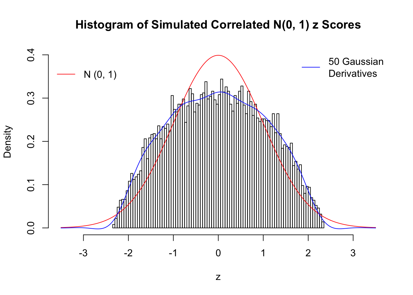 Following Gao’s suggestion, we investigate whether Gaussian derivatives can fit the empirical distributions of purely synthetic correlated \(z\) scores simulated as follows.