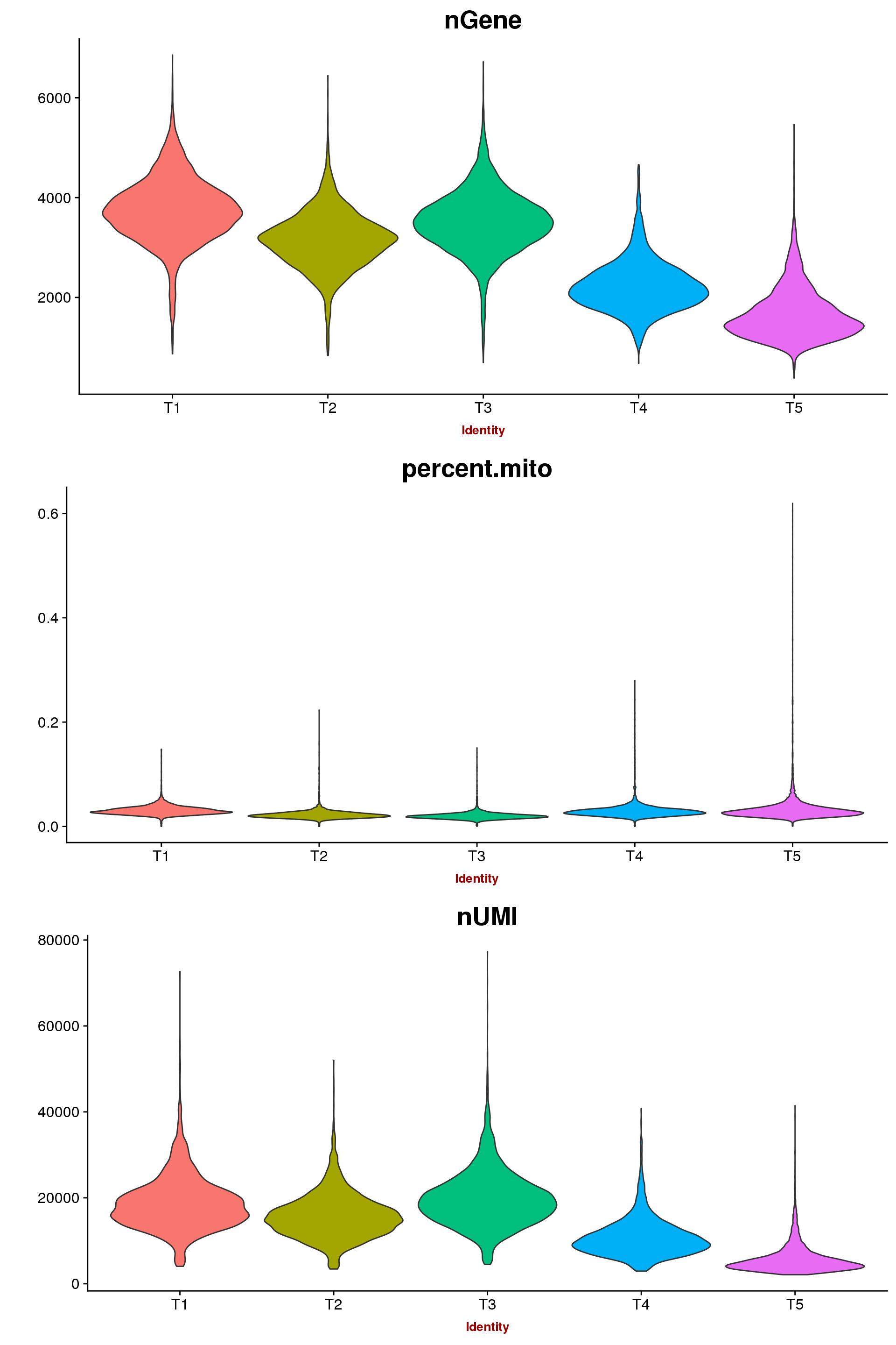 VlnPlot(seurobj, c("nGene", "percent.mito", "nUMI"), group.by='timepoint', nCol = 1, point.size.use=-1, size.x.use = 10)