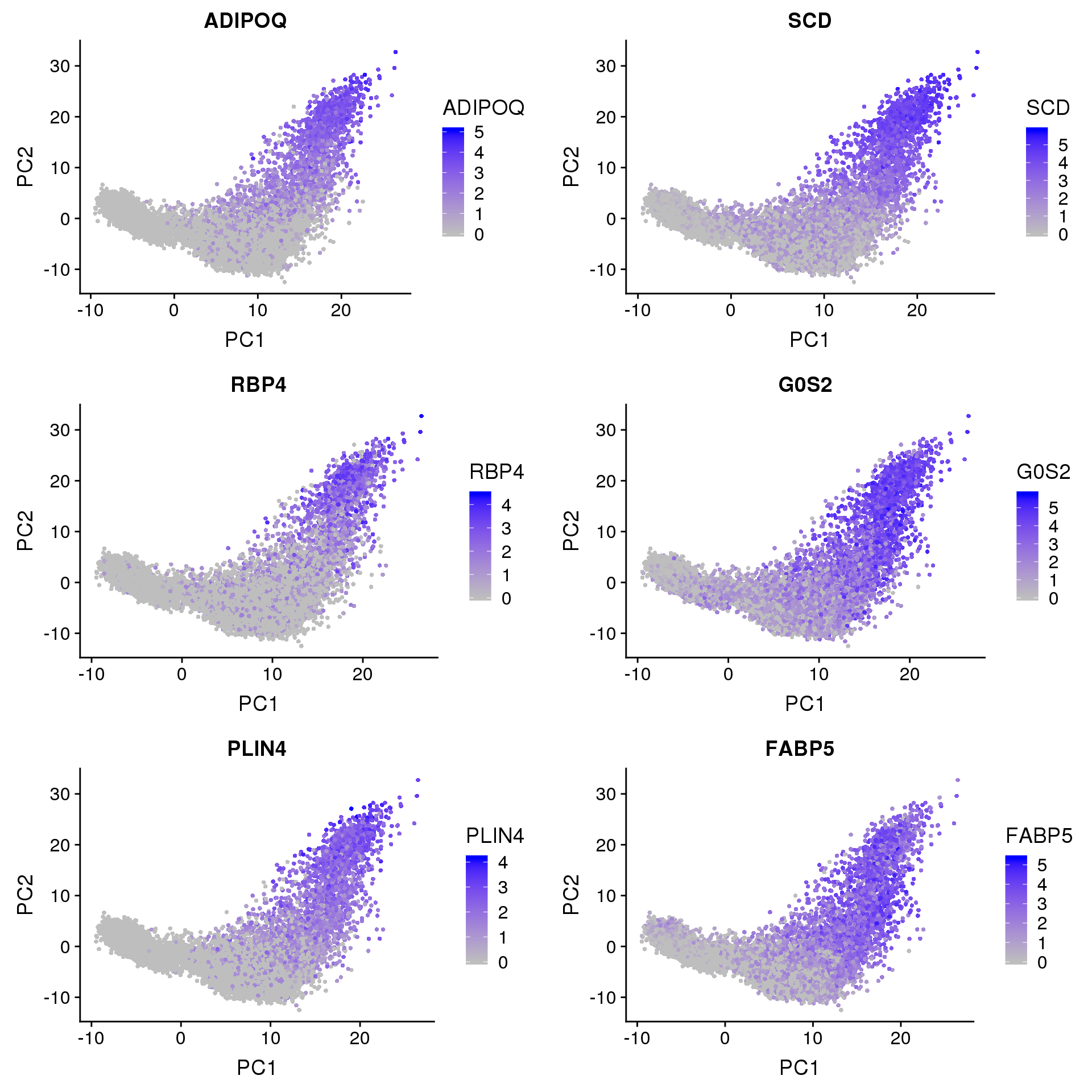 FeaturePlot(seurobj, reduction.use='pca', features.plot=c('ADIPOQ', 'SCD', 'RBP4', 'G0S2', 'PLIN4', 'FABP5'), pt.size=1, cols.use=c('gray', 'blue'), no.legend=F, nCol=2)