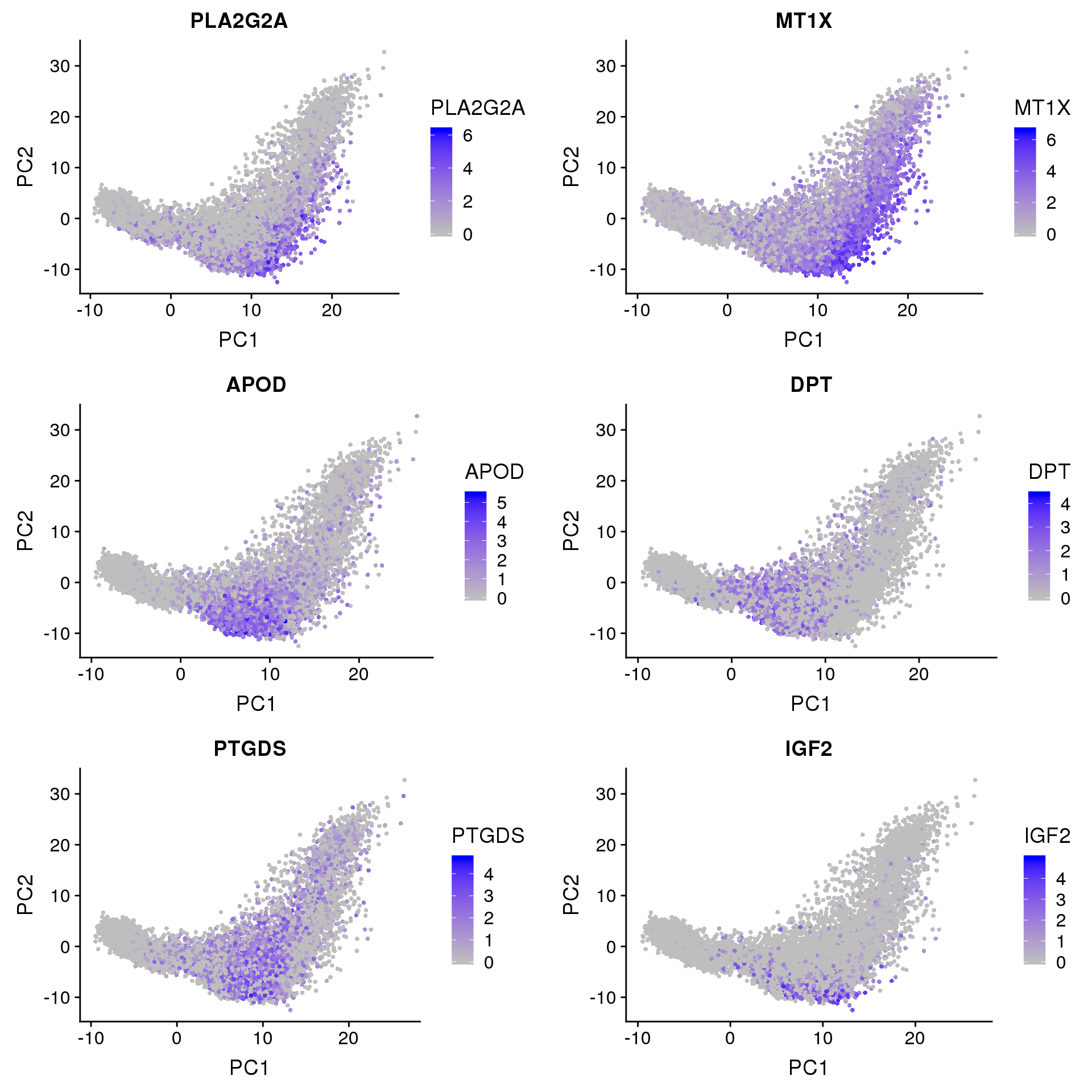 FeaturePlot(seurobj, reduction.use='pca', features.plot=c('PLA2G2A', 'MT1X', 'APOD', 'DPT', 'PTGDS', 'IGF2'), pt.size=1, cols.use=c('gray', 'blue'), no.legend=F, nCol=2)