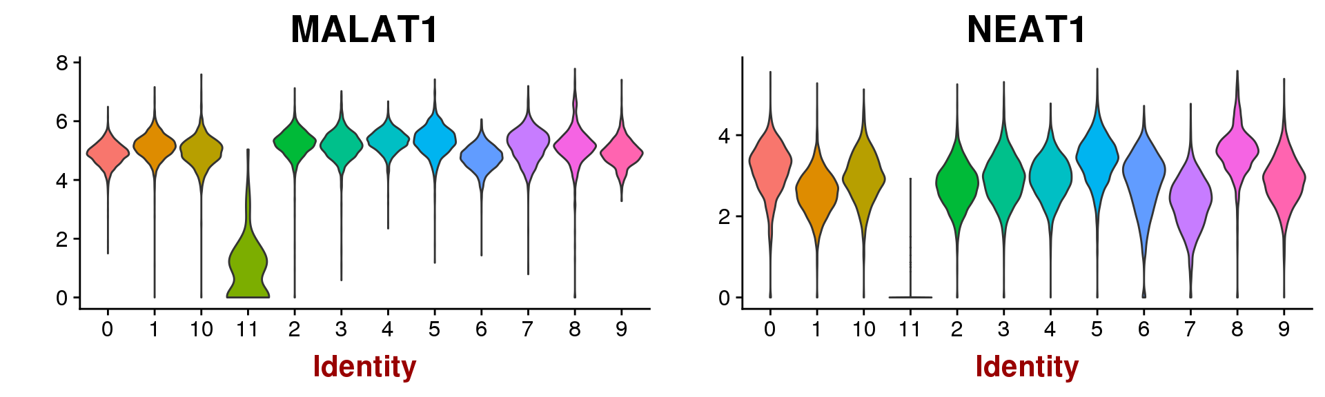 VlnPlot(seurobj, group.by='res.0.5', features.plot=c('MALAT1', 'NEAT1'), point.size.use=-1)