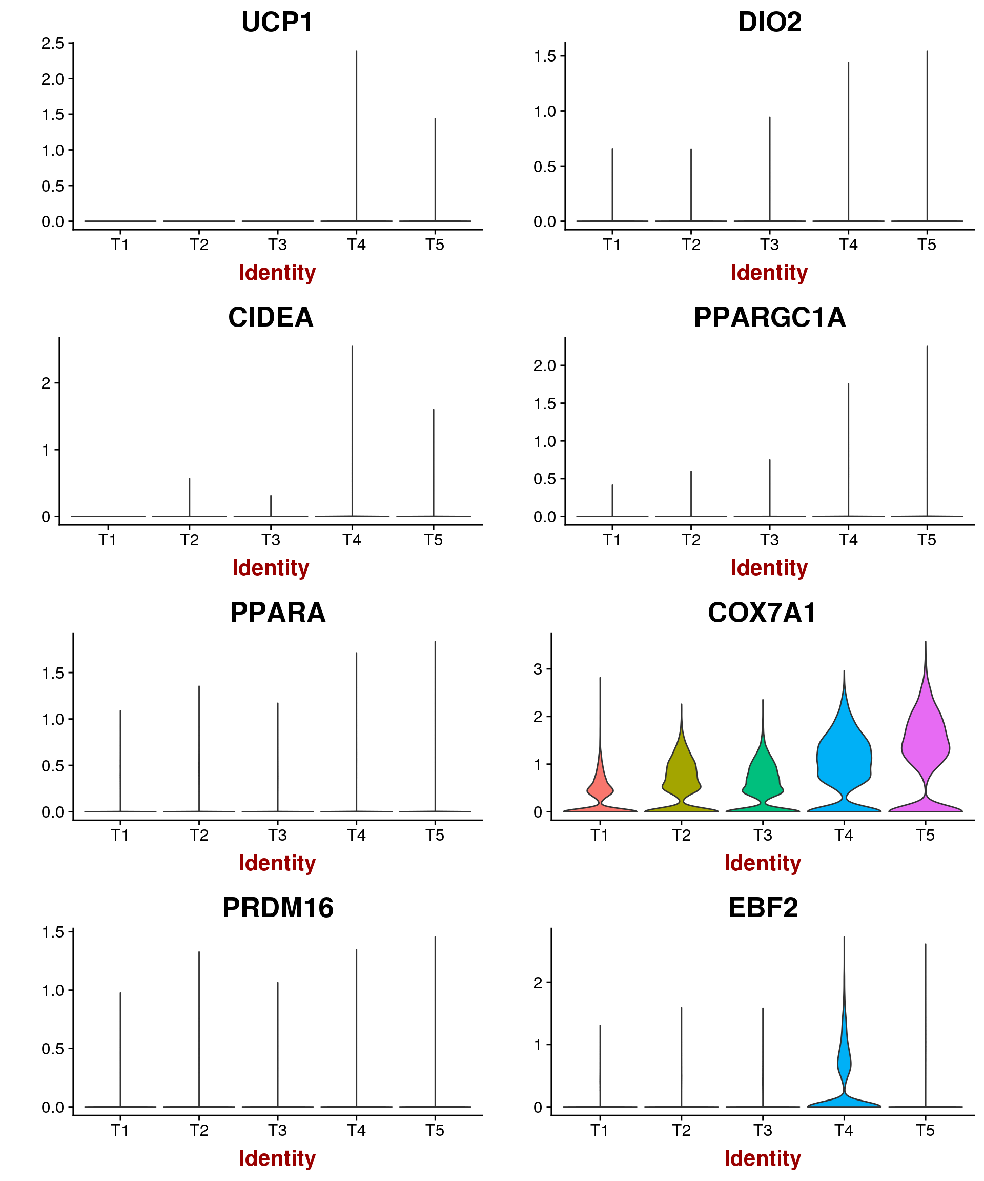 VlnPlot(seurobj, features.plot=c('UCP1', 'DIO2', 'CIDEA', 'PPARGC1A', 'PPARA', 'COX7A1', 'PRDM16', 'EBF2'), group.by='timepoint', point.size.use = -1, nCol=2)