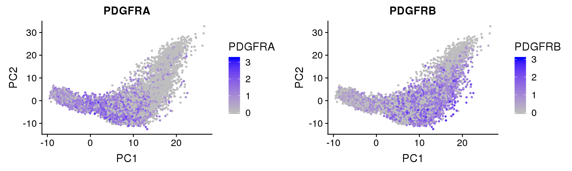 FeaturePlot(seurobj, reduction.use='pca', features.plot=c('PDGFRA', 'PDGFRB'), pt.size=1, cols.use=c('gray', 'blue'), no.legend=F, nCol=2)