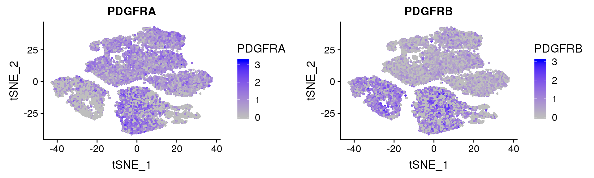 FeaturePlot(seurobj, reduction.use='tsne', features.plot=c('PDGFRA', 'PDGFRB'), pt.size=1, cols.use=c('gray', 'blue'), no.legend=F, nCol=2)